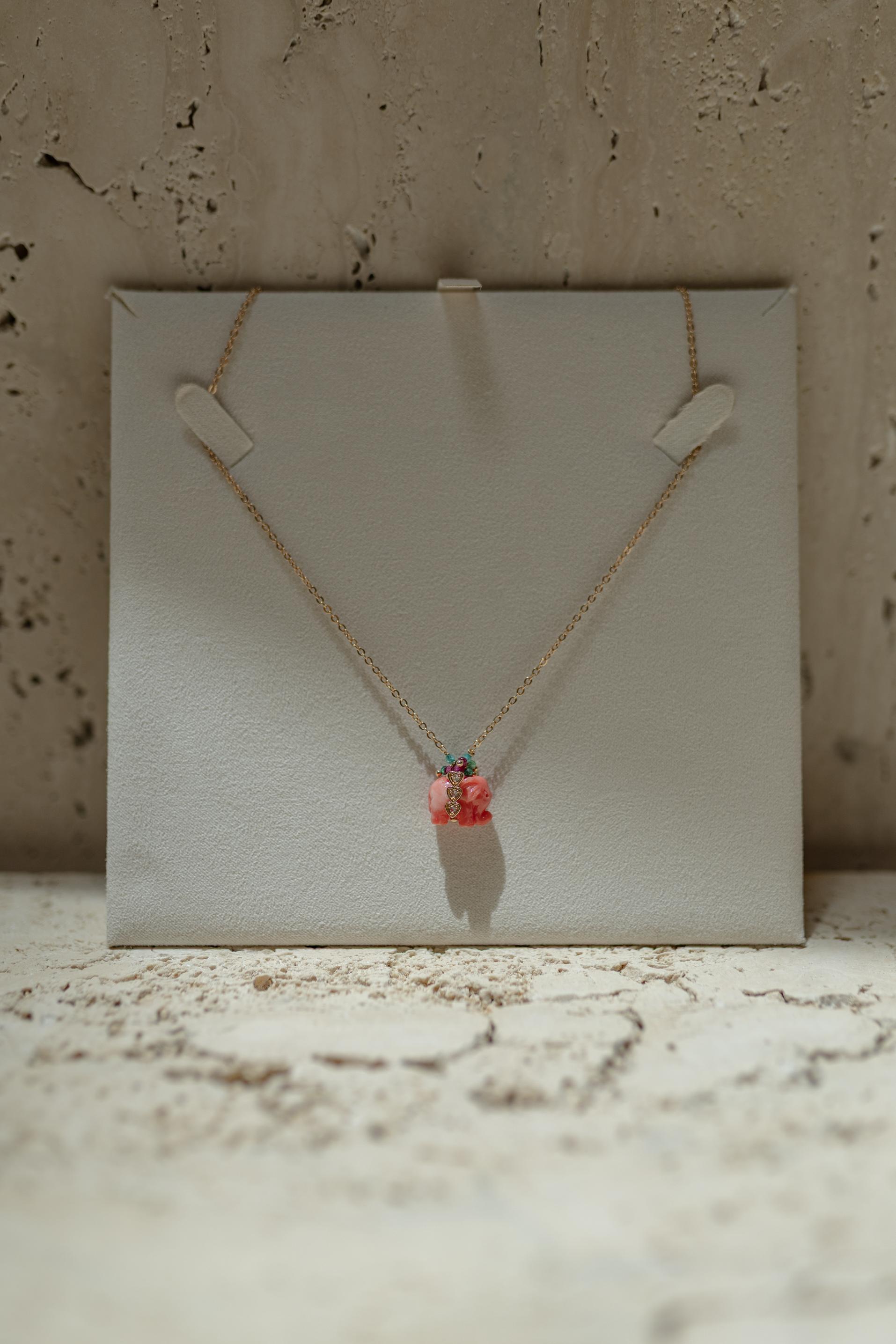 Colar de elefante em baquelite coral no banho de ouro 18k.
