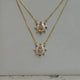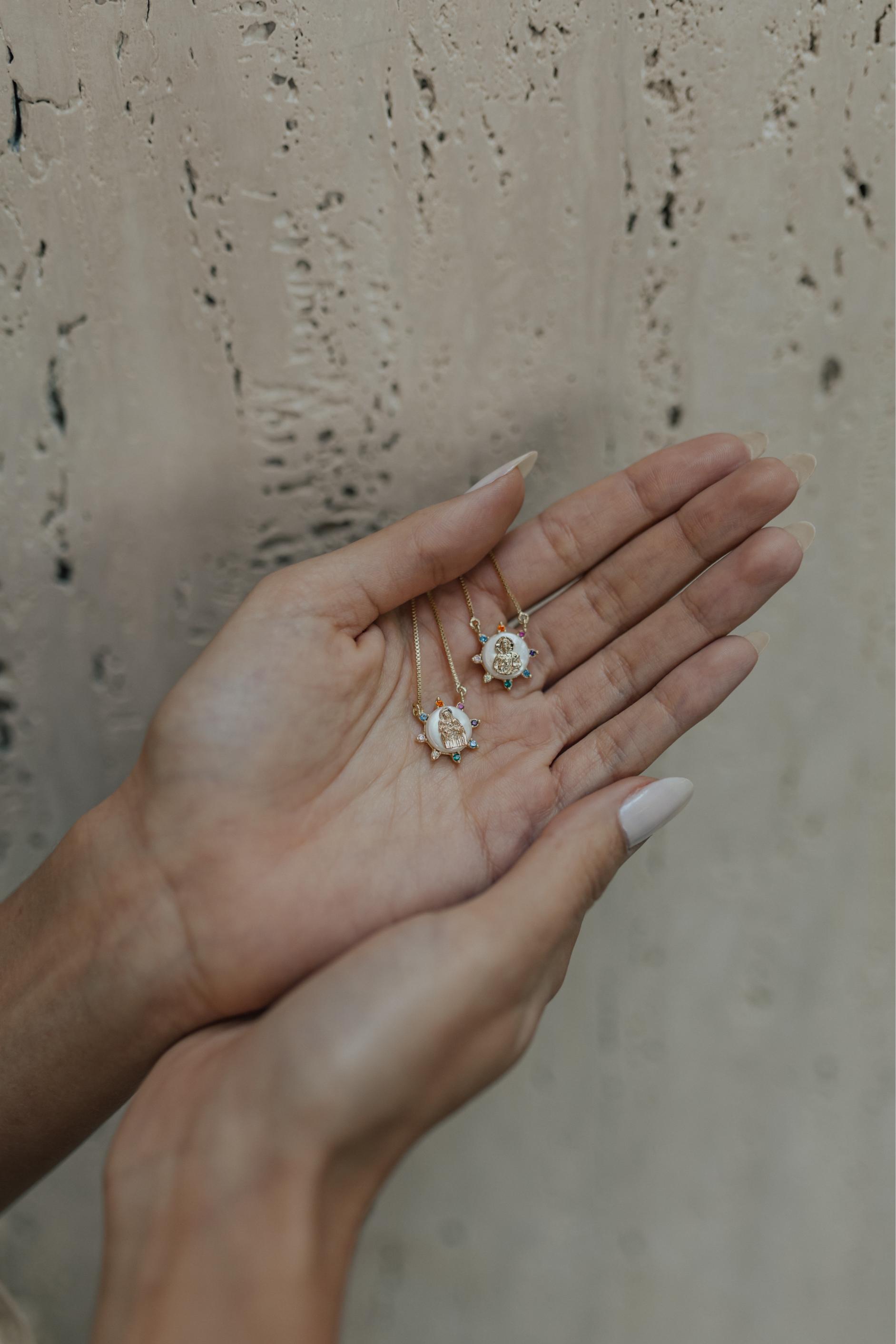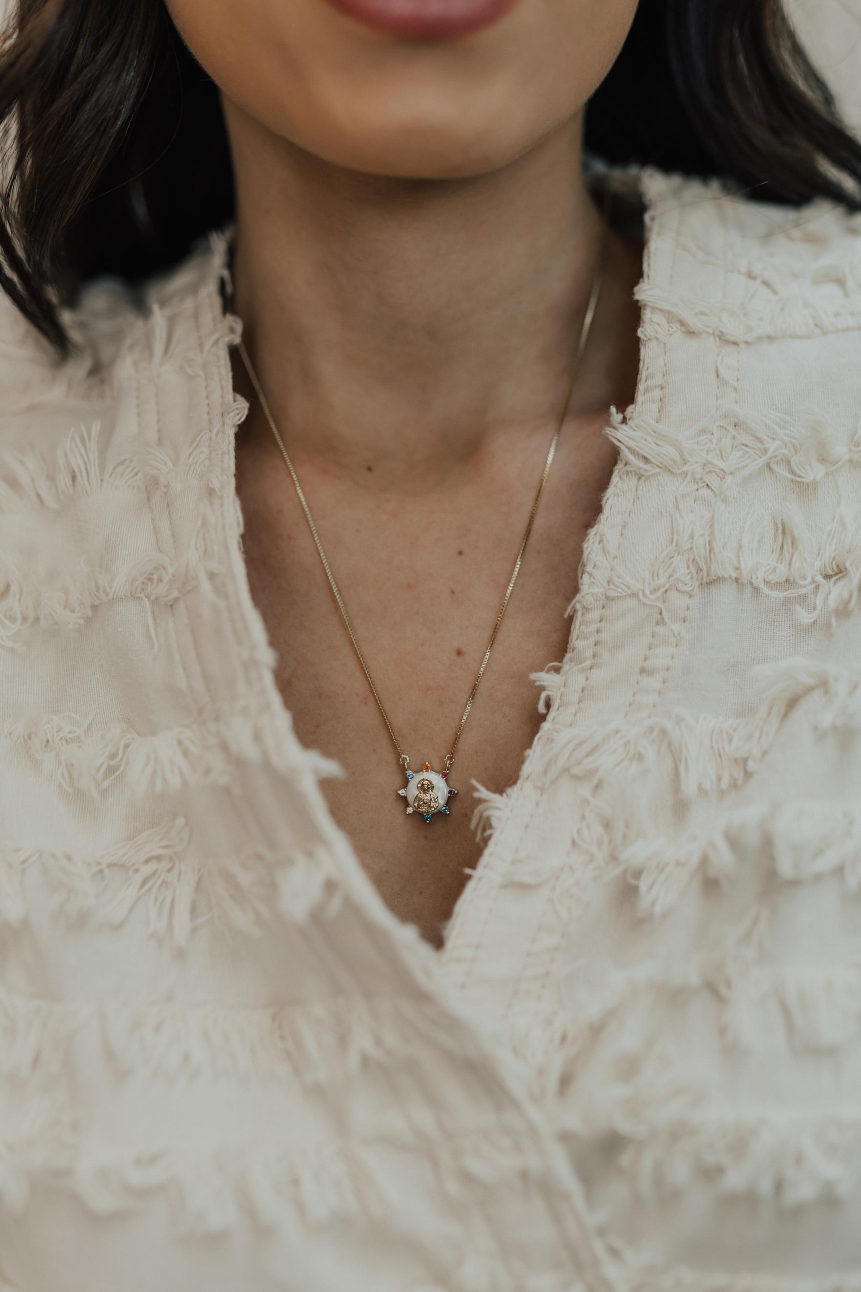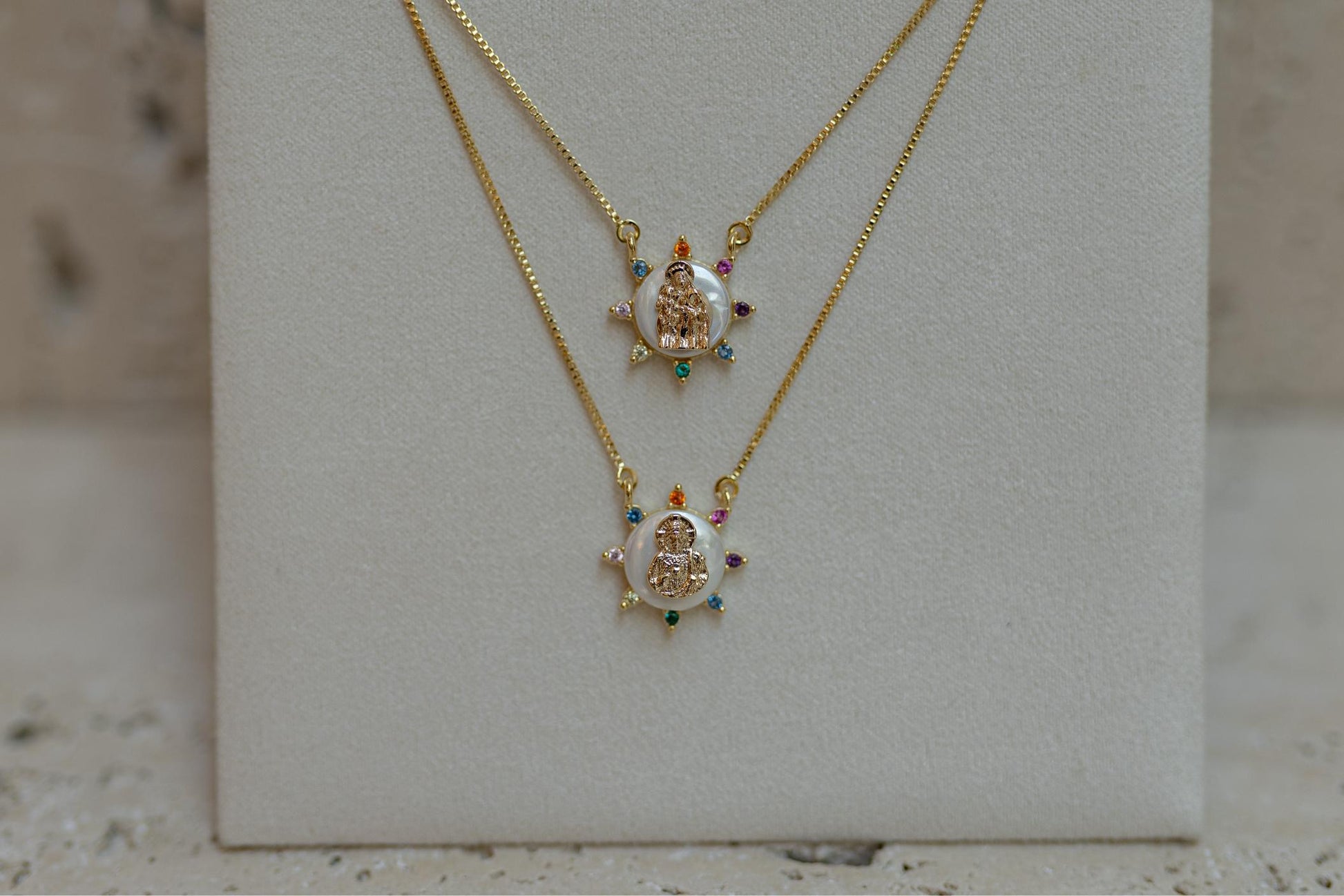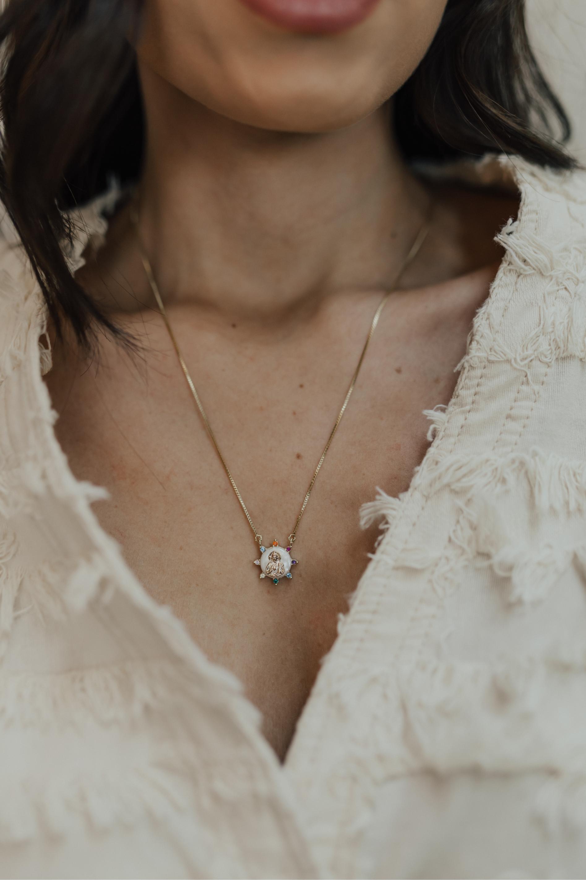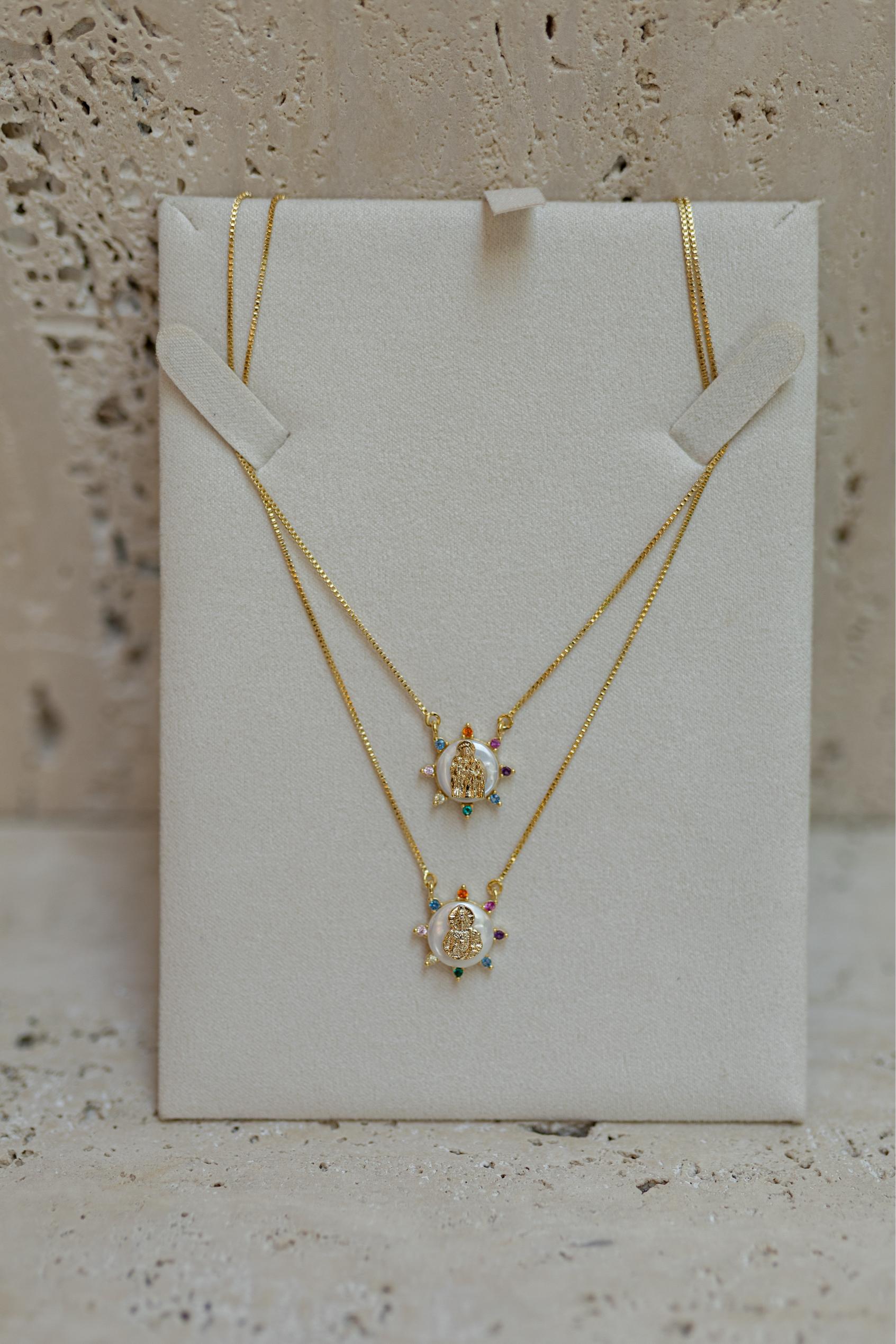 Colar escapulário com madrepérola e zircônias coloridas no banho de ouro 18k.