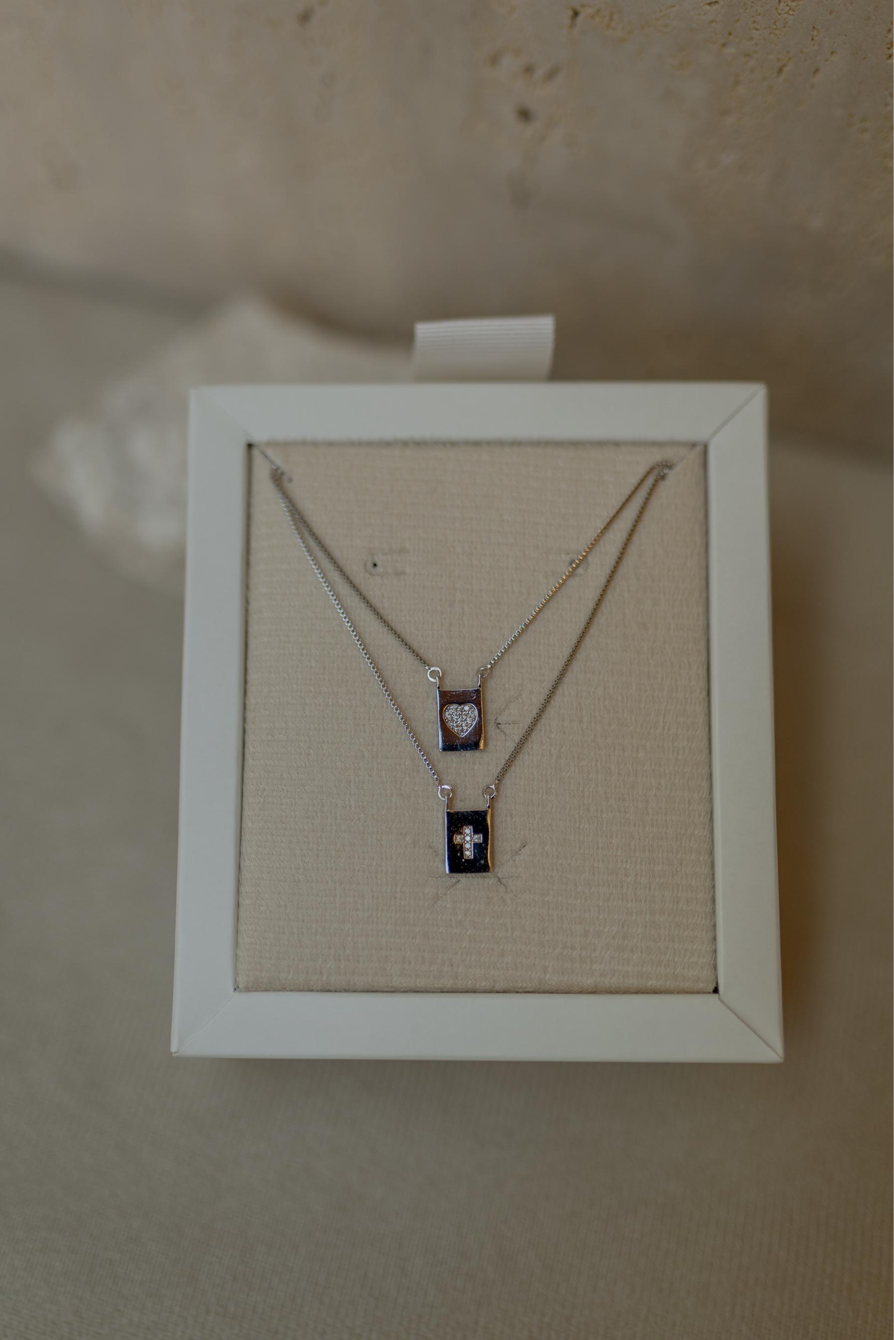 Colar escapulário com pingente fixo de coração e crucifixo cravejado com zircônias na cor cristal e banho de ródio branco.
