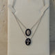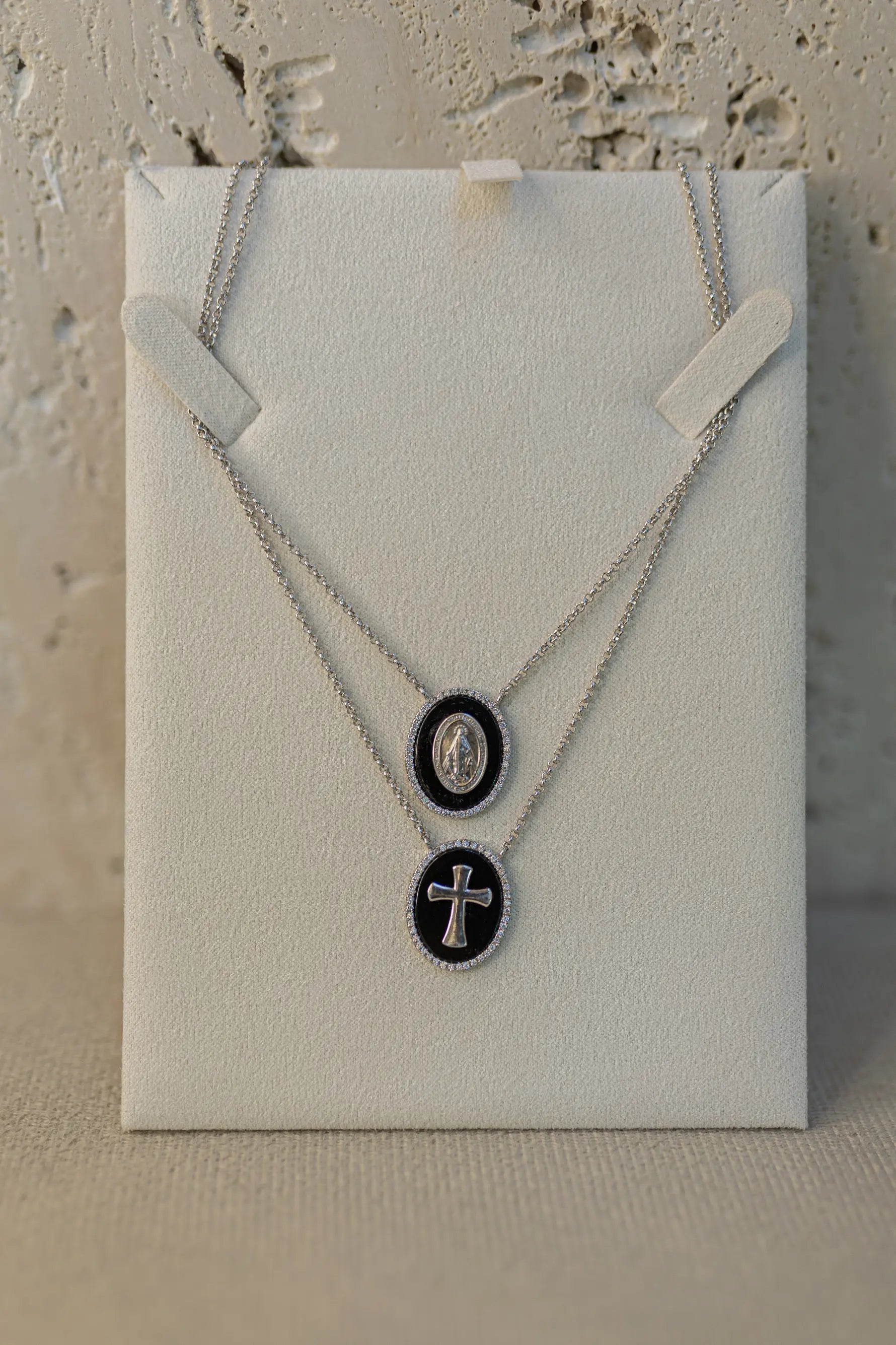 Colar escapulário Oval com esmaltação italiana na cor preta e zircônias cristal no banho de ródio branco.