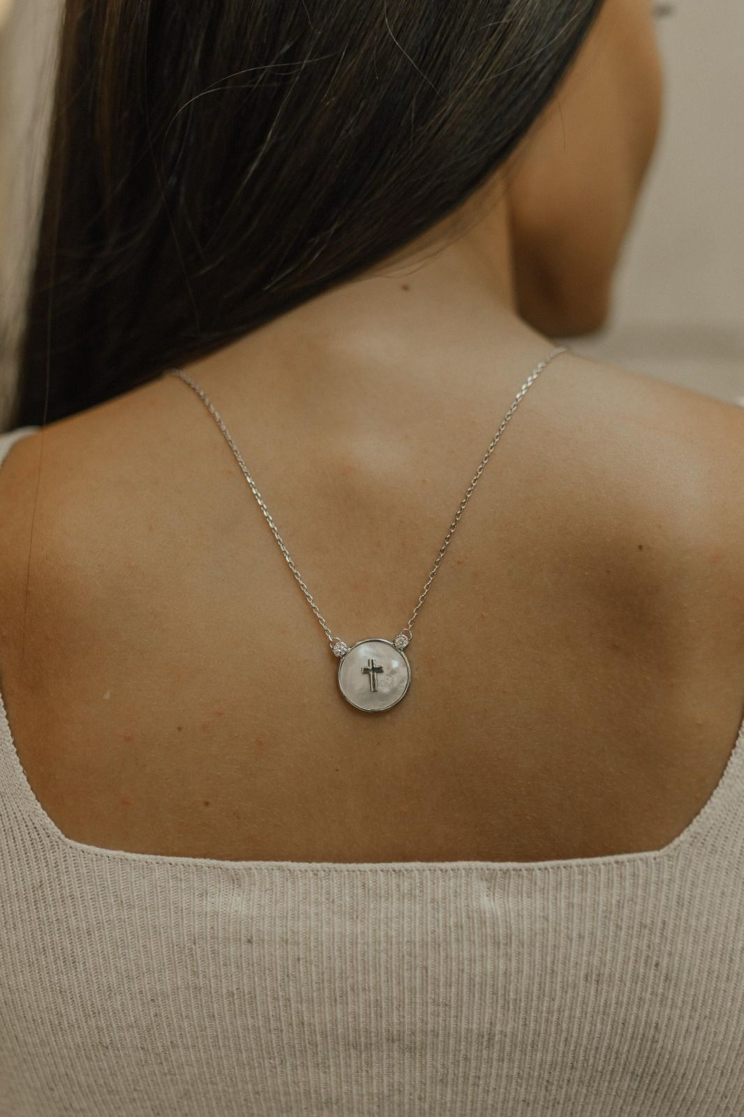 Colar Espírito Santo com borda cravejada e madrepérola no banho de ródio branco.