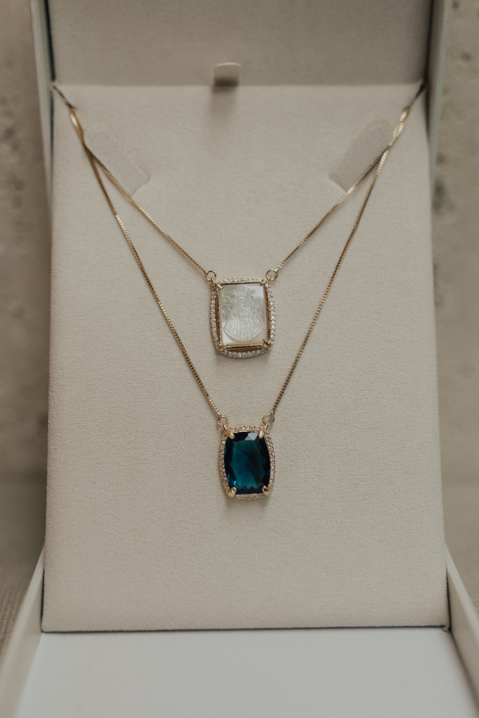 Colar escapulário longo com dois pingentes fixos na corrente pedra azul apatita com borda cravejada e pingente Nossa Senhora Aparecida ou Nossa Senhora das Graças em madrepérola no banho de ouro 18k.