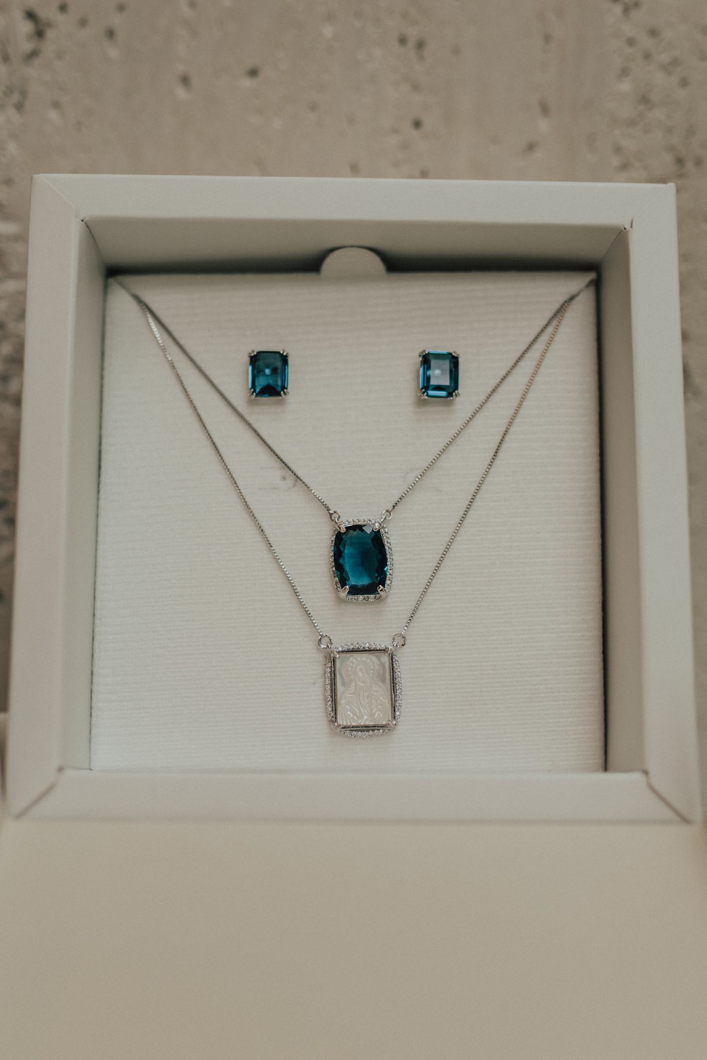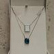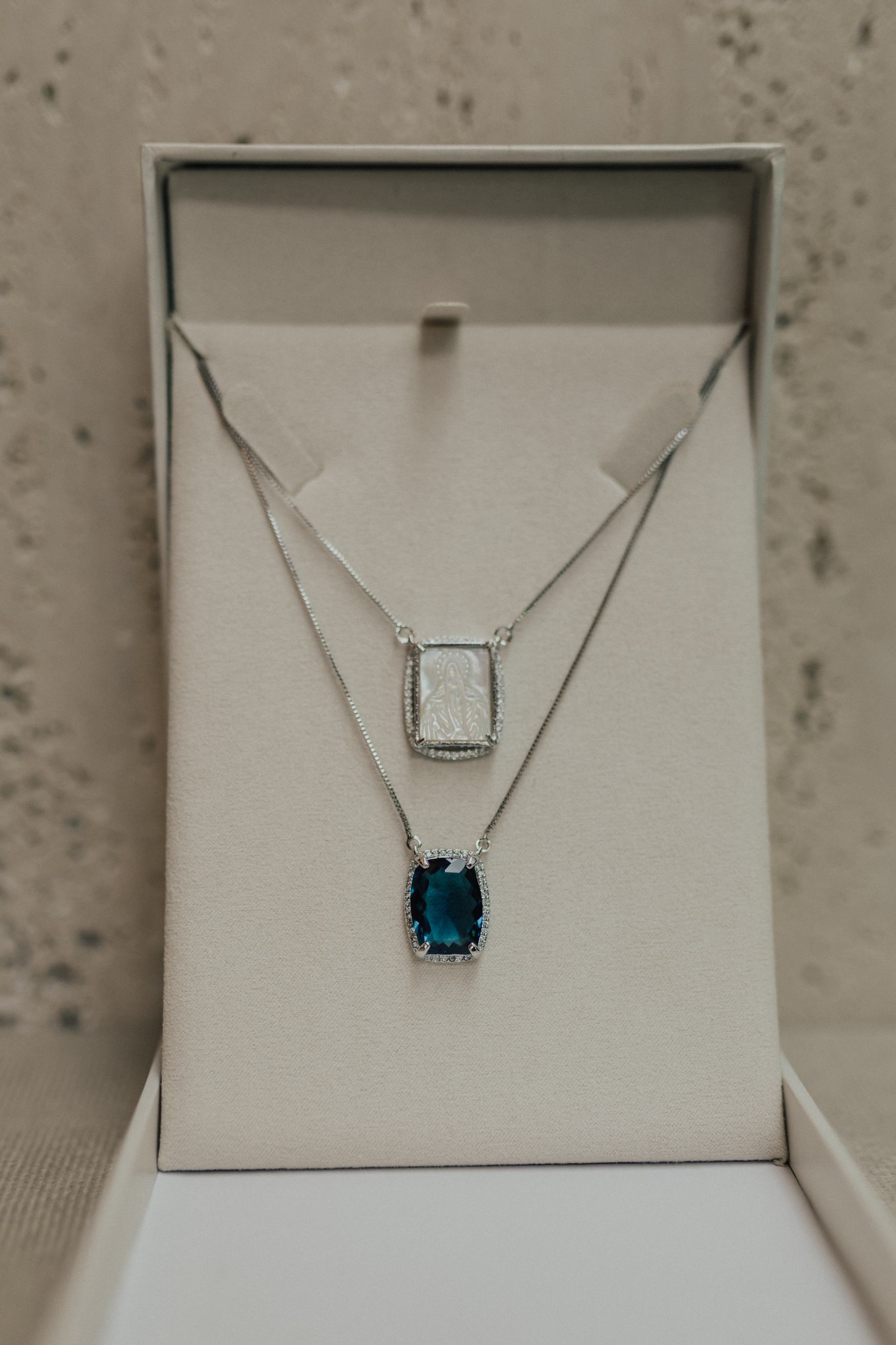 Colar escapulário longo com dois pingentes fixos na corrente pedra azul apatita com borda cravejada e pingente Nossa Senhora Aparecida ou Nossa Senhora das Graças em madrepérola no banho de ródio branco.
