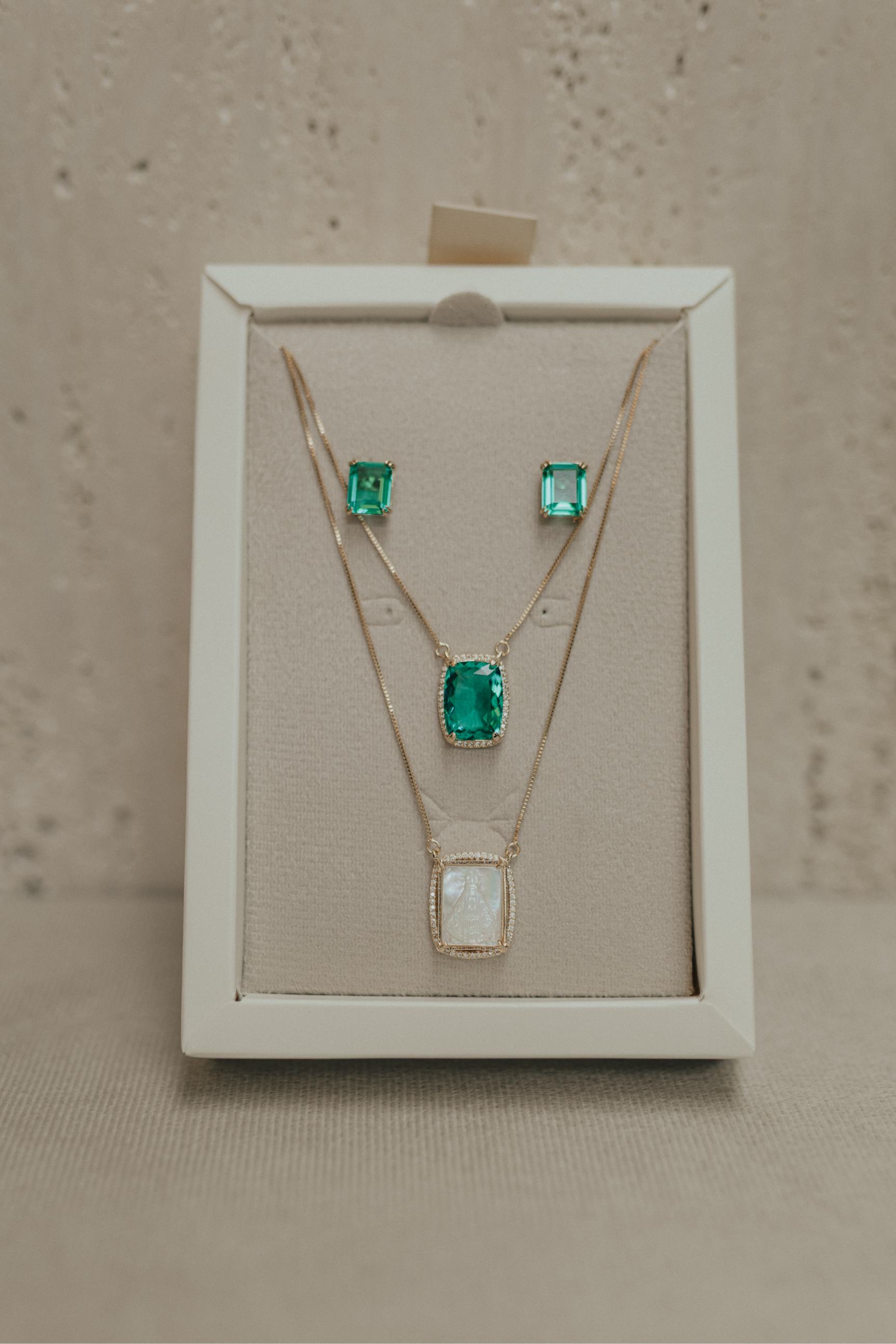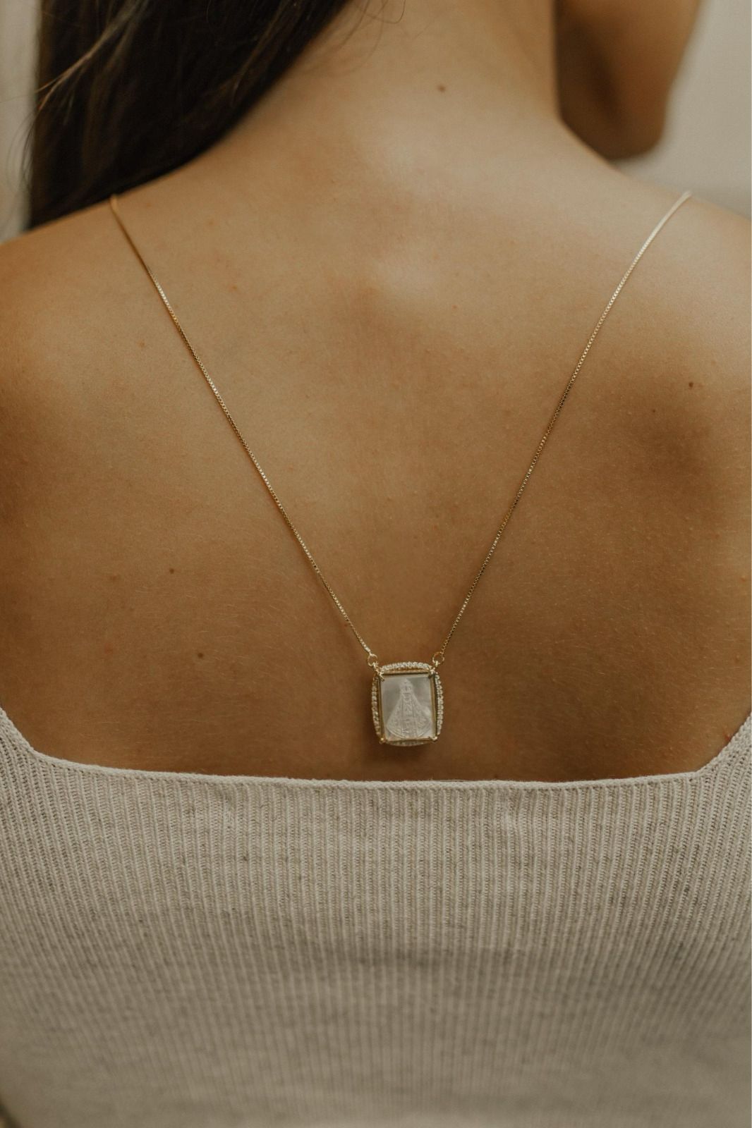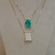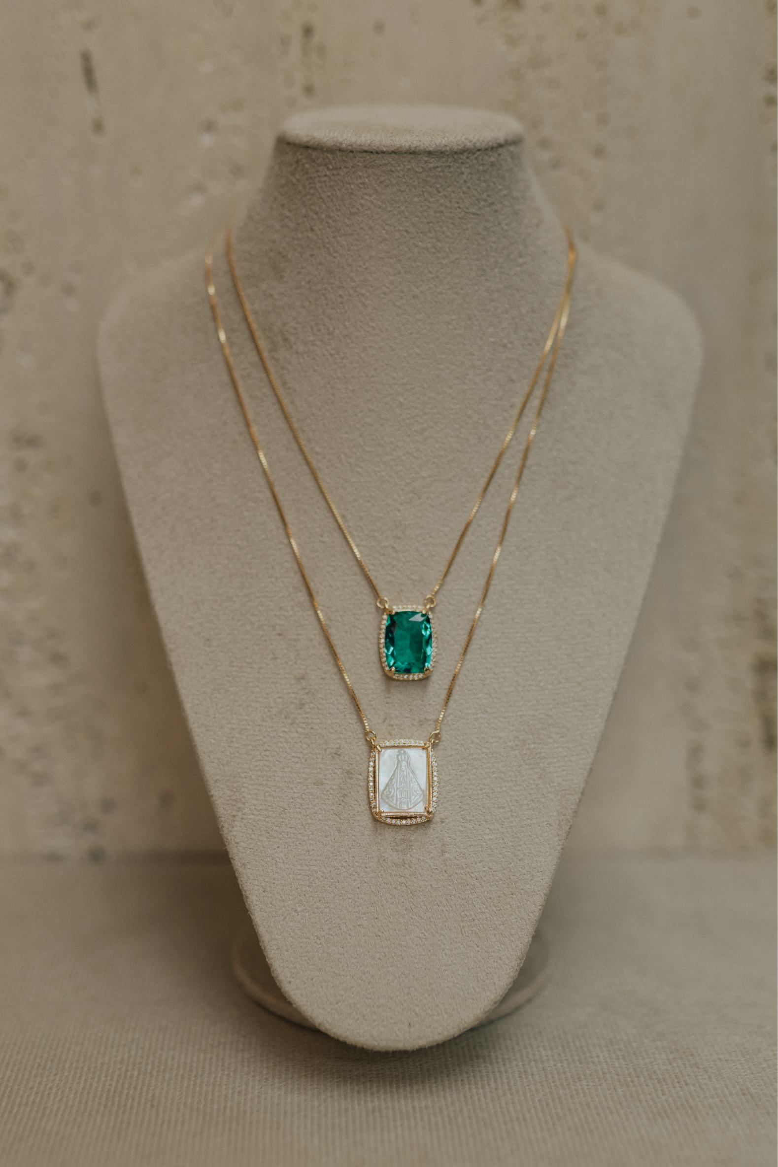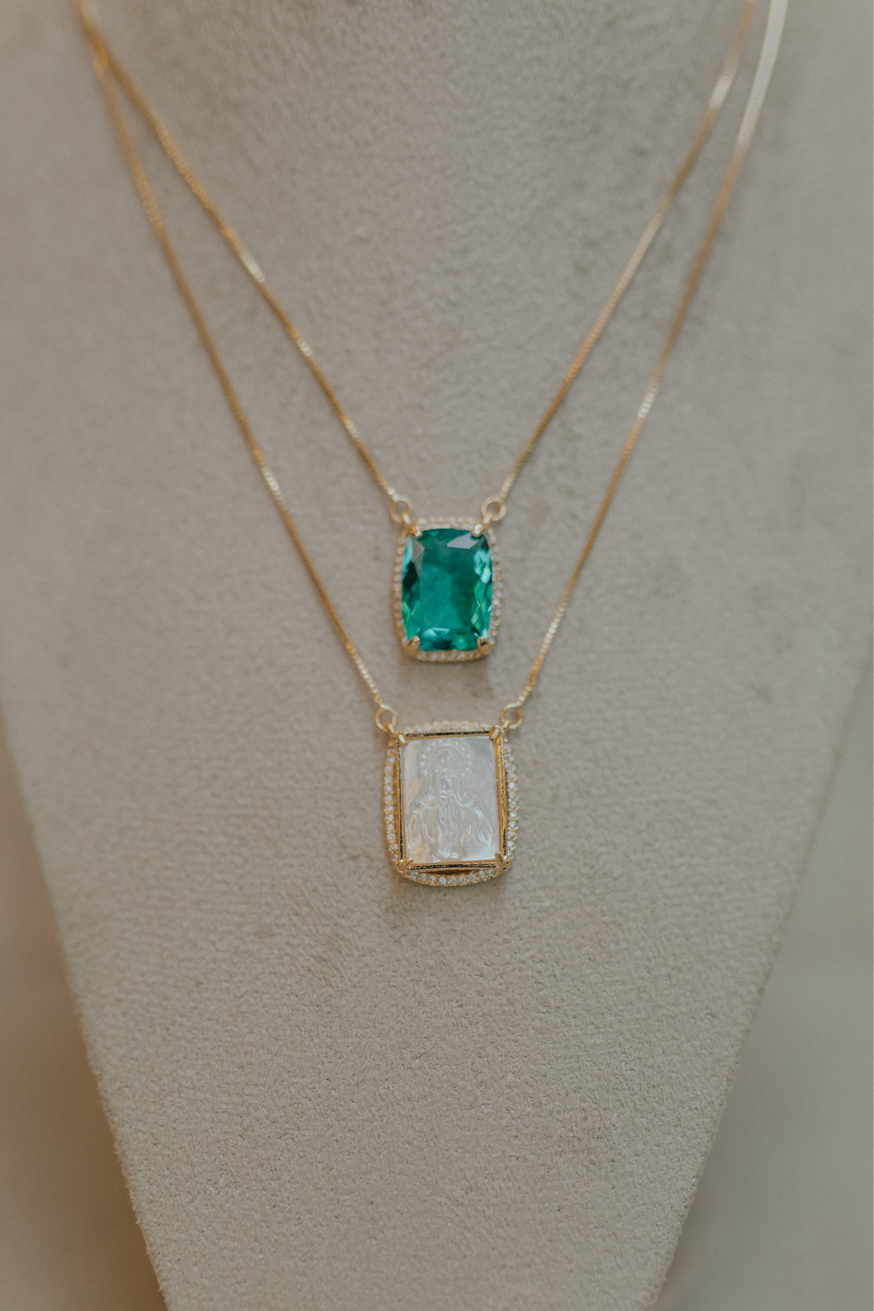 Colar escapulário longo com dois pingentes fixos na corrente pedra verde paraíba com borda cravejada e pingente Nossa Senhora Aparecida ou Nossa Senhora das Graças em madrepérola no banho de ouro 18k.