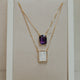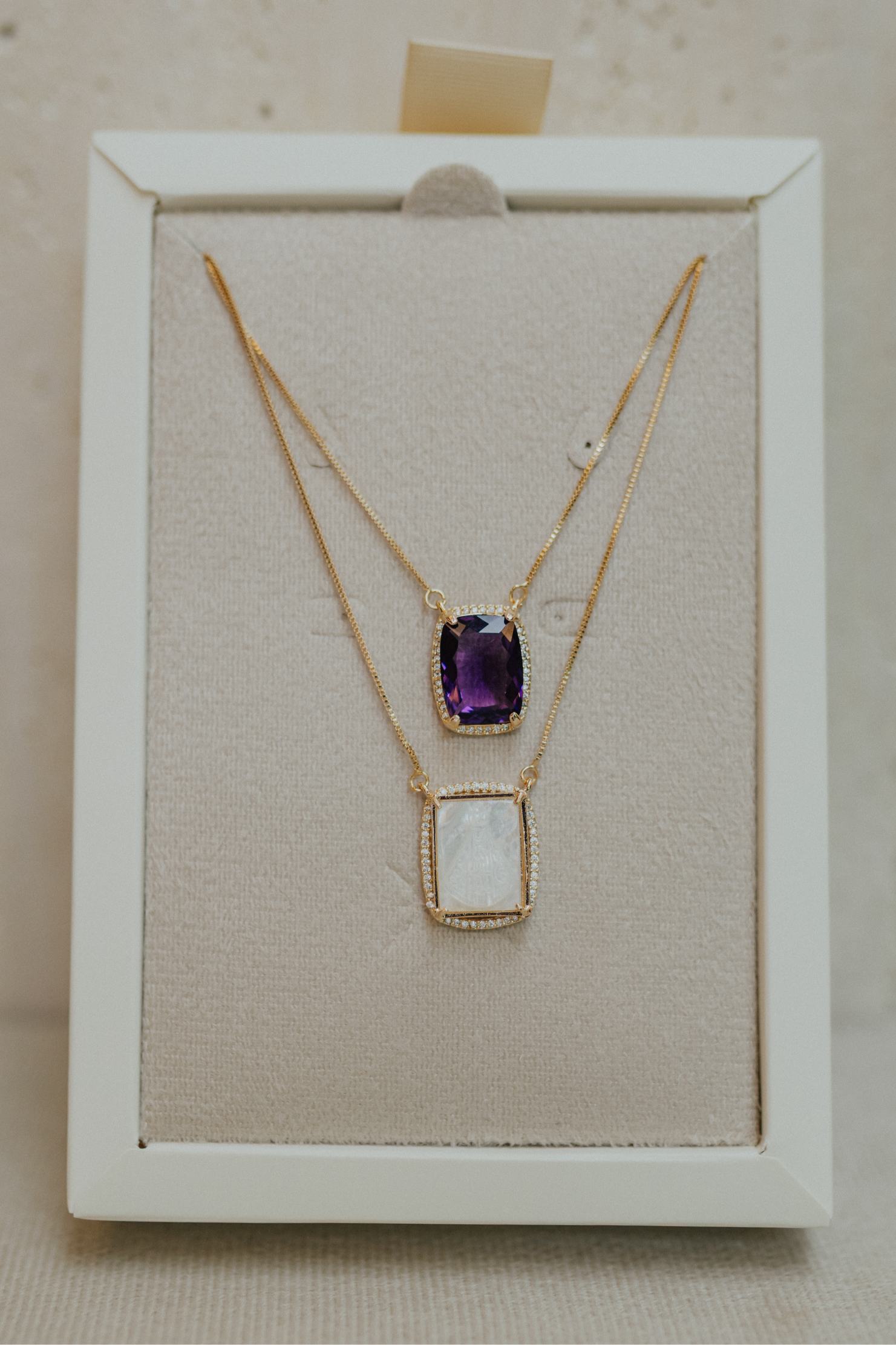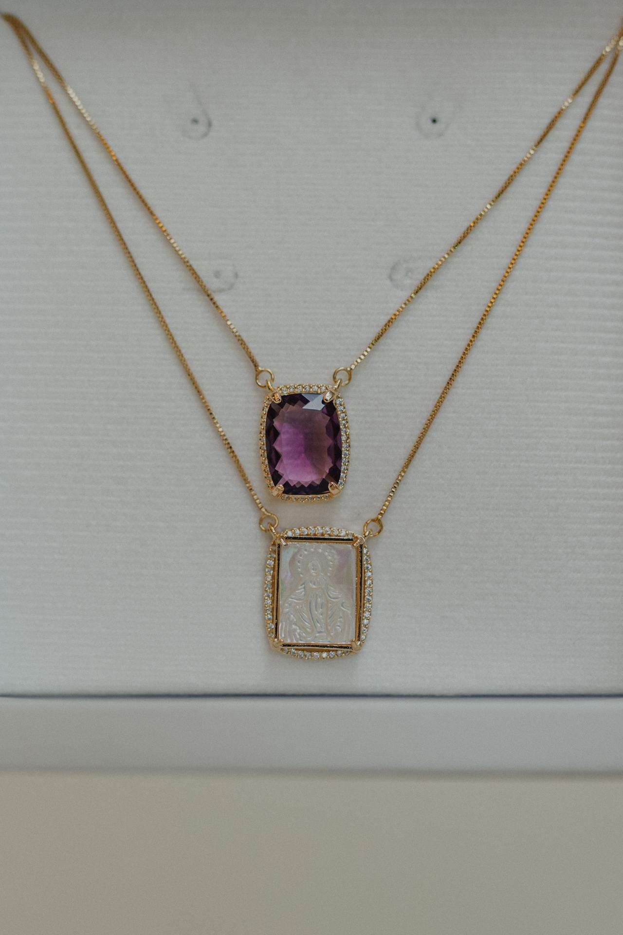 Colar escapulário longo com dois pingentes fixos na corrente pedra ametista com borda cravejada e pingente Nossa Senhora Aparecida ou Nossa Senhora das Graças em madrepérola no banho de ouro 18k.