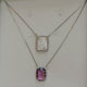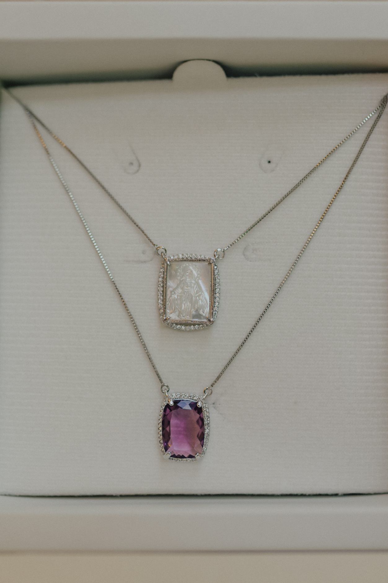 Colar escapulário longo com dois pingentes fixos na corrente pedra ametista com borda cravejada e pingente Nossa Senhora Aparecida ou Nossa Senhora das Graças em madrepérola no banho de ródio branco.
