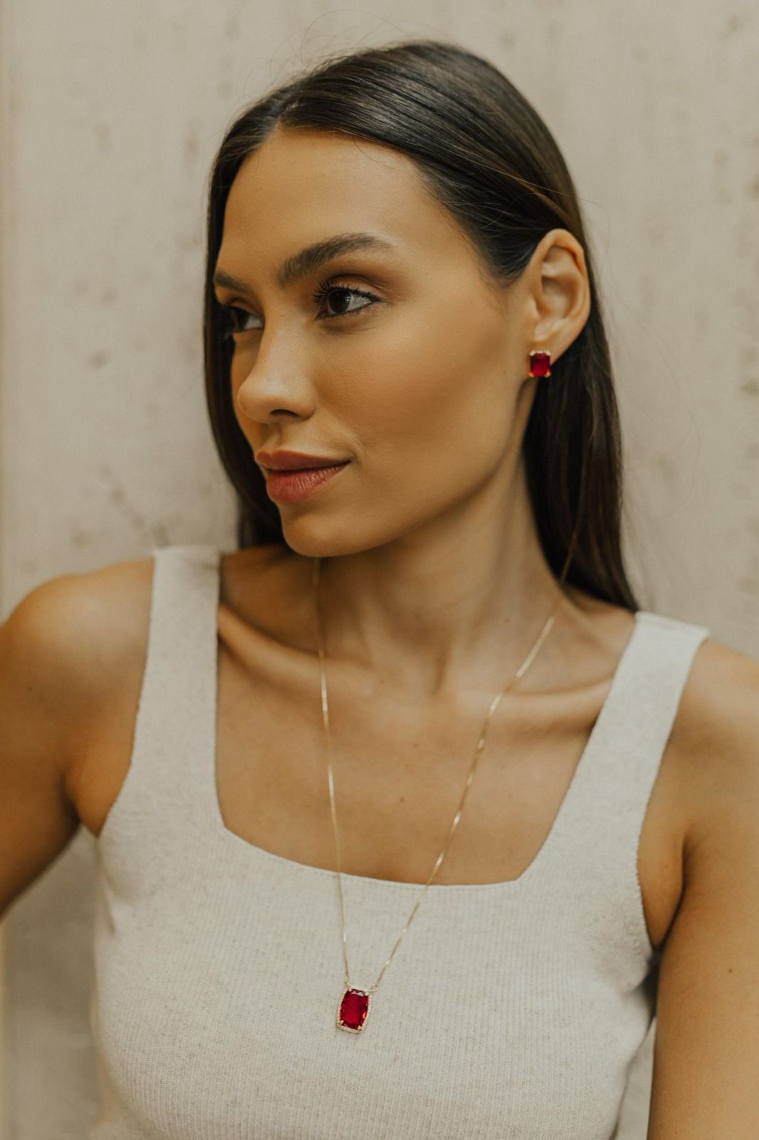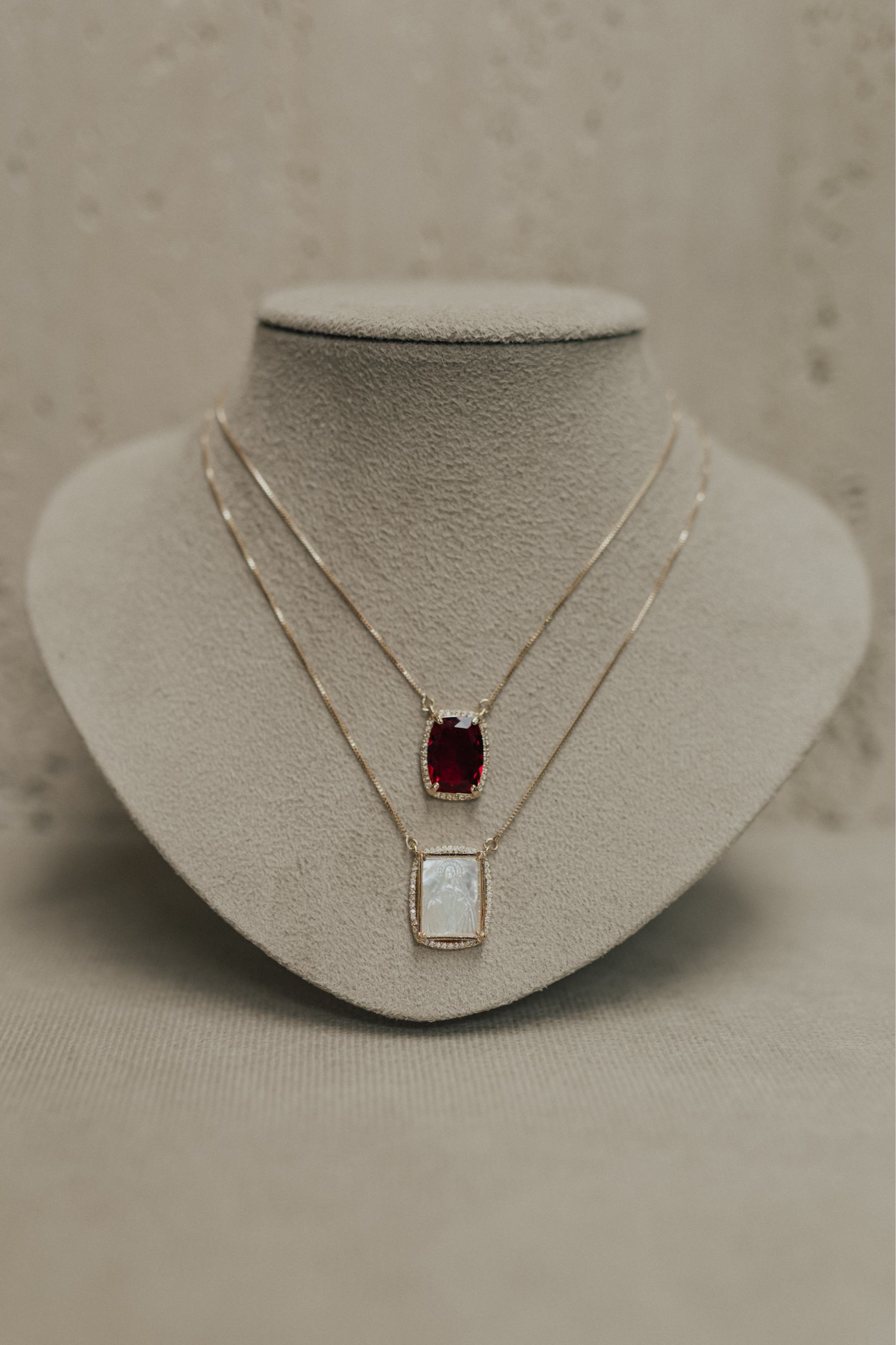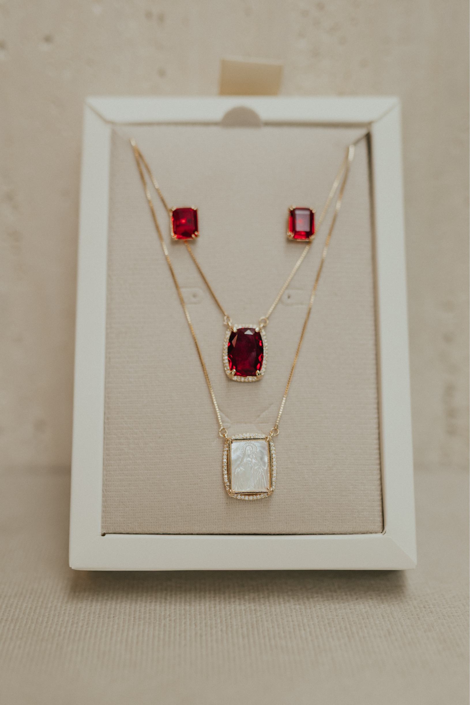 Colar escapulário longo com dois pingentes fixos na corrente pedra rubi com borda cravejada e pingente Nossa Senhora Aparecida ou Nossa Senhora das Graças em madrepérola no banho de ródio branco.