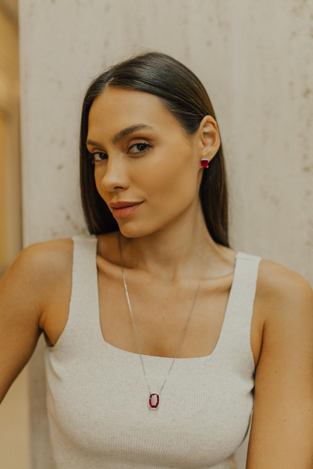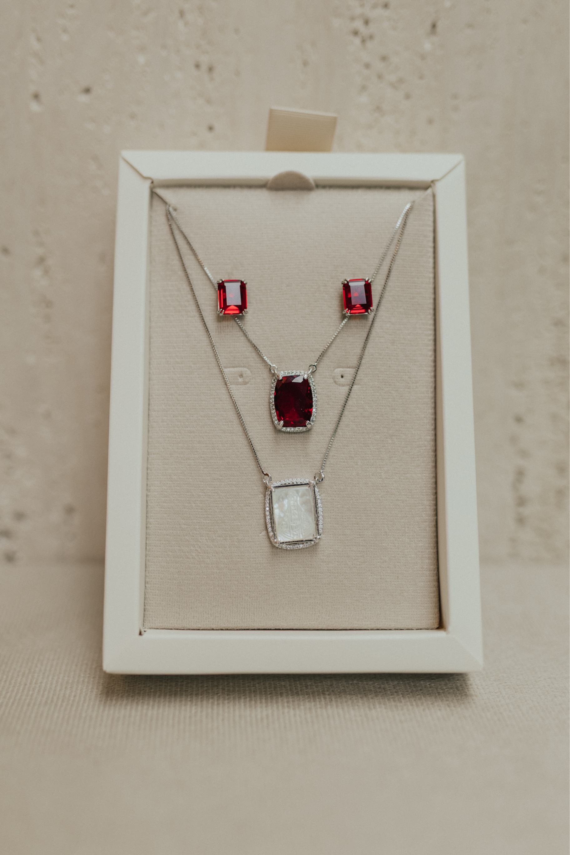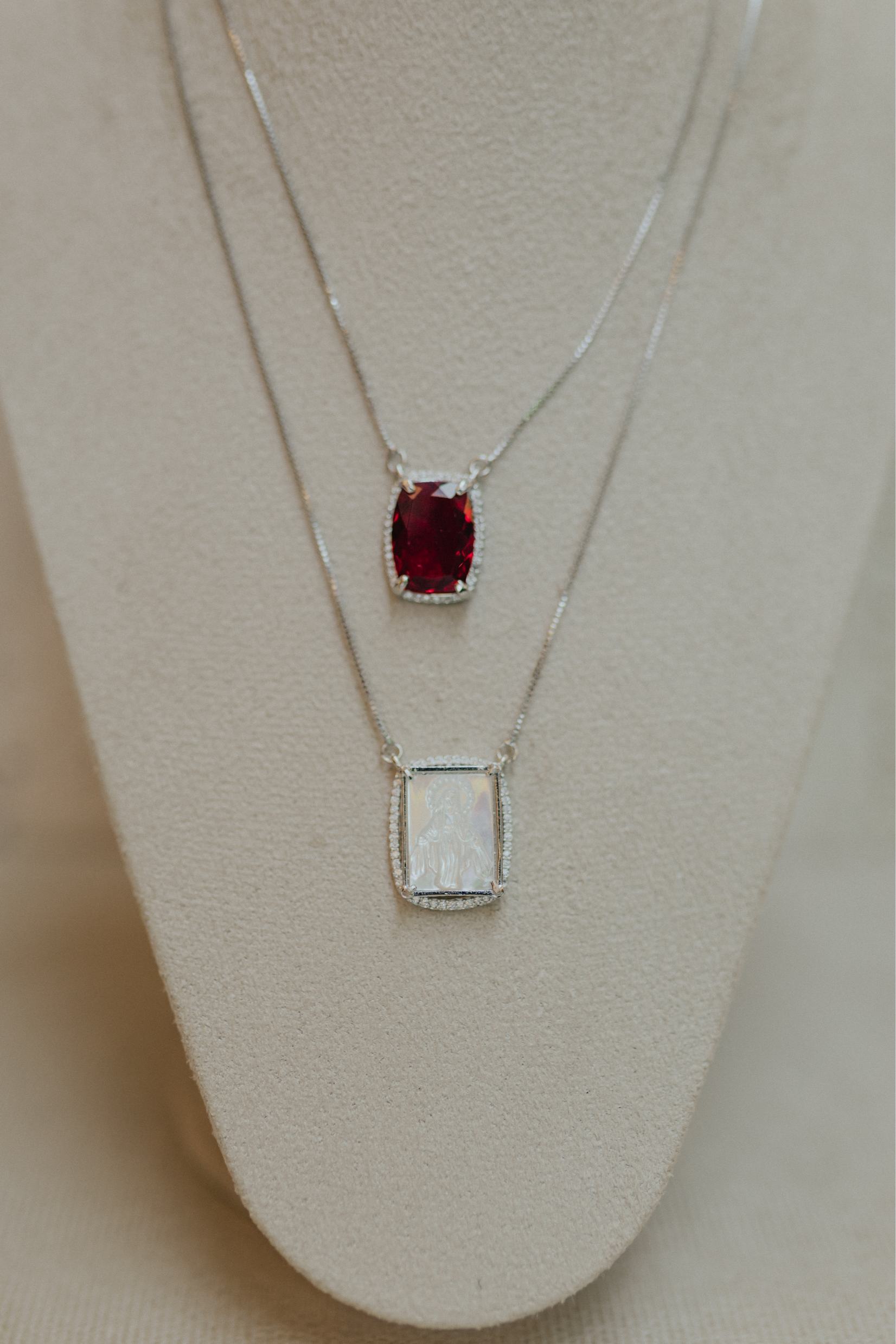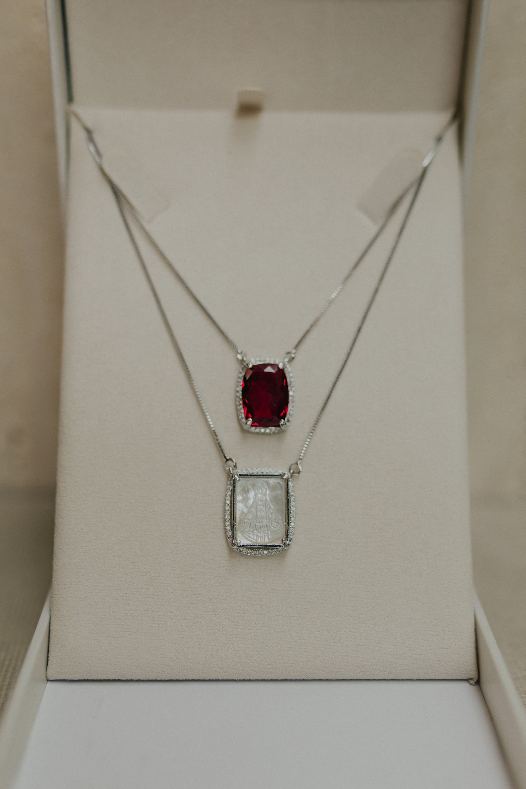 Colar escapulário longo com dois pingentes fixos na corrente pedra rubi com borda cravejada e pingente Nossa Senhora Aparecida ou Nossa Senhora das Graças em madrepérola no banho de ródio branco.