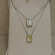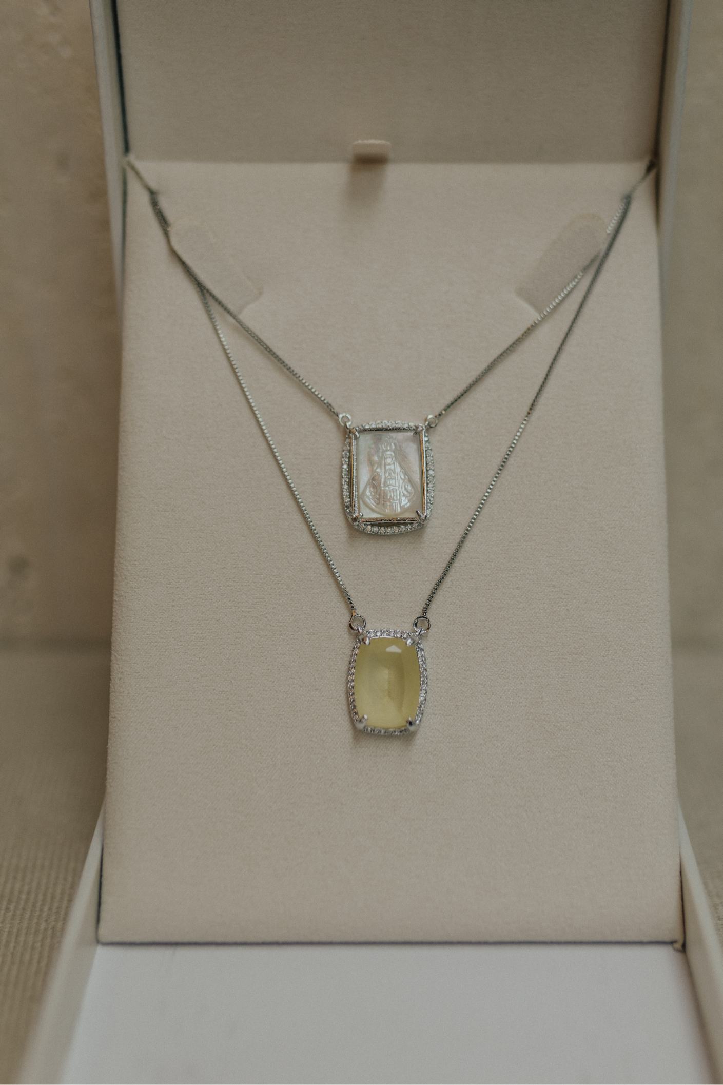 Colar escapulário longo com dois pingentes fixos na corrente pedra safira amarela com borda cravejada e pingente Nossa Senhora Aparecida ou Nossa Senhora das Graças em madrepérola no banho de ródio branco.