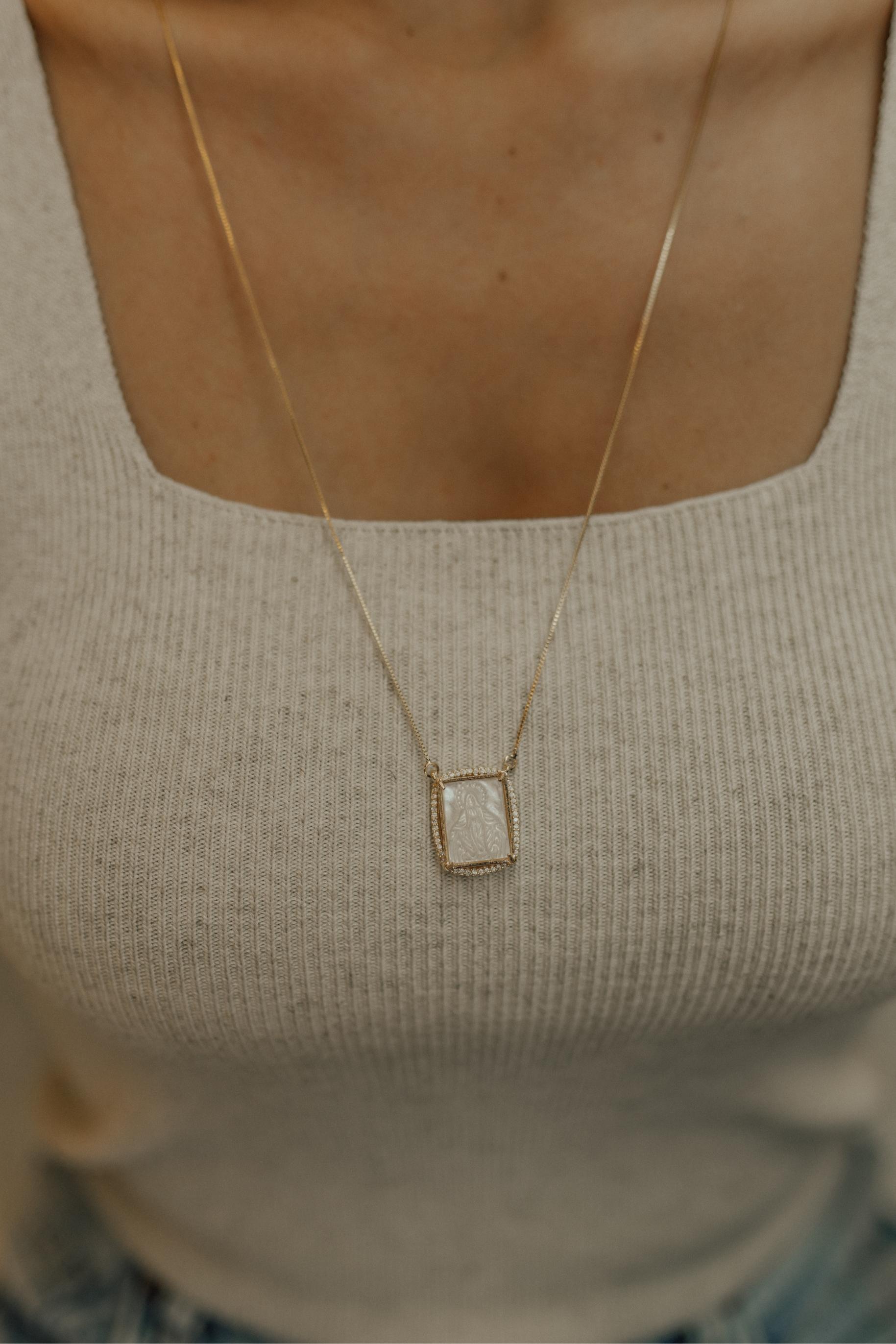 Colar escapulário longo com dois pingentes fixos na corrente pedra safira rosa com borda cravejada e pingente Nossa Senhora Aparecida ou Nossa Senhora das Graças em madrepérola no banho de ouro 18k.