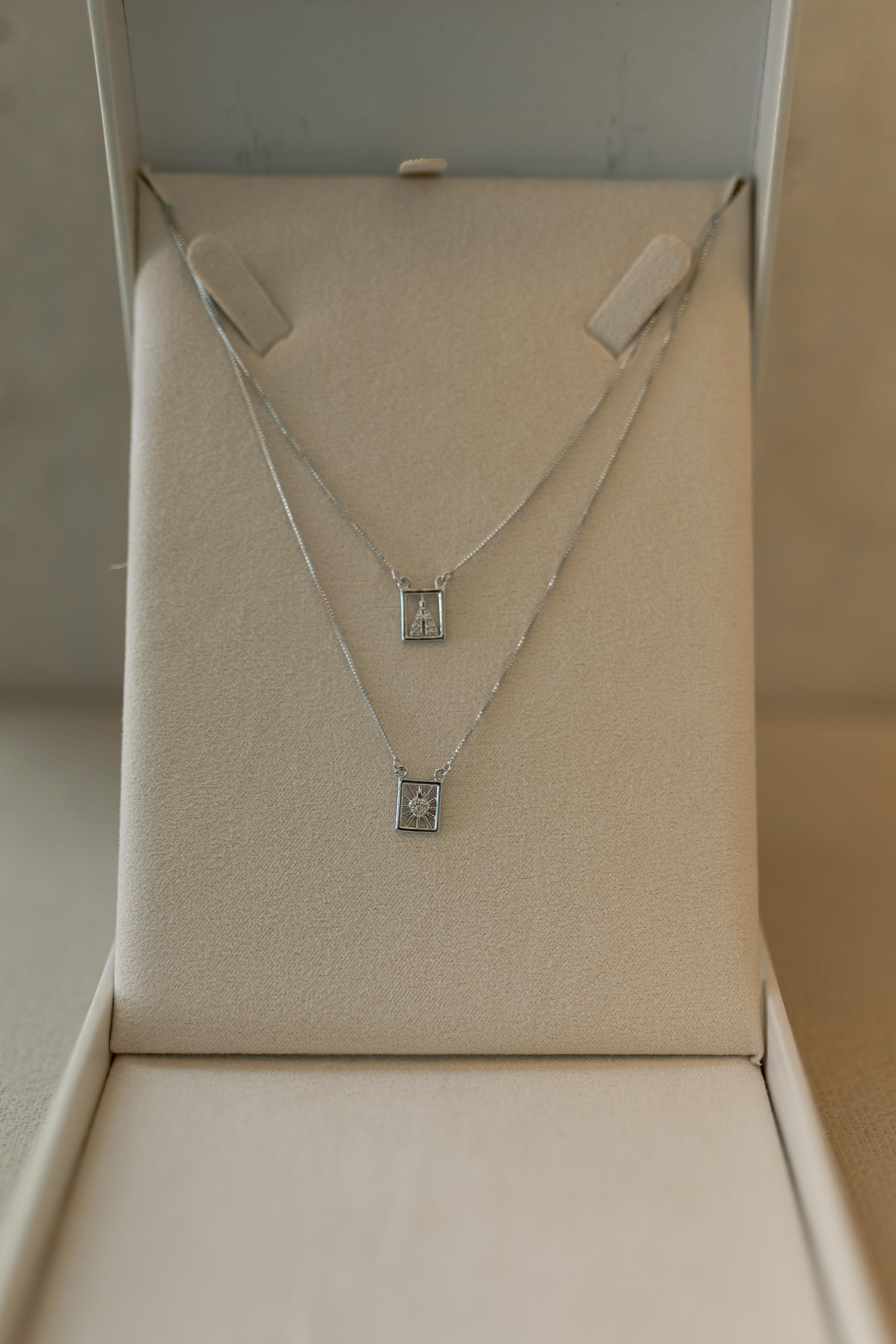 Colar corrente veneziana fina modelo escapulário com duas medalhas, uma de Nossa Senhora Aparecida e outra com Sagrado Coração de Jesus, no banho de ródio branco.