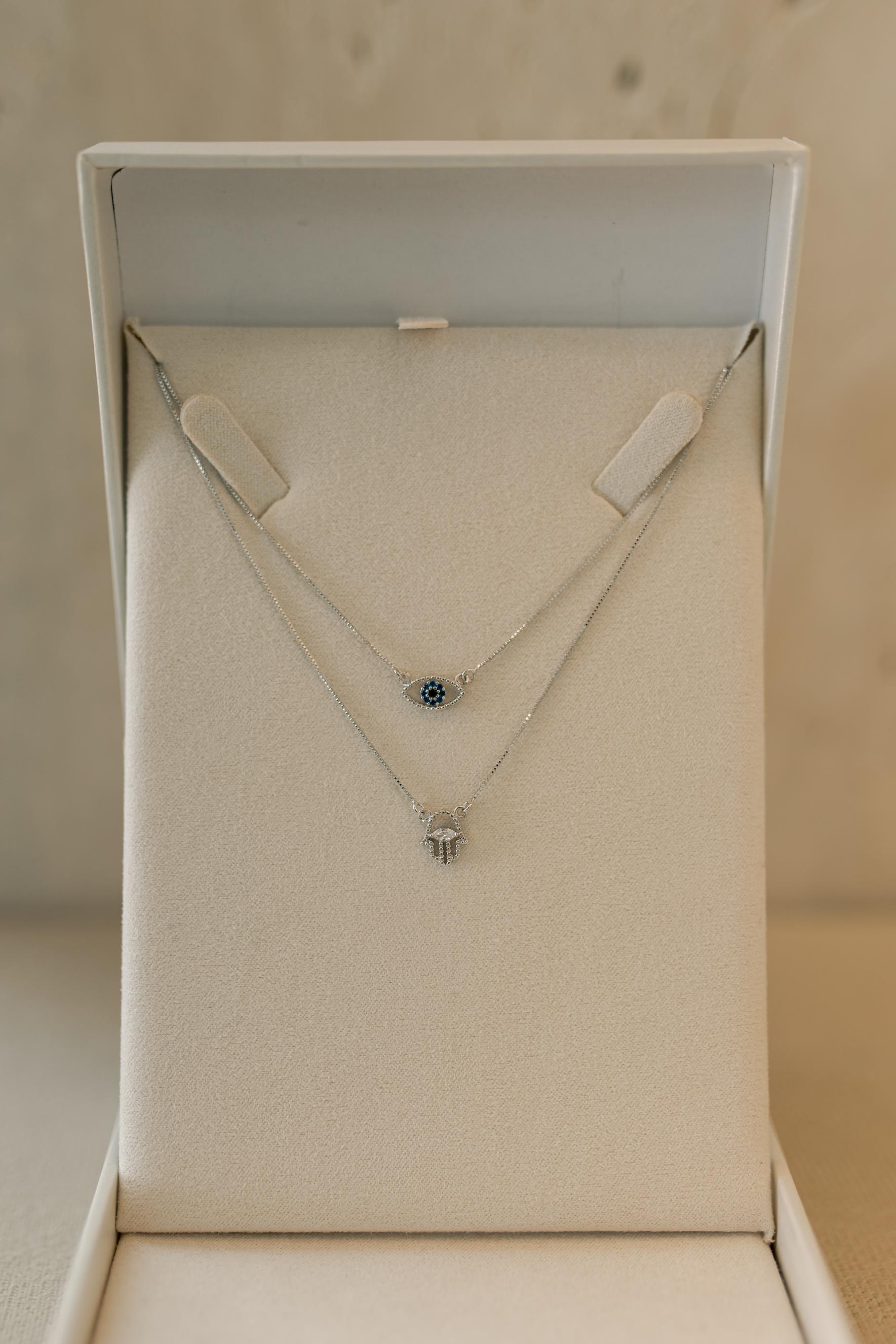Escapulário com pingente de Olho Grego cravejado de Micro Zircônias na cor safira e ônix e Mão de Fátima com um ponto de luz na zircônica cristal no banho de ródio branco.