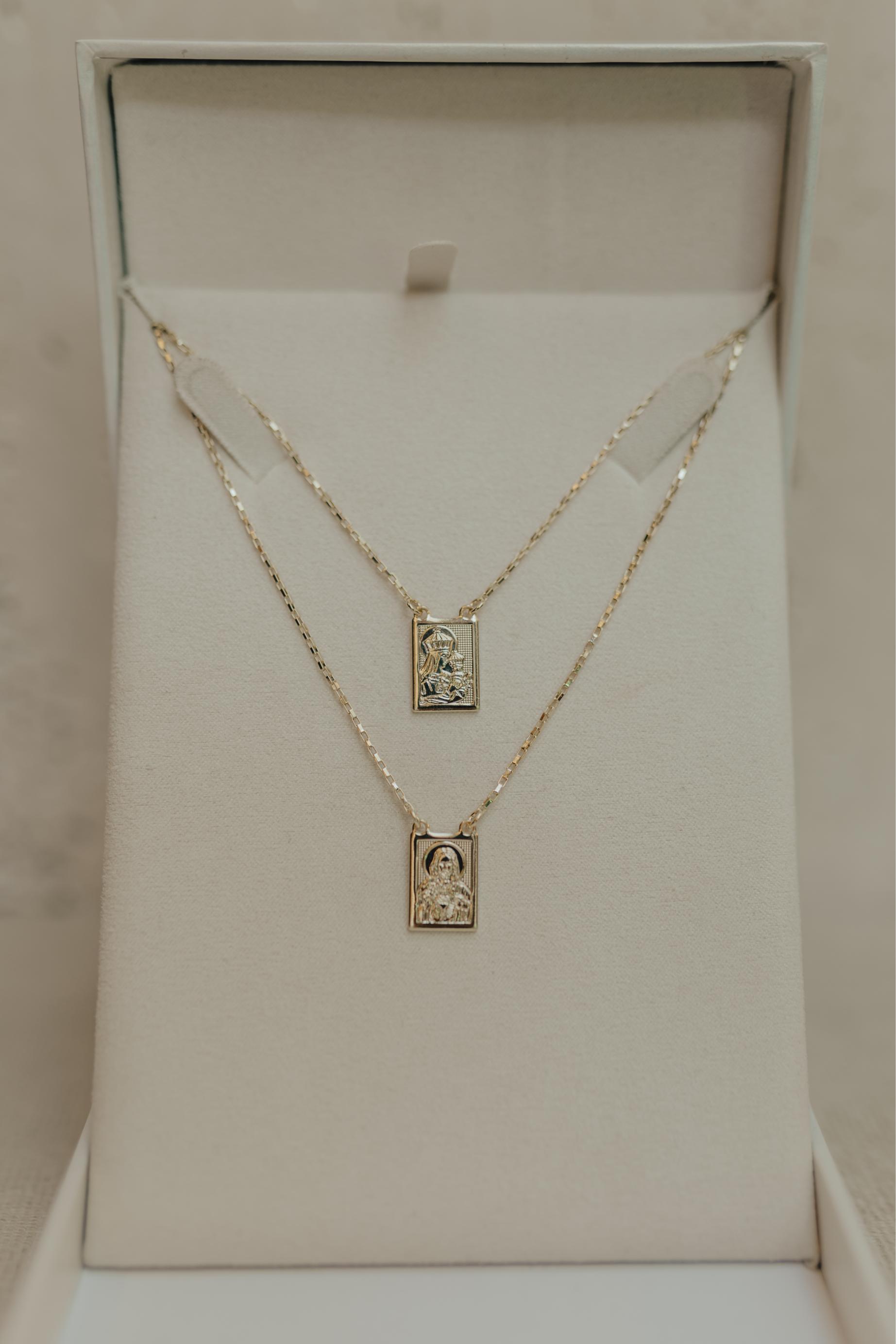Colar escapulário clássico, Sagrado Coração de Jesus e Nossa Senhora do Carmo no banho de ouro 18k. Ótima opção para presentear os homens.
