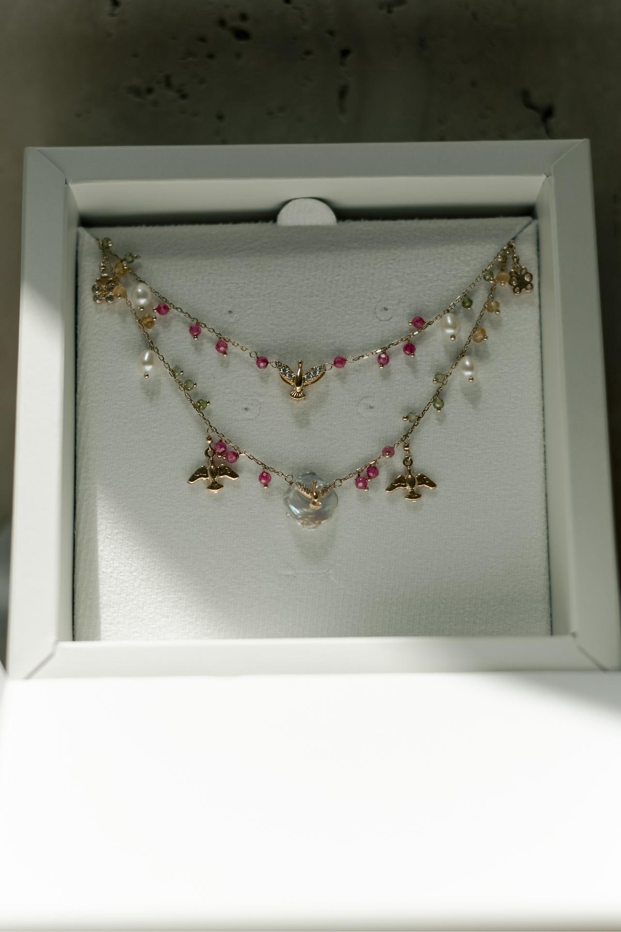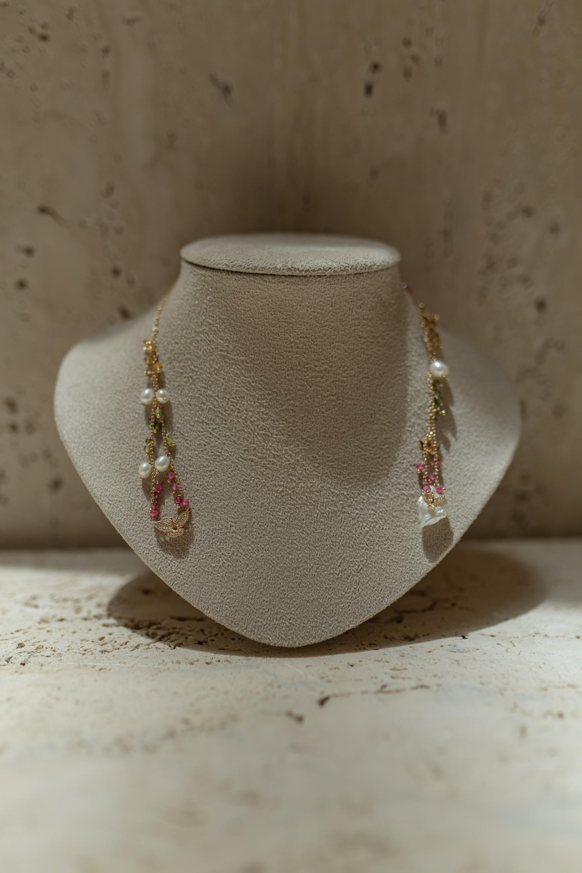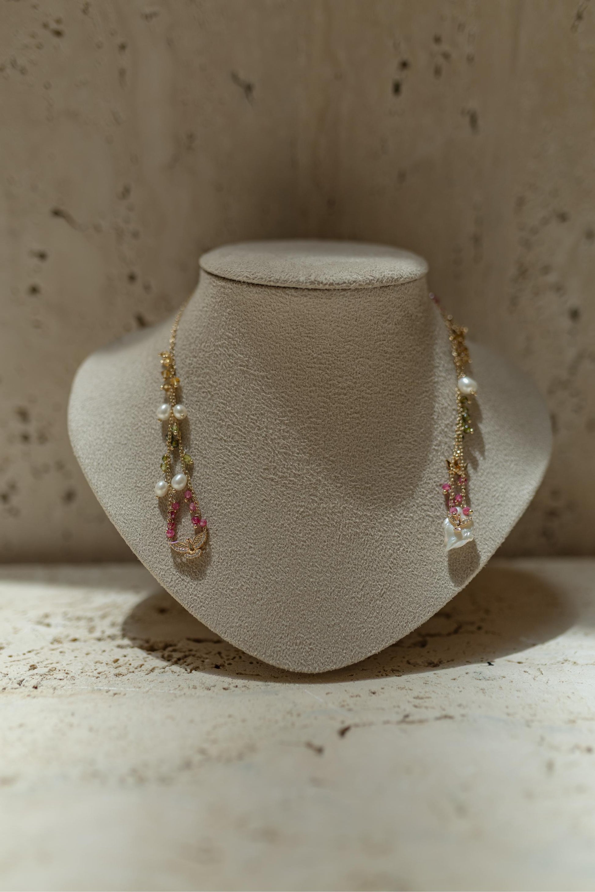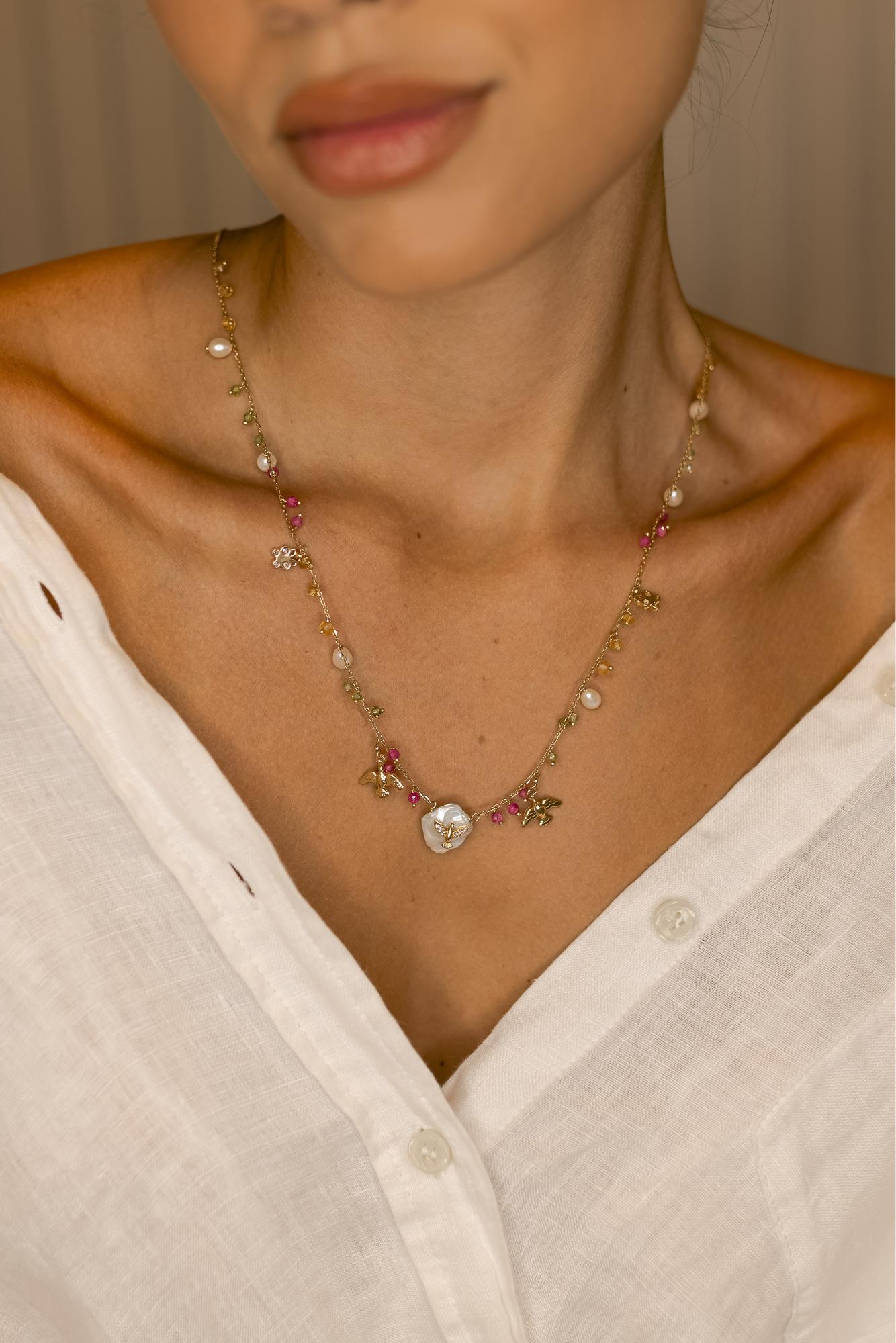 Colar escapulário de Espírito Santo com pedrinhas coloridas e pérola no banho de ouro 18k.