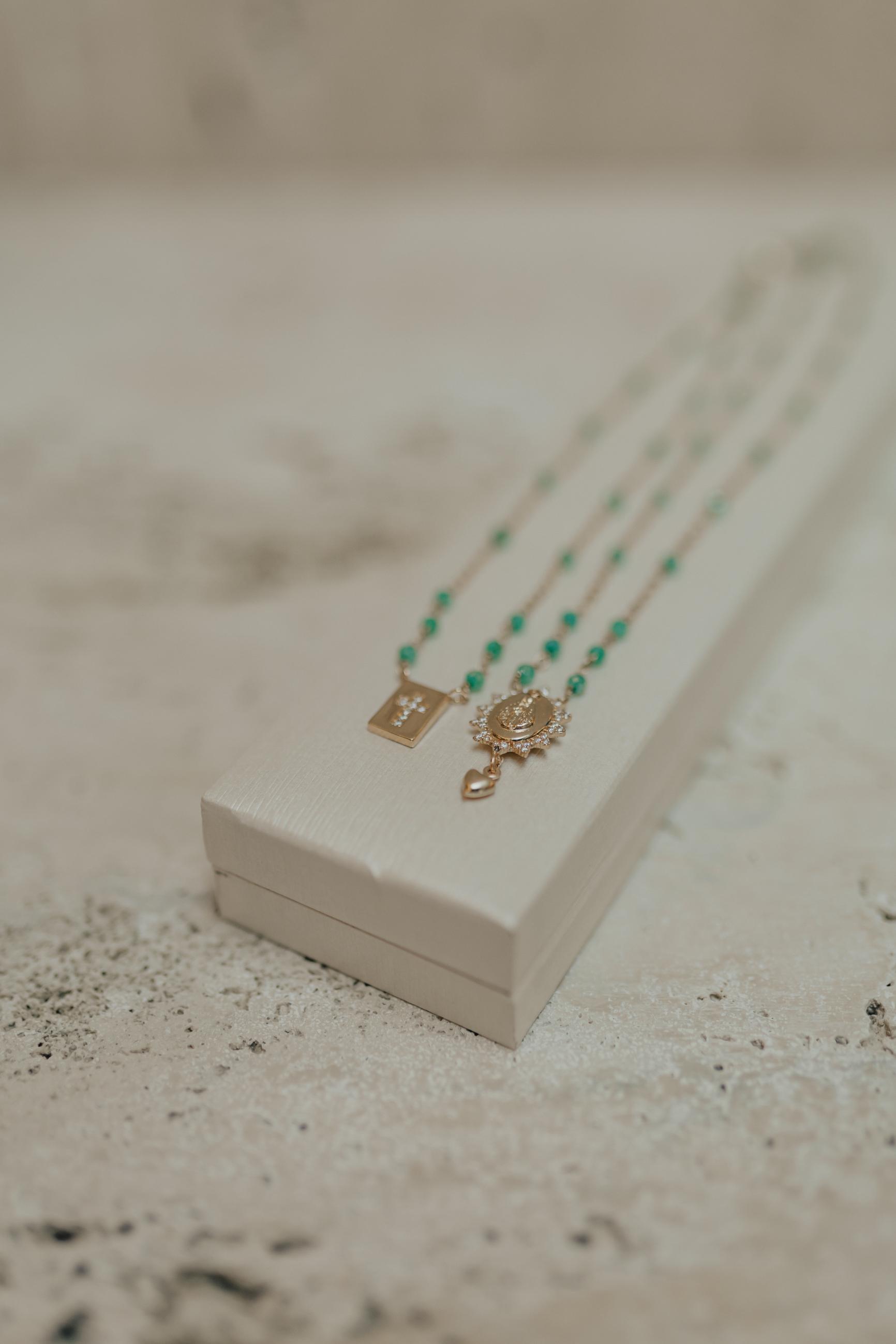Colar Escapulário Pedras Naturais Verde Nossa Senhora Aparecida Dourado