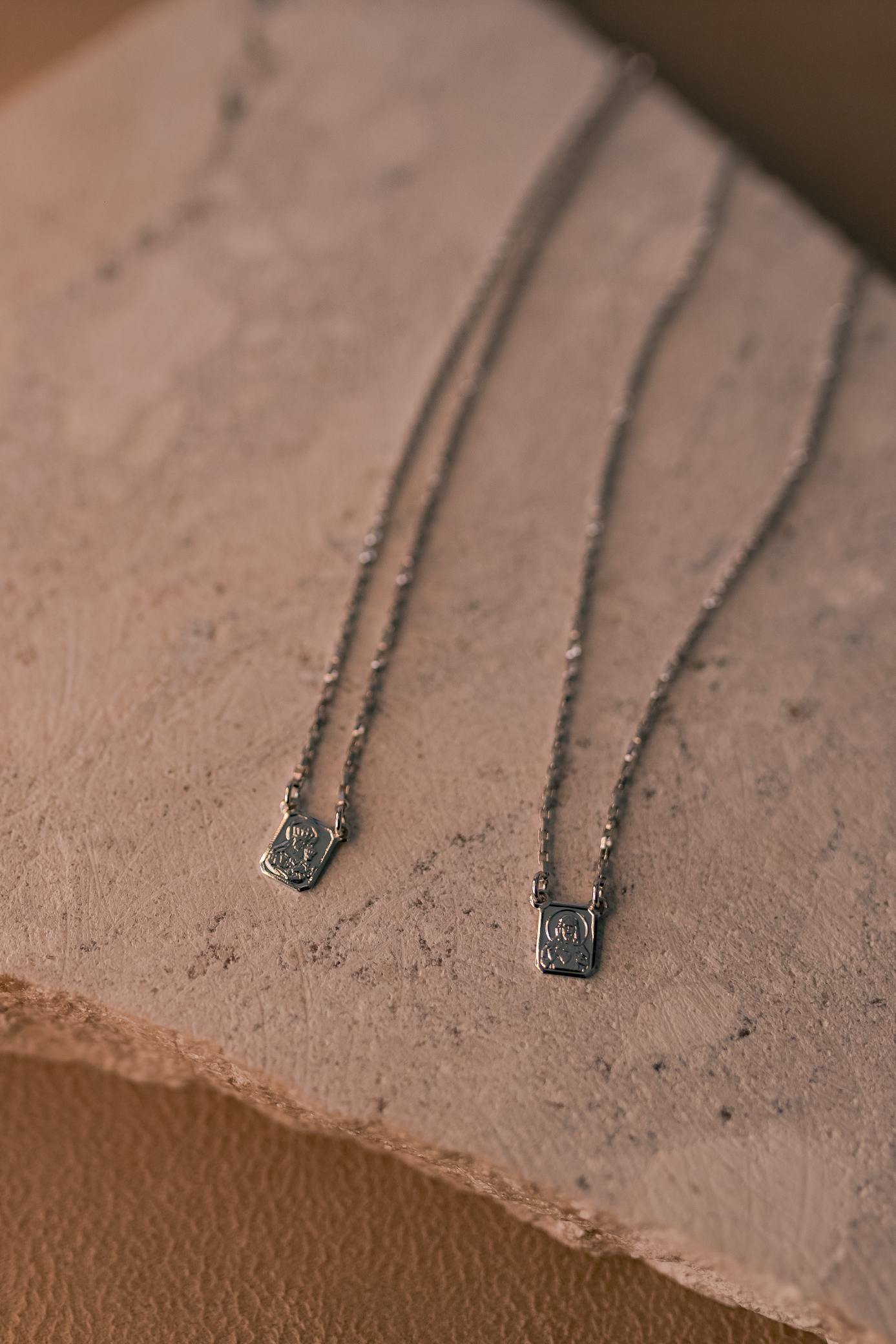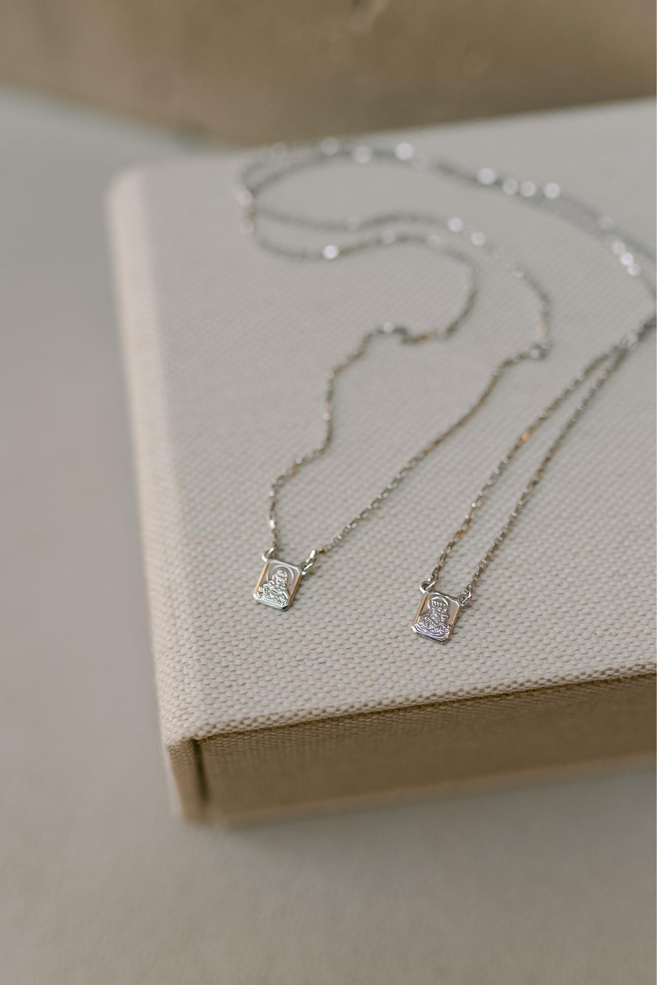Colar escapulário tradicional do Sagrado Coração de Jesus e Nossa Senhora do Carmo, possui corrente de elos, pingente fixo de mini medalhas no banho de ródio branco.
