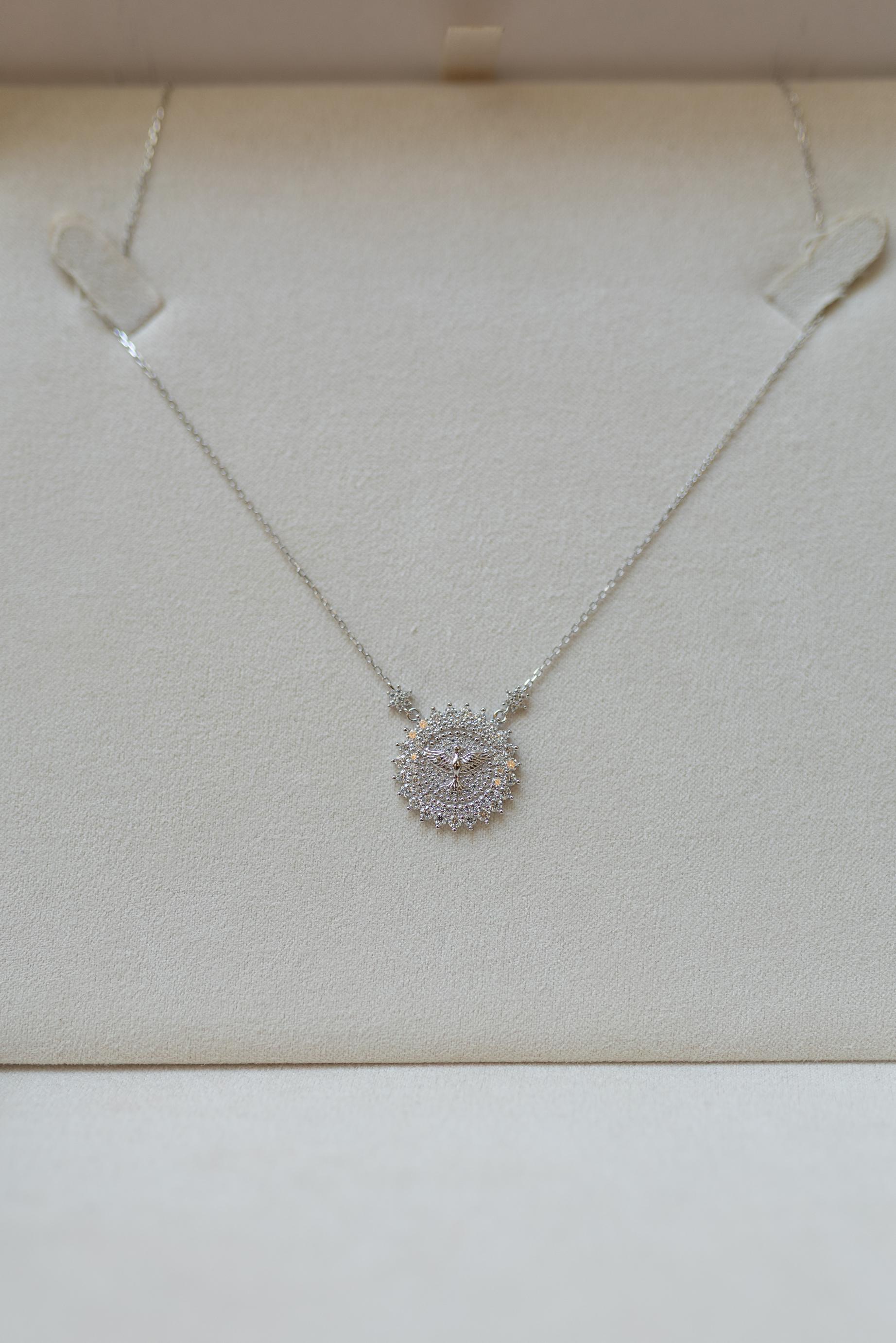 Colar de Prata 925 com banho de ródio branco e pingente Espirito Santo cravejado com Moissanite e detalhe de flores.