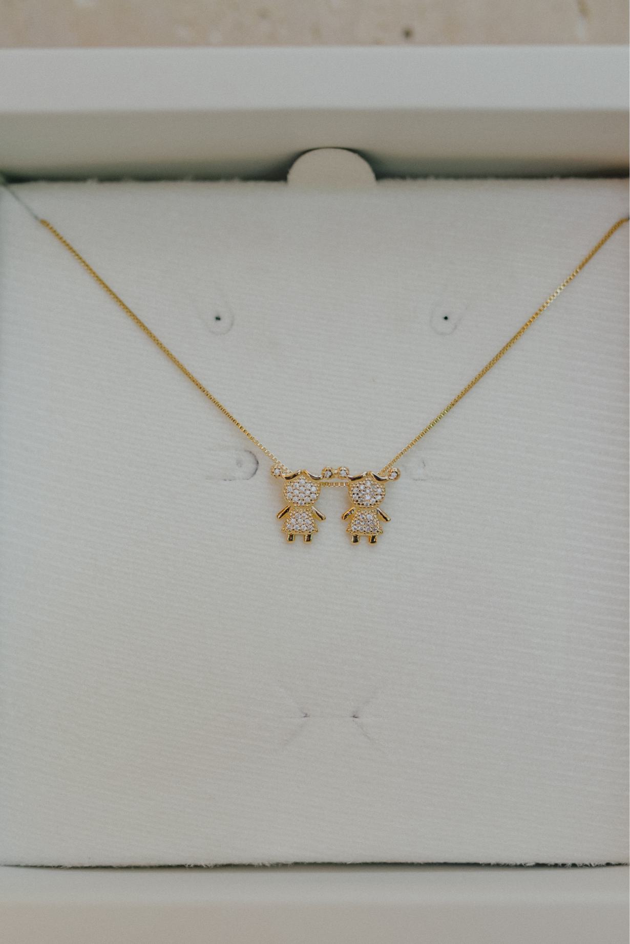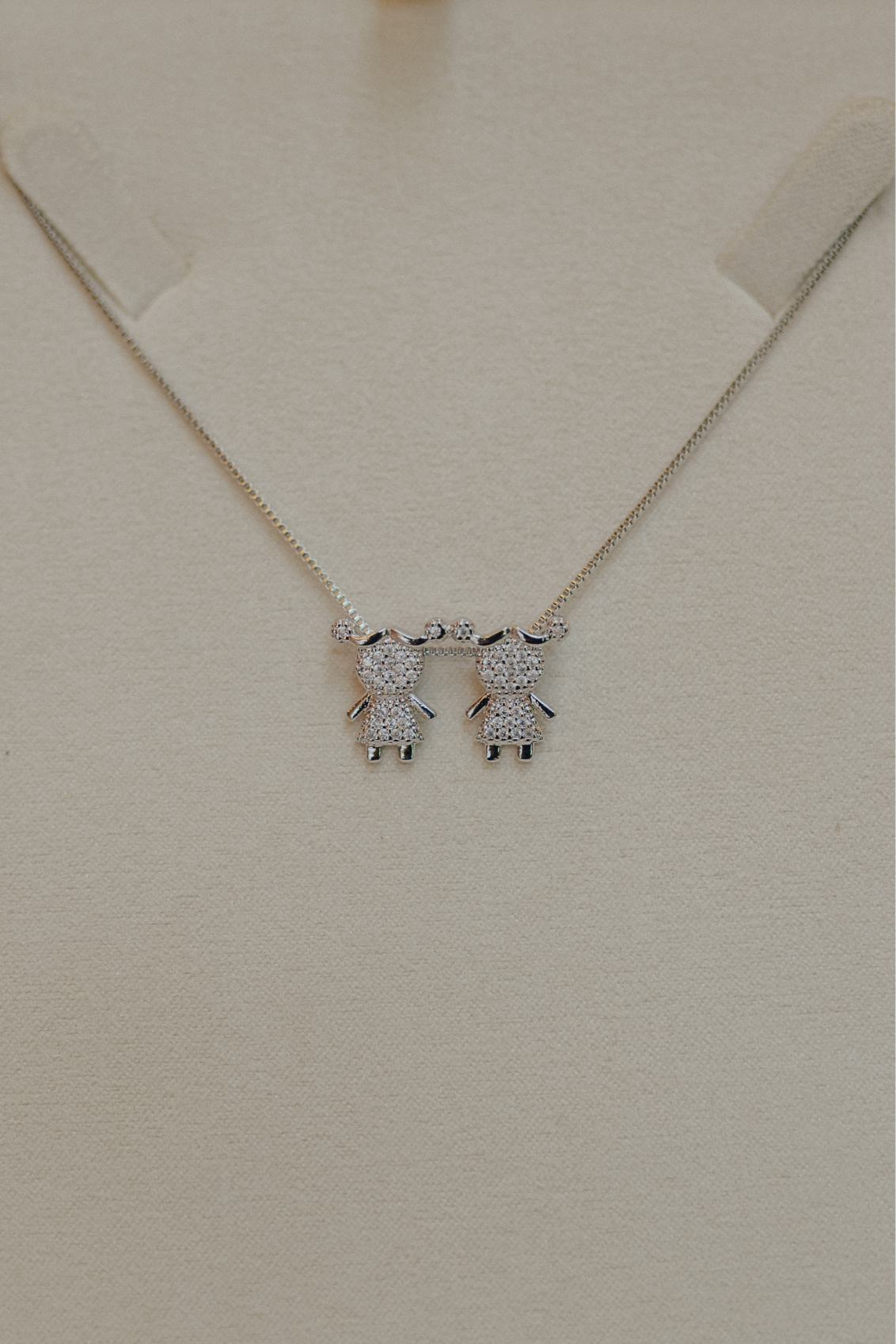 Colar com pingente de filhos, com detalhes em cravação de micro zircônias na cor cristal e banho de ouro 18k ou ródio branco.