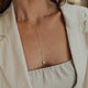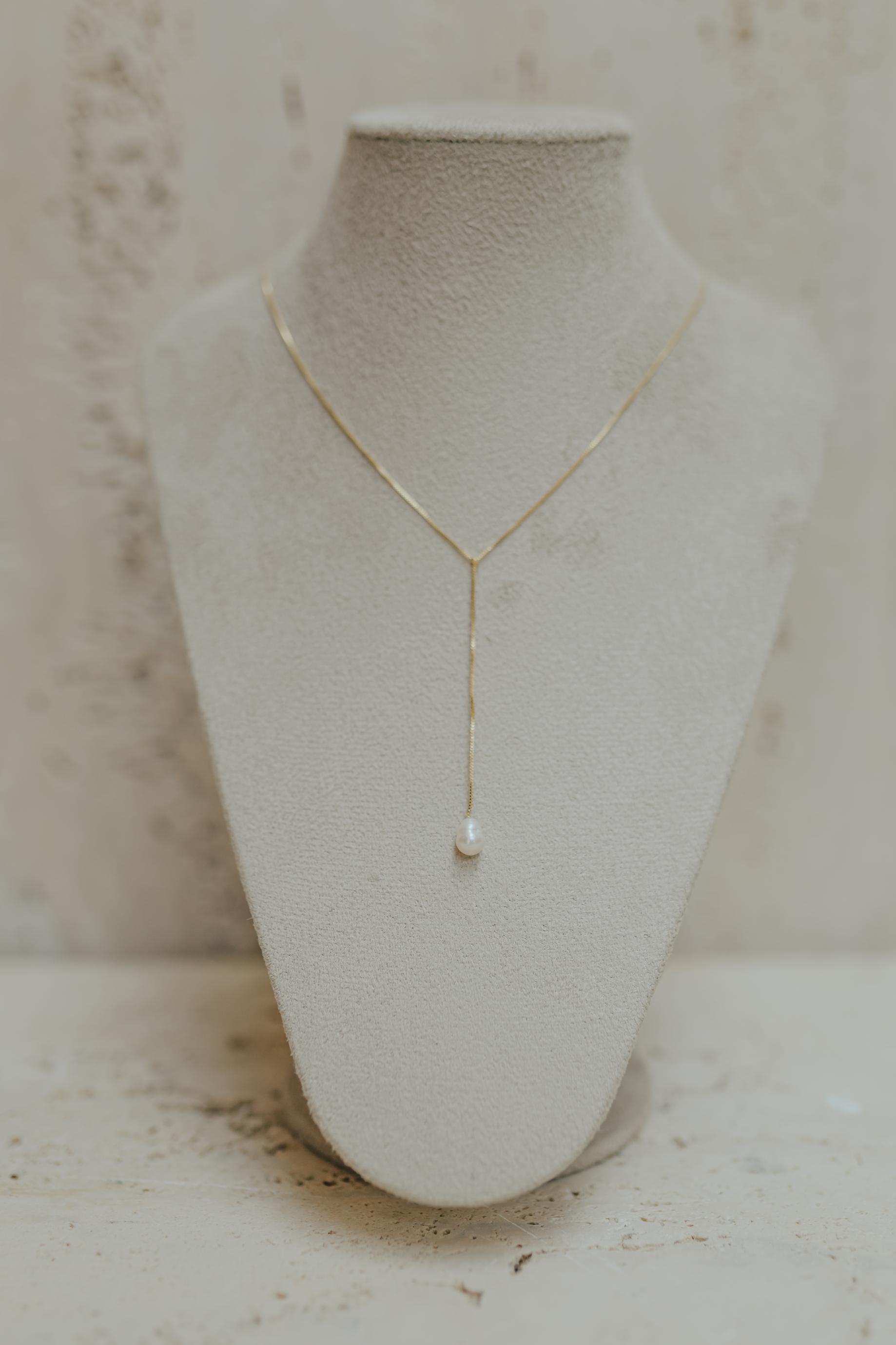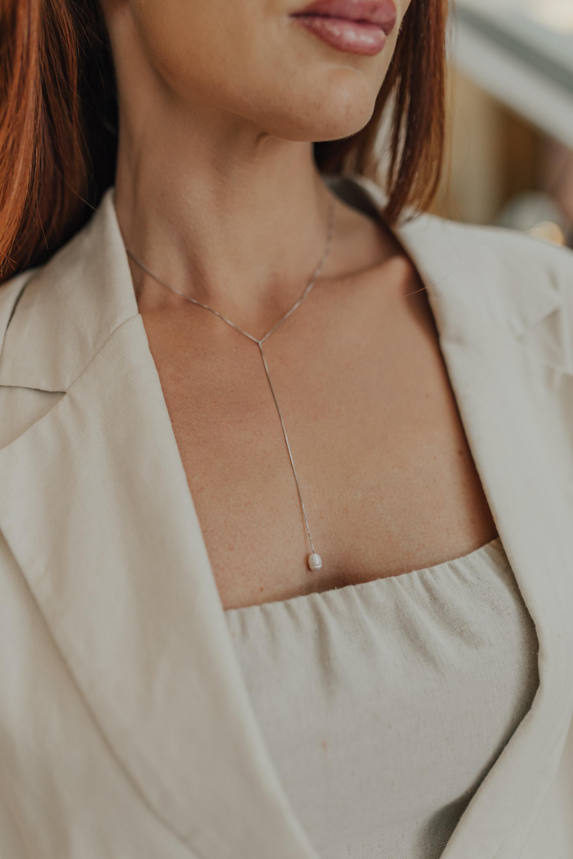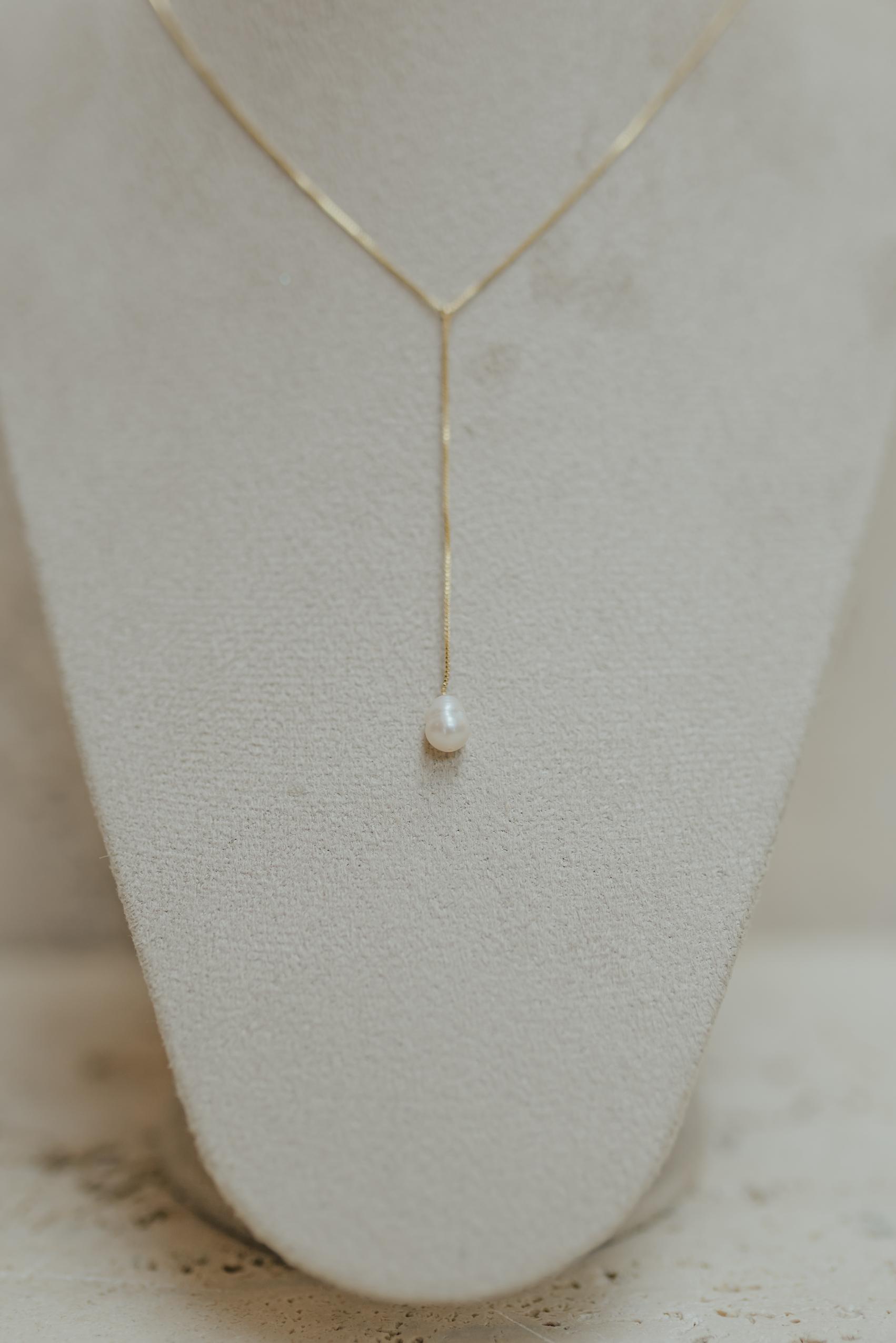 Colar no estilo gravata com detalhe de pérola de água doce bem joinha, disponível no banho de ouro 18k e ródio branco.