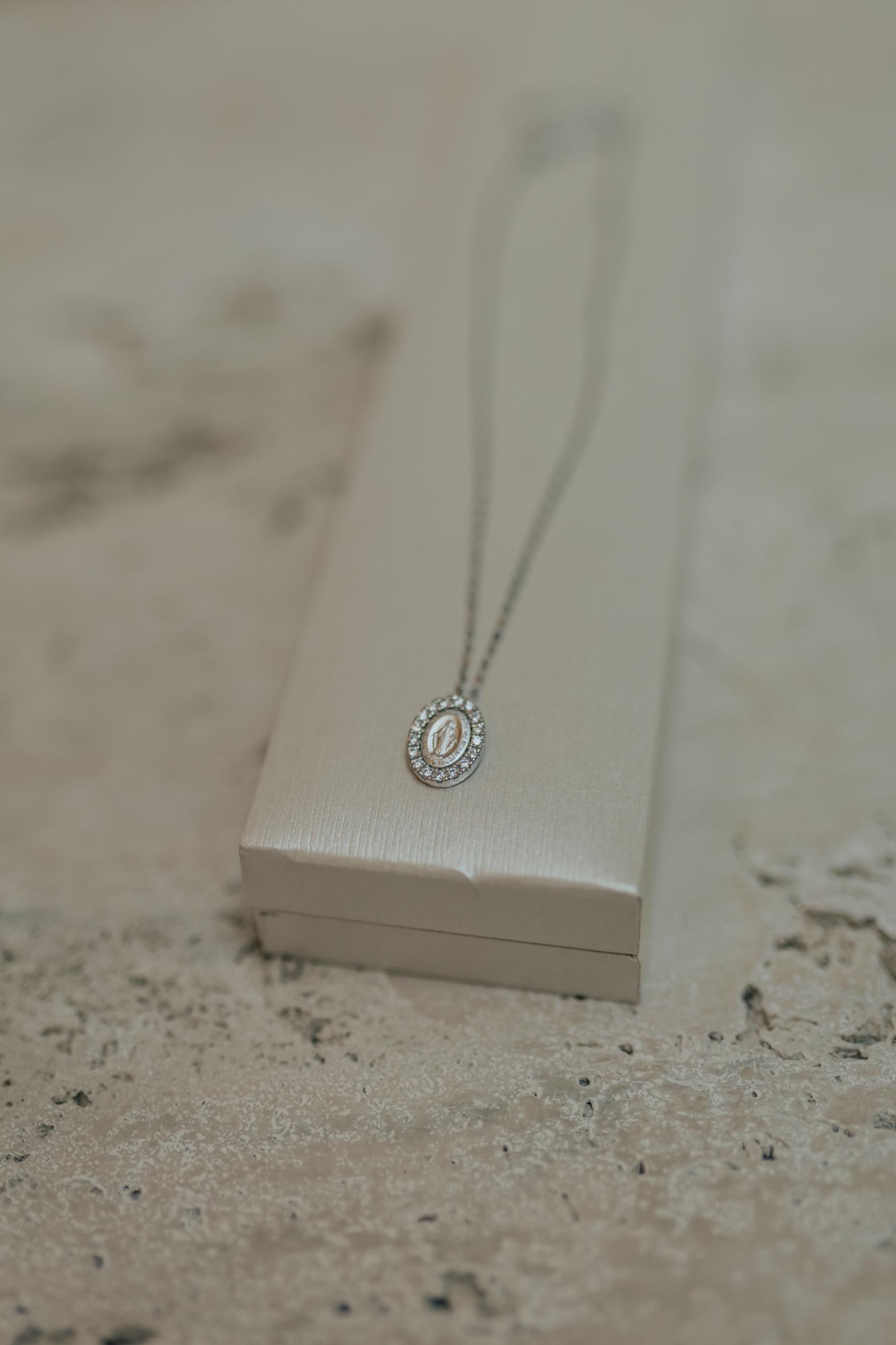 Colar com pingente de Nossa Senhora das Graças e Medalha Milagrosa na prata 925 e banho de ródio branco.