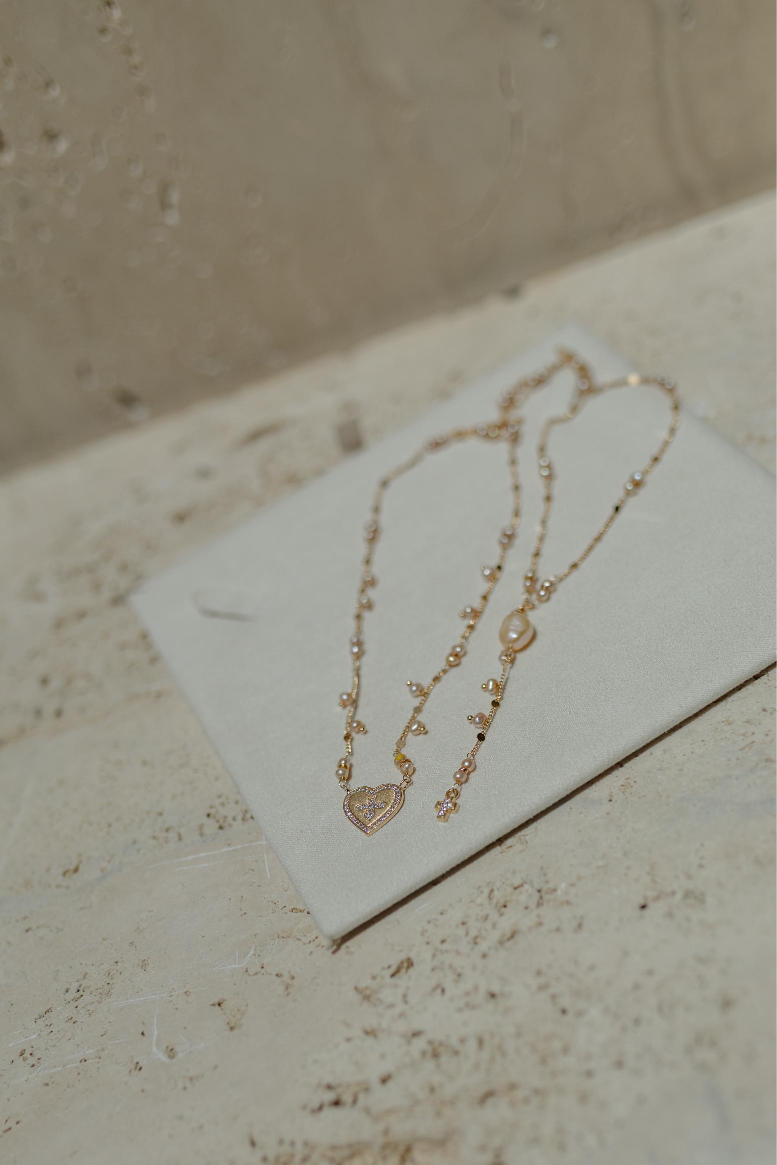 Colar Longo Pérolas Água Doce Coração e Crucifixo Dourado
