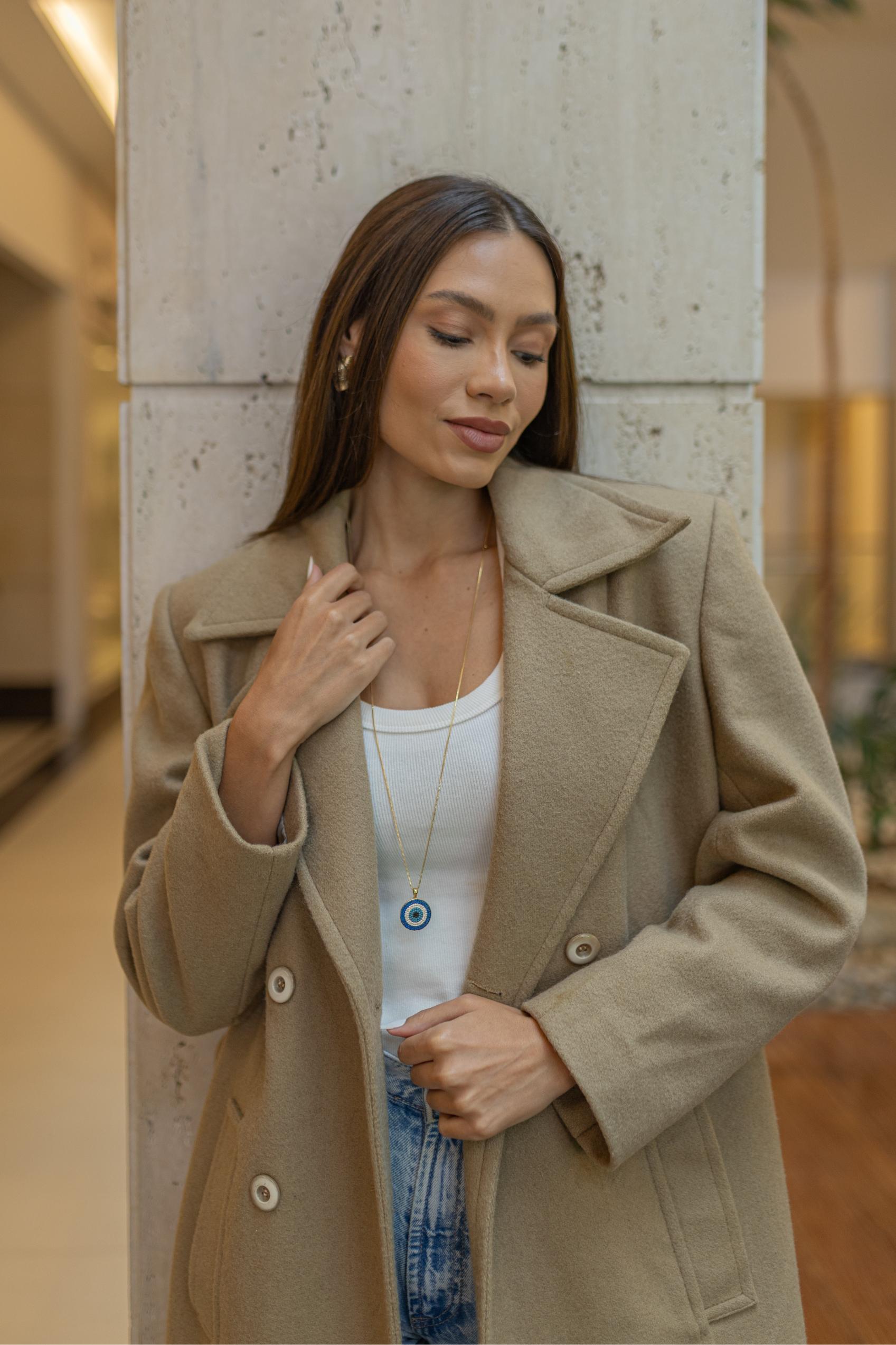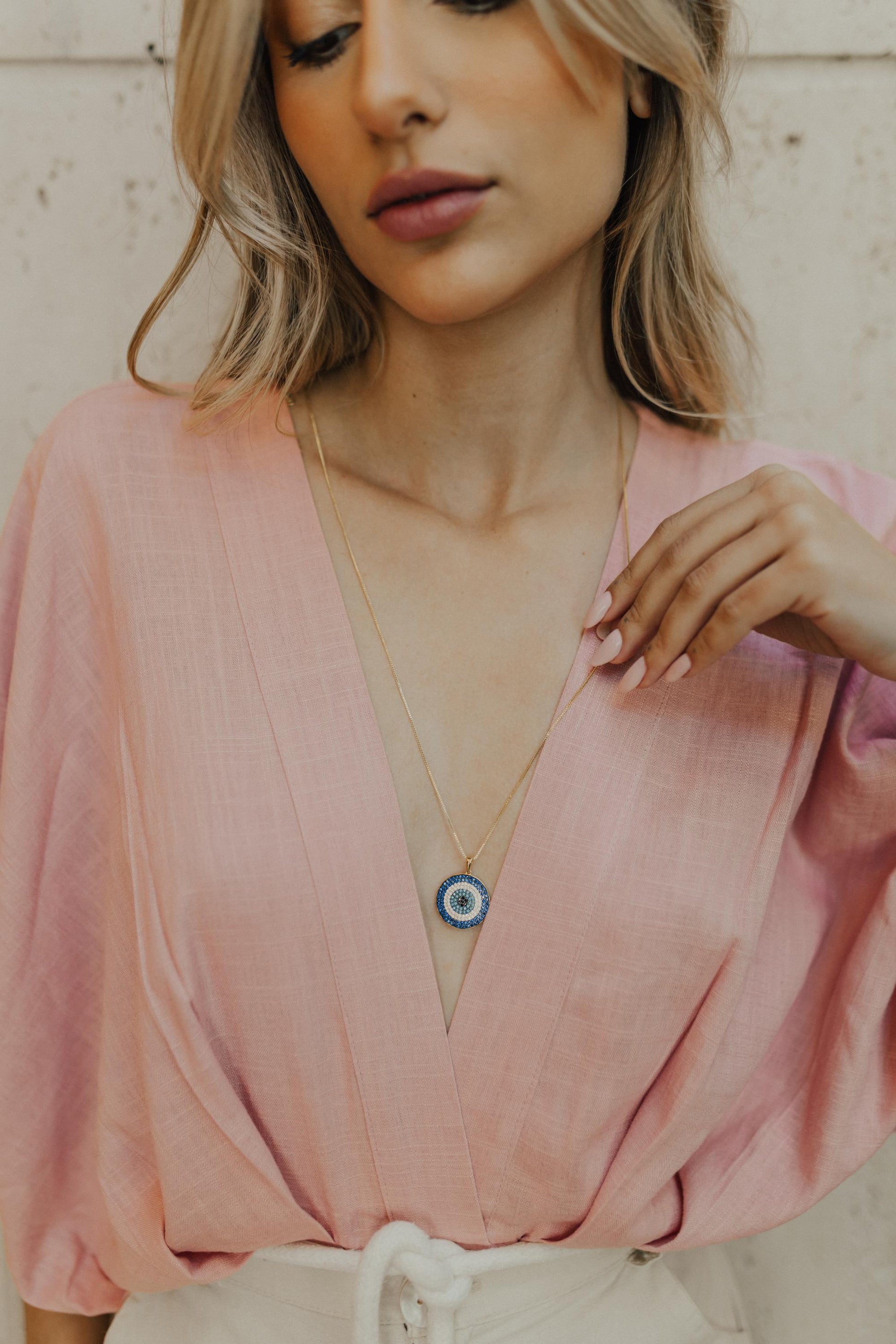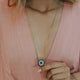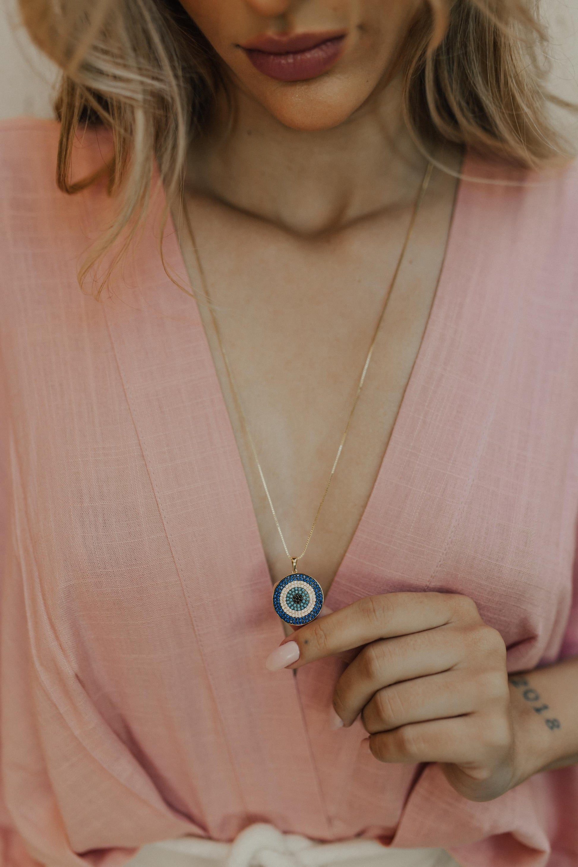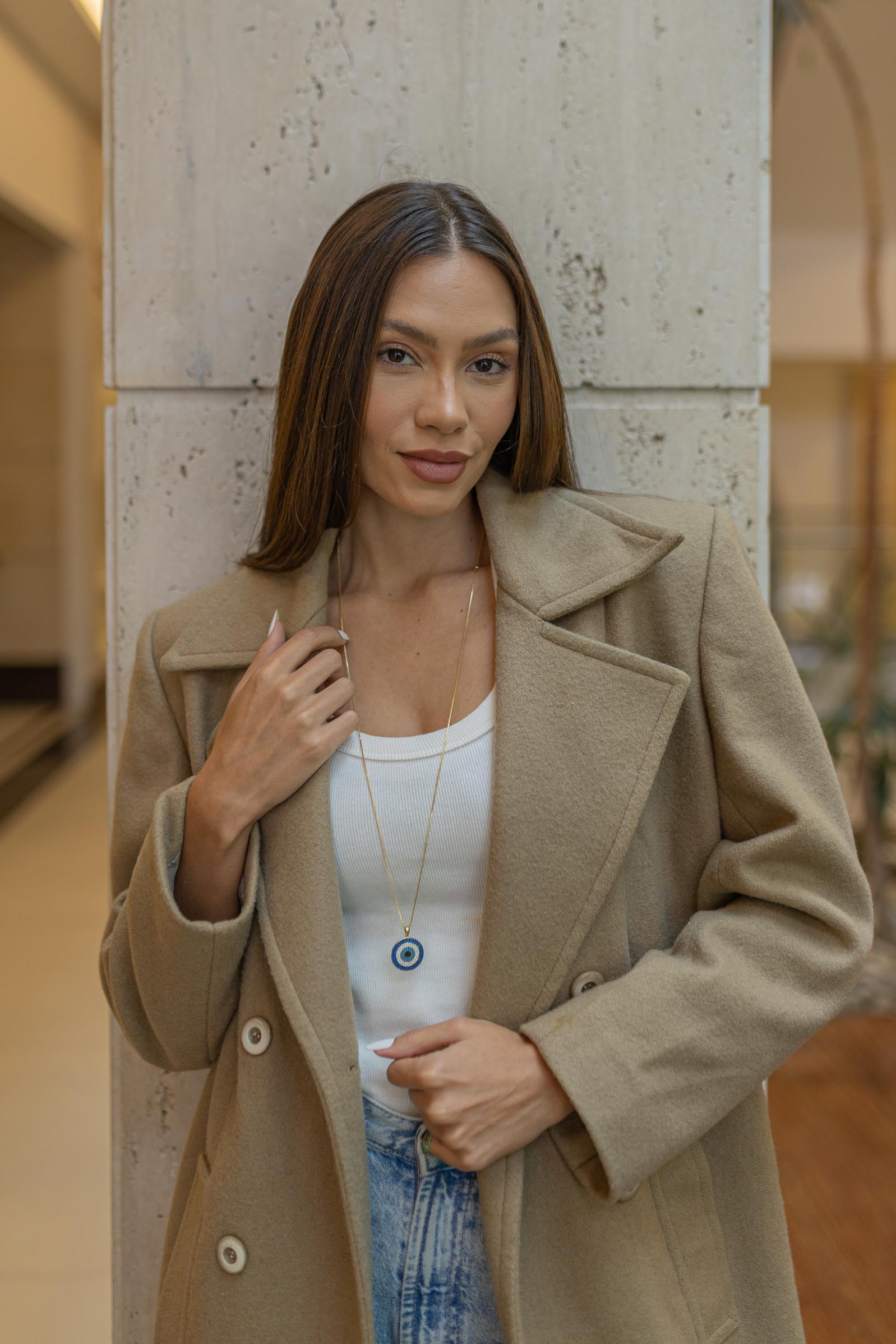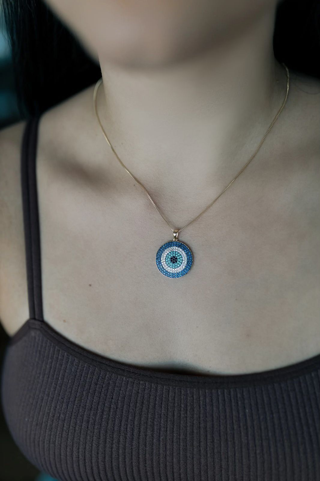 Colar com pingente mandala de olho grego cravejado com zircônias no banho de ouro 18k.