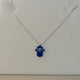 Colar com pingente de Mão de Fátima com resina azul e pingente de olho grego no banho de ródio branco.