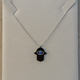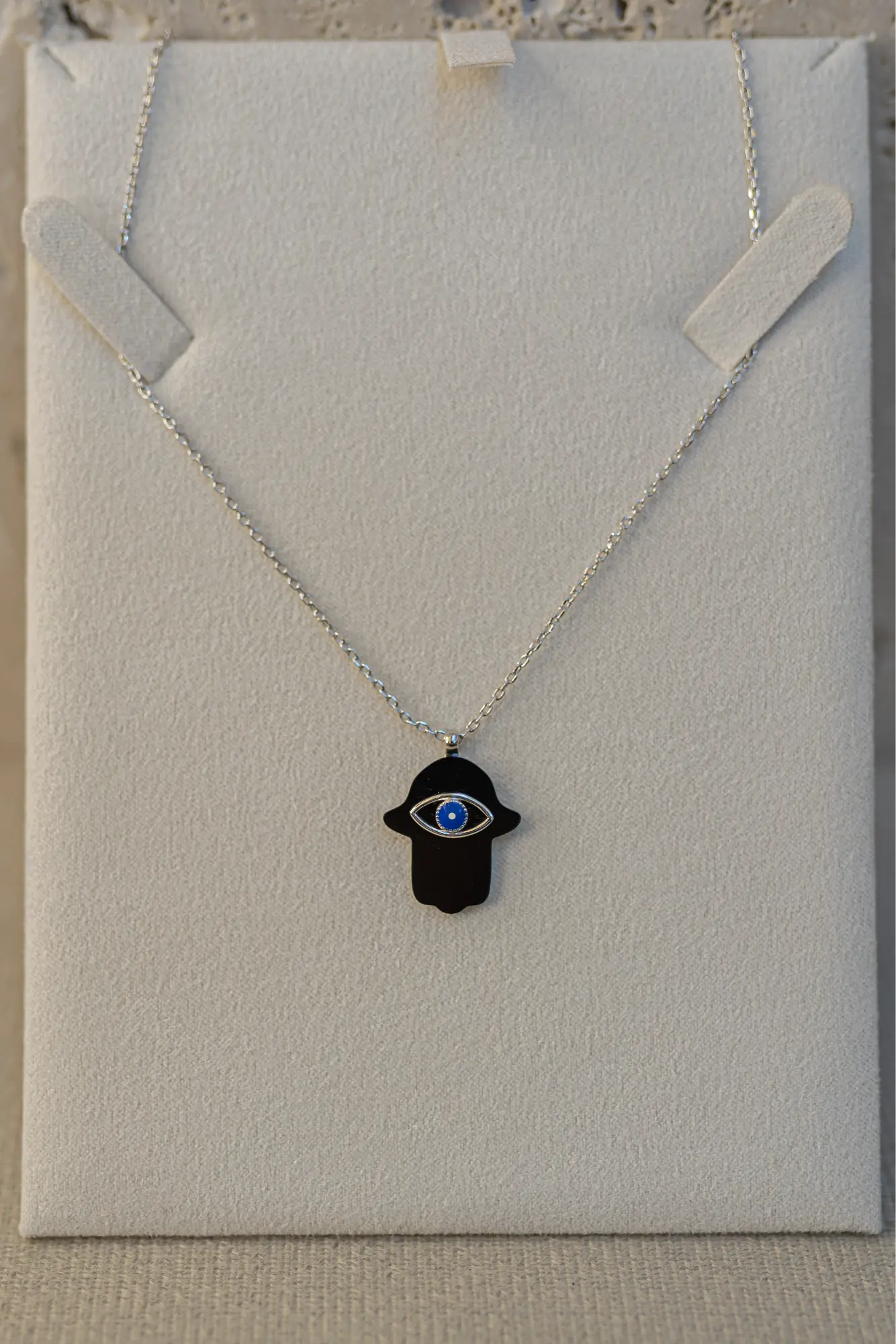 Colar com pingente de Mão de Fátima com resina preta e pingente de olho grego no banho de ródio branco.