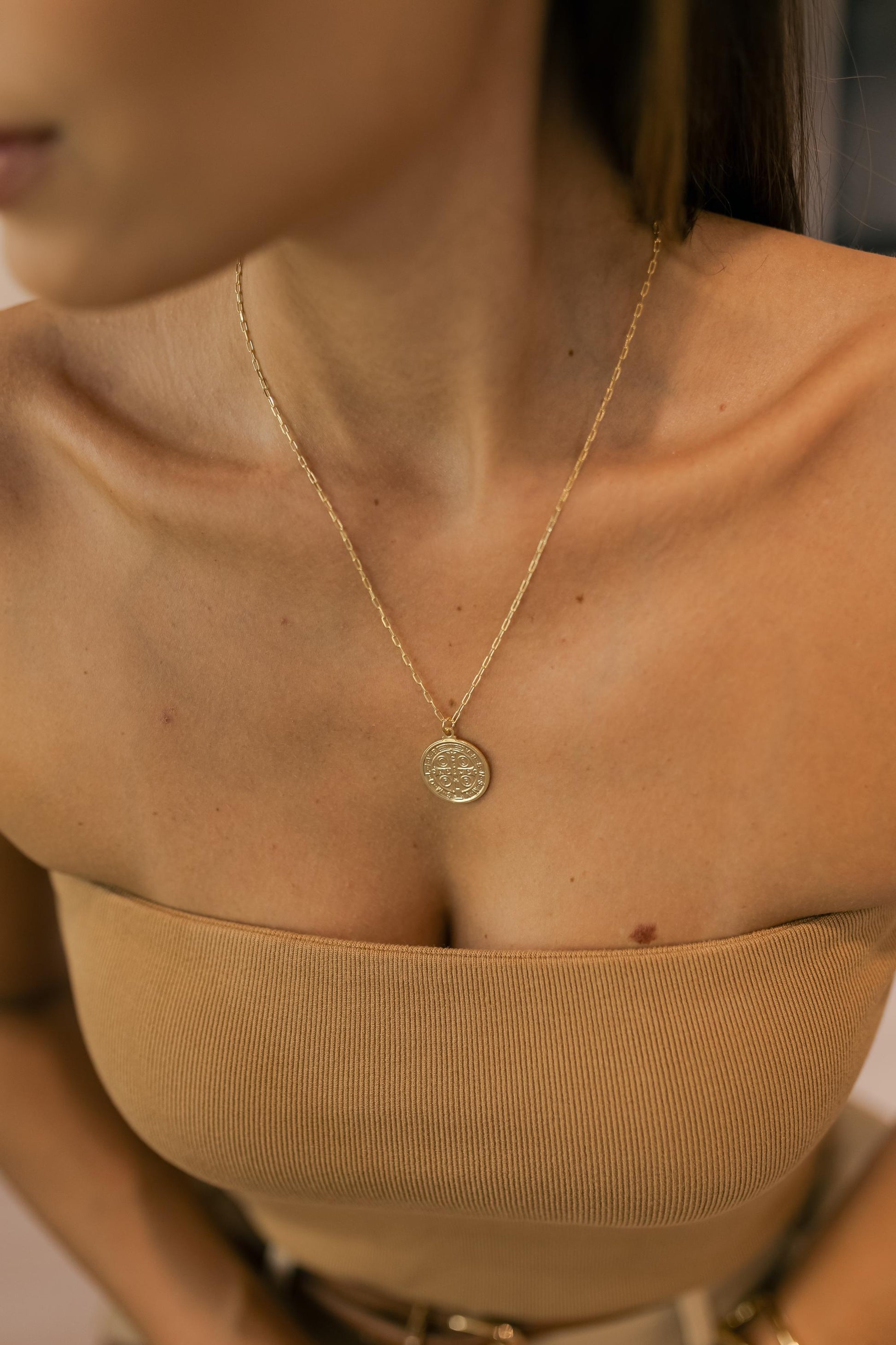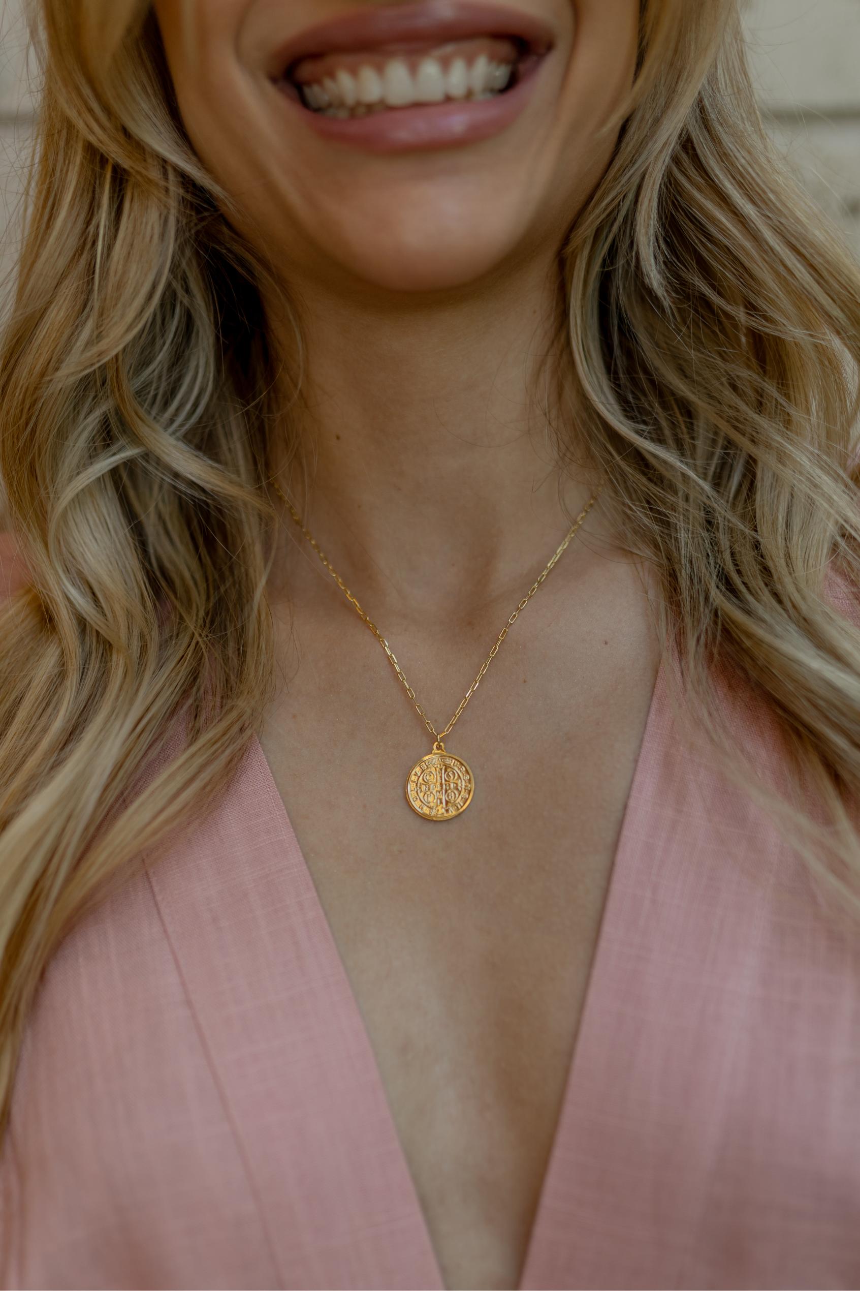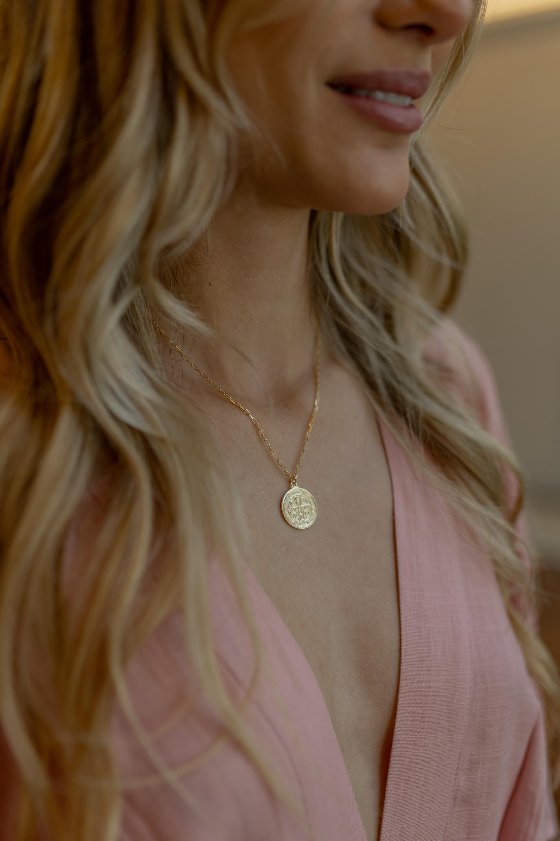 Colar de elos super delicados com pingente de medalha de São Bento no banho de ouro 18k.