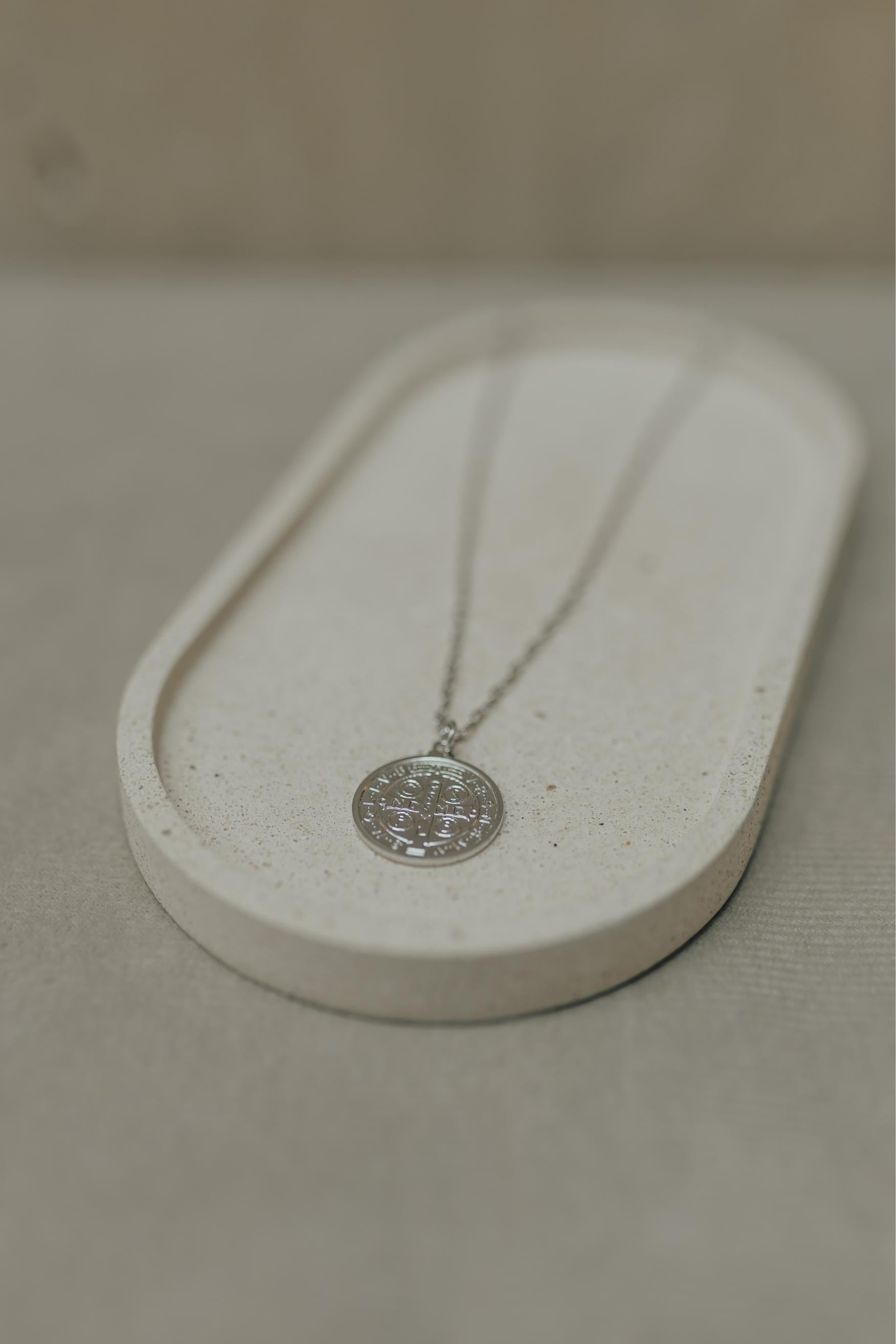 Colar de elos super delicados com pingente de medalha de São Bento no banho de Ródio Branco.