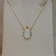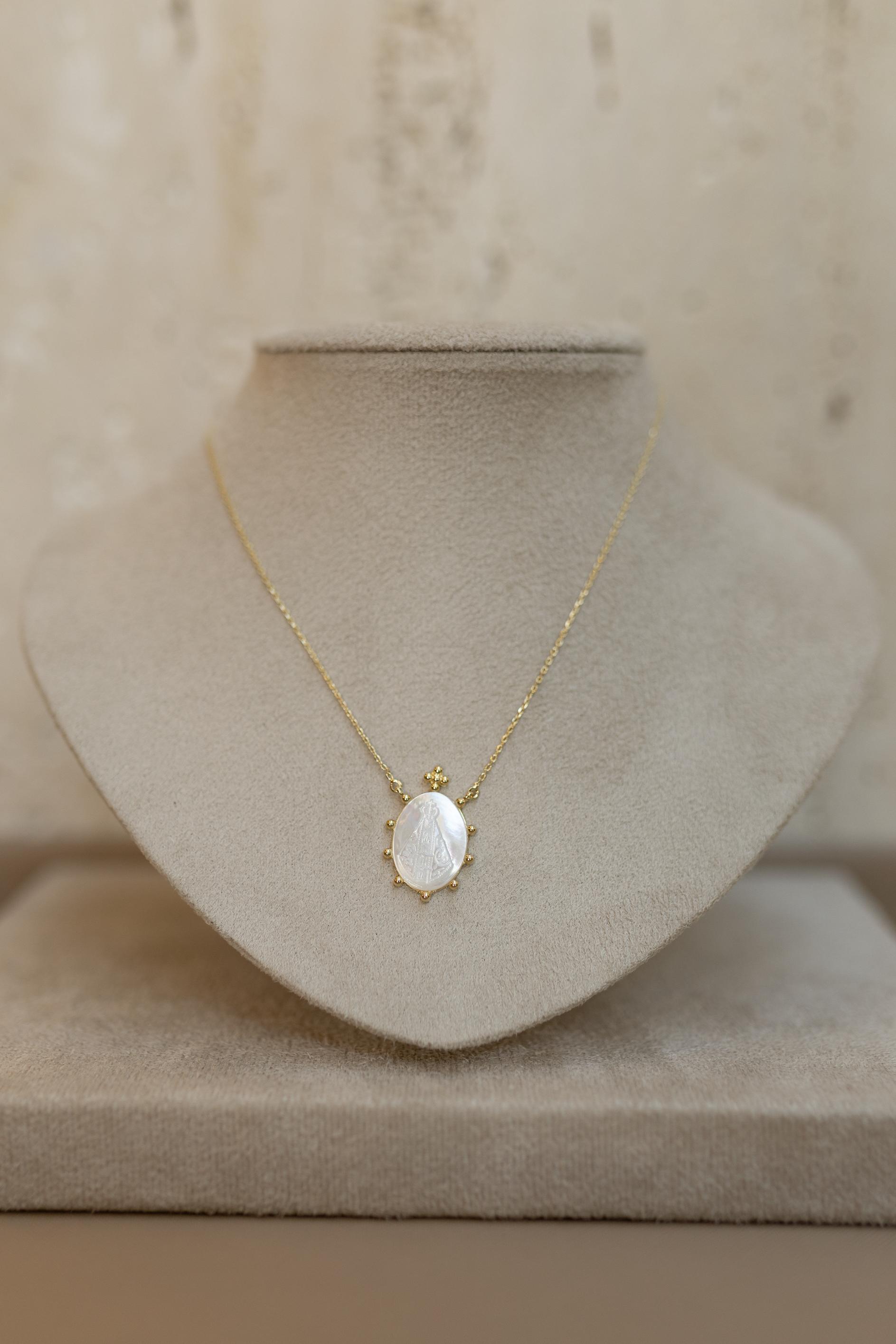 Colar com pingente fixo de Nossa Senhora Aparecida em madrepérola com esferas em toda sua volta e detalhe de cruz no banho de ouro 18k.