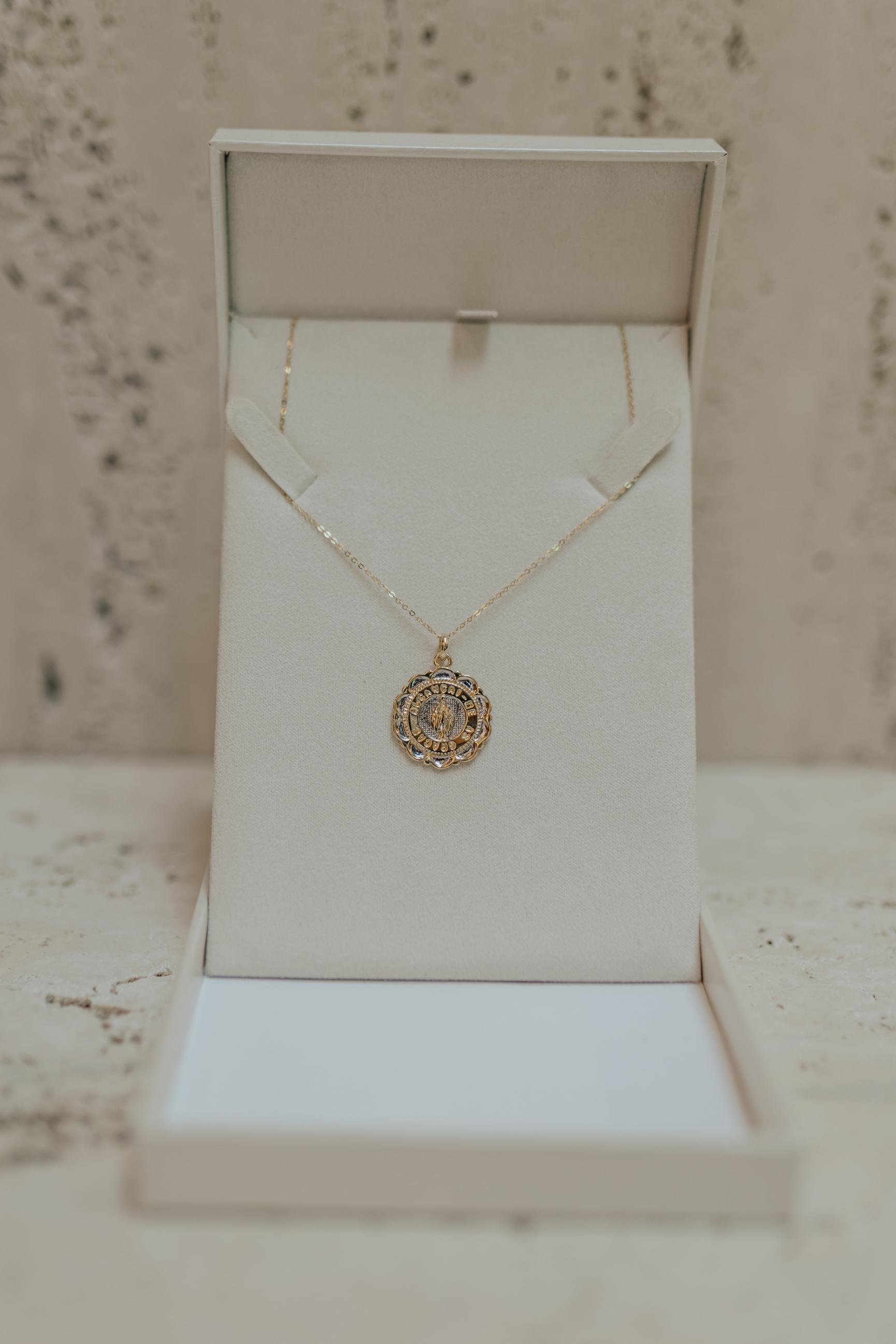 O colar de Nossa Senhora das Graças é composto por uma corrente veneziana, com uma medalha com a imagem de Nossa Senhora das Graças no mix de banhos.