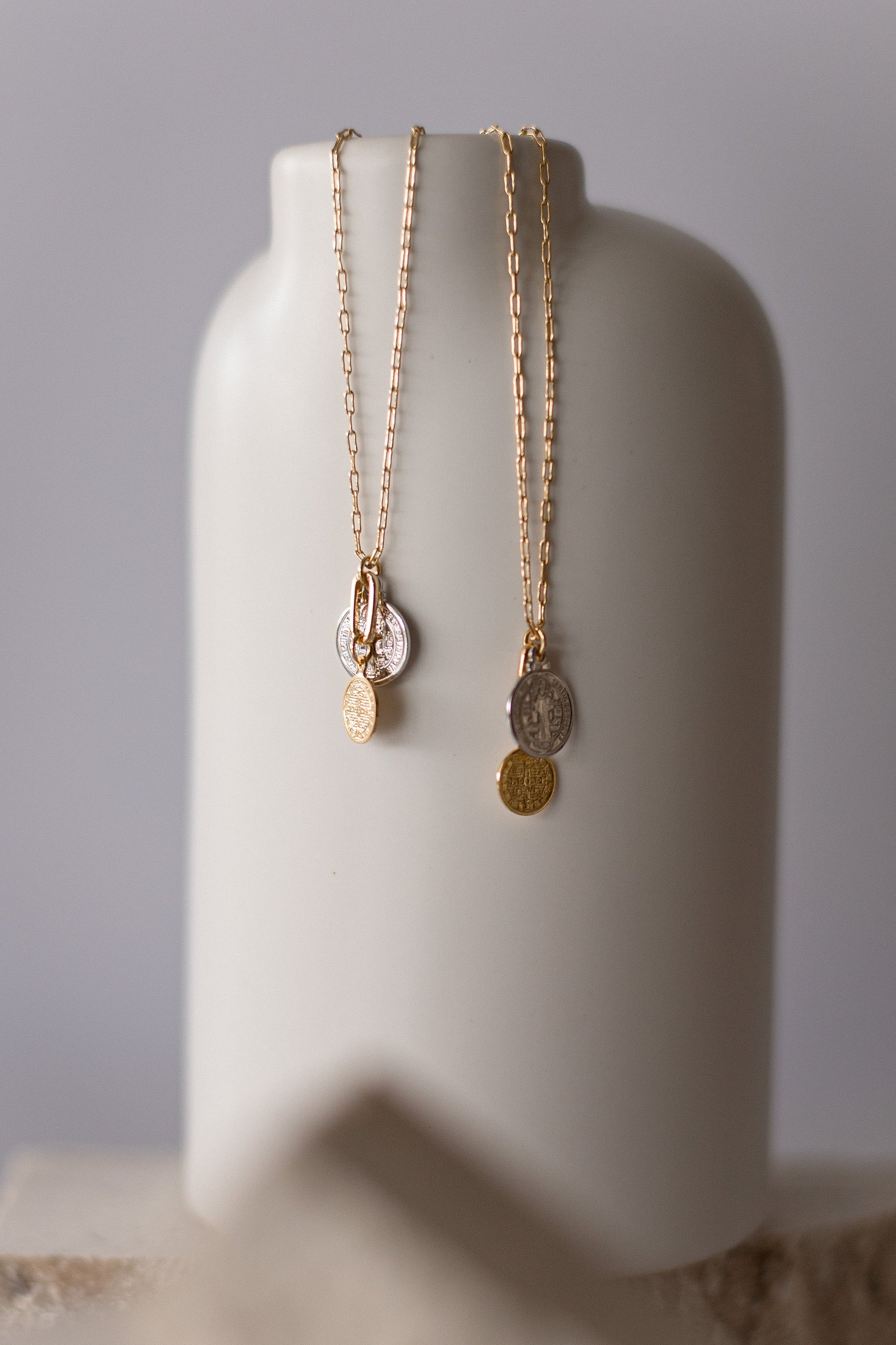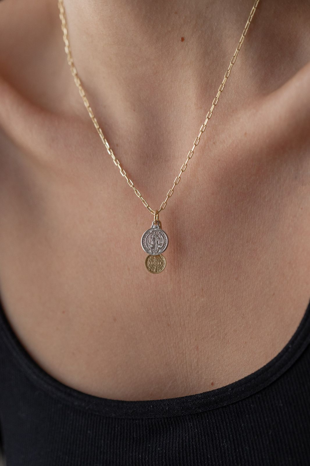 Este colar é uma peça especial que combina a proteção da medalha de São Bento com a elegância do banho em ouro 18k. Com uma corrente dourada e dois pingentes de medalha, um ouro e outro prata, este colar é perfeito para quem busca um acessório significativo e sofisticado.