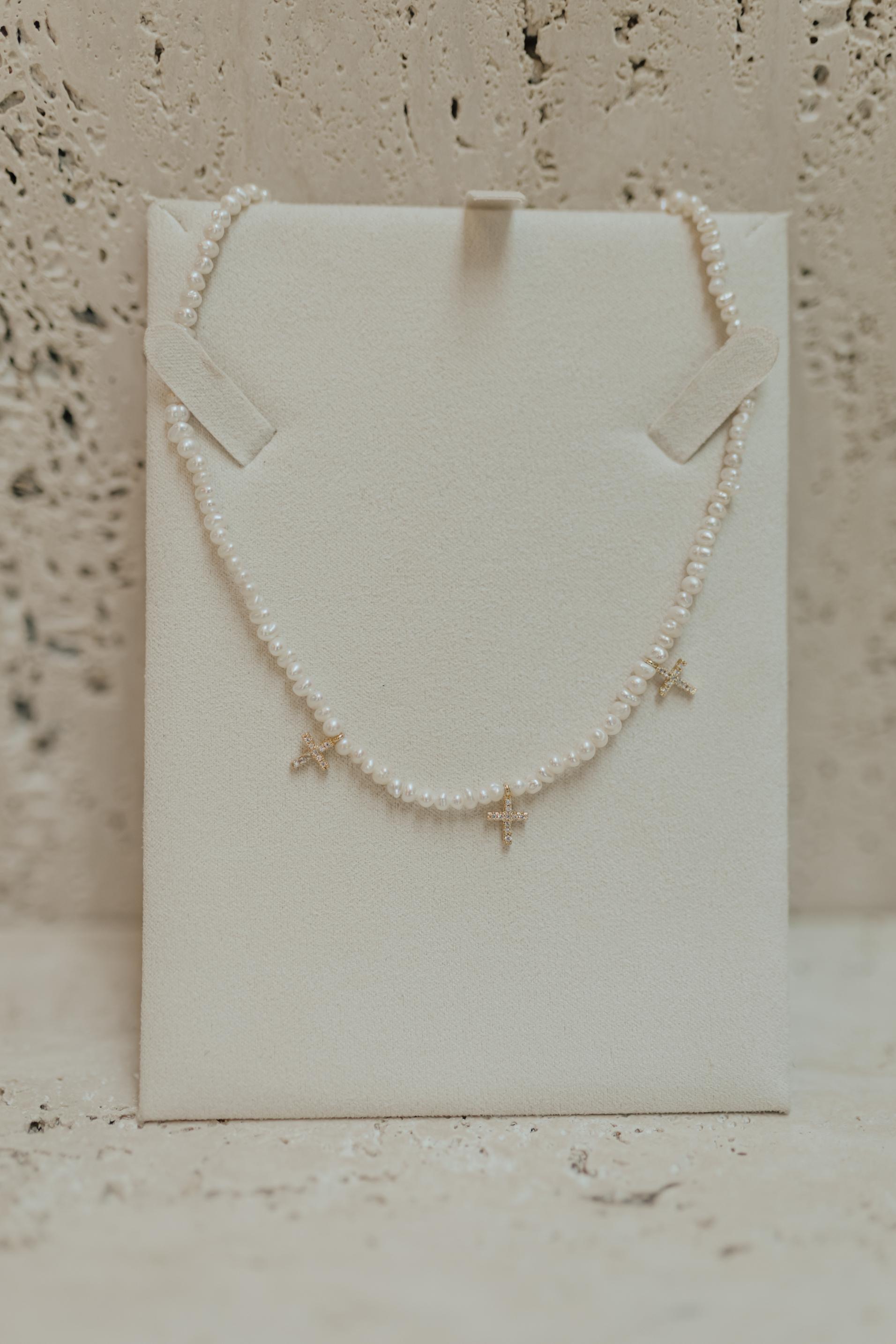 Colar com micropérolas de água doce com 3 crucifixos cravejadas na prata 925 e banho de ouro 18k.