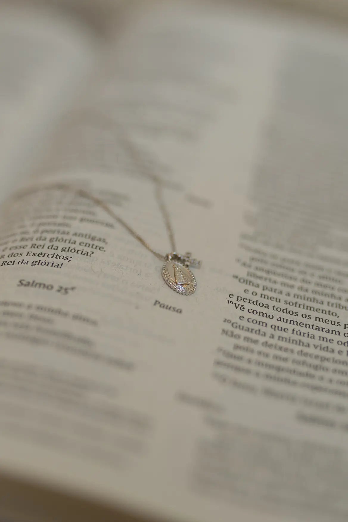 Colar super delicado com pingente de medalha de Nossa Senhora Aparecida e crucifixo cravejado com zircônias no banho de ródio branco.