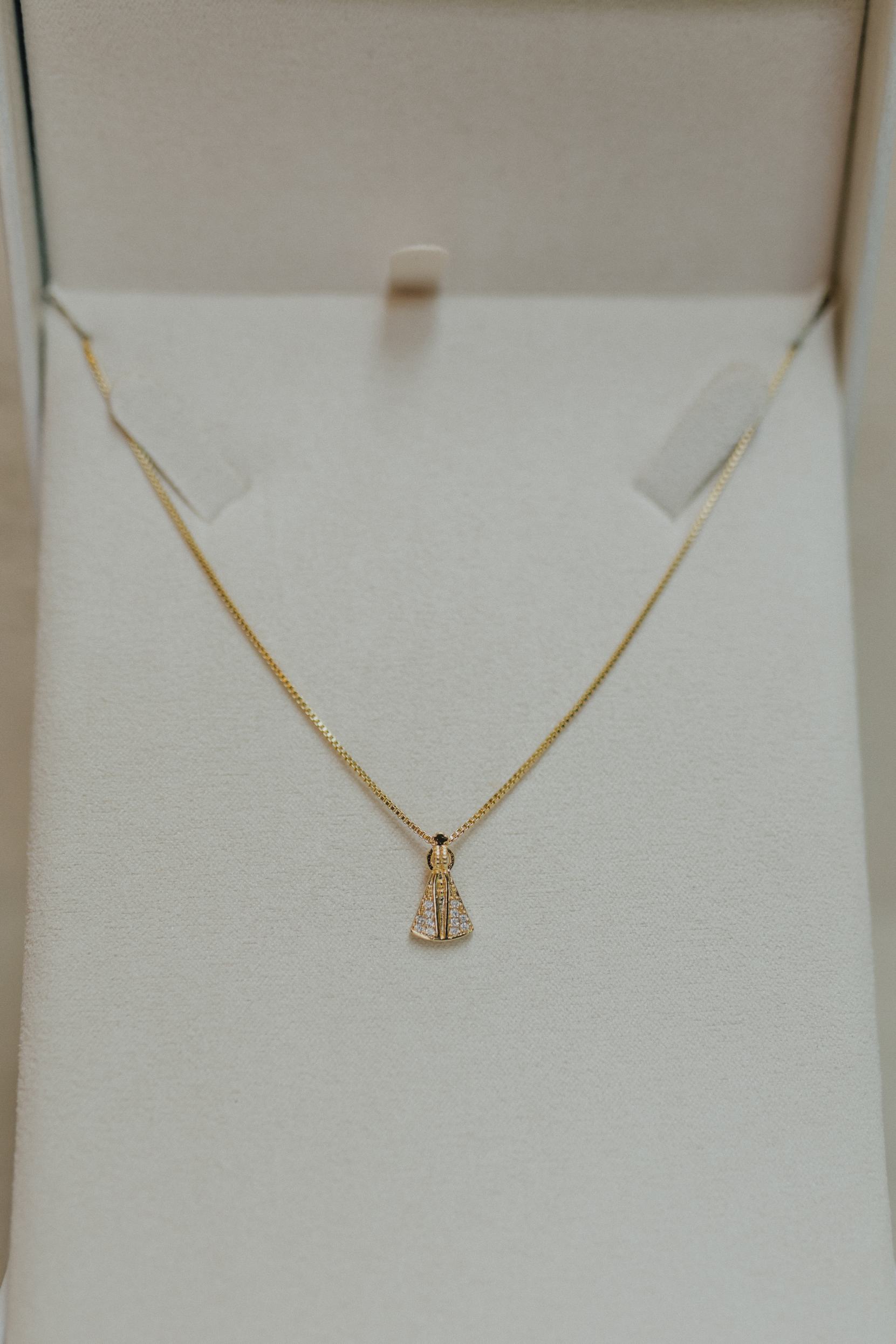 Colar de Nossa Senhora Aparecida manto cravejado com zircônias cor cristal no banho de ouro 18k.