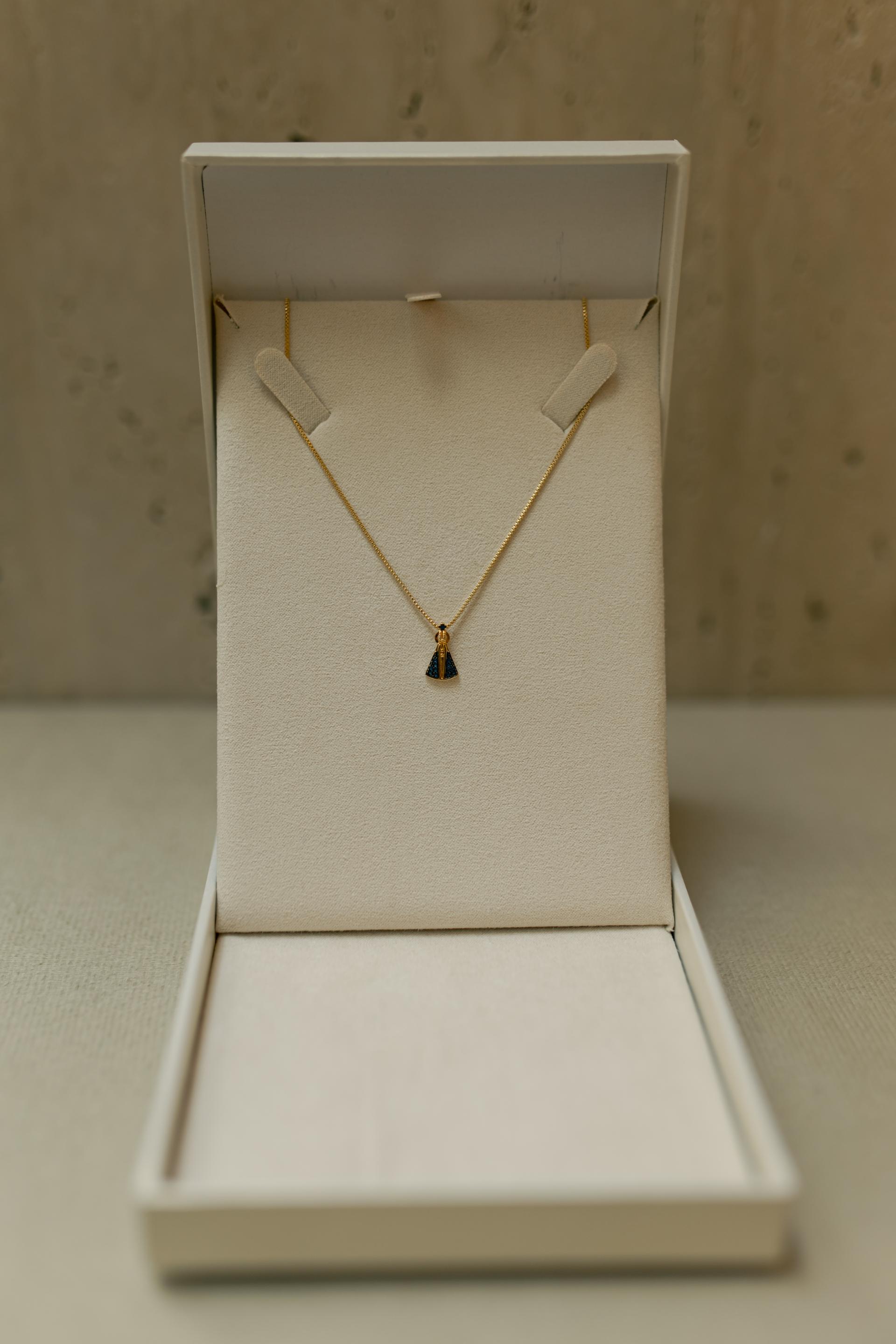 Colar de Nossa Senhora Aparecida no banho de ouro 18k composto por corrente veneziana super delicada e pingente pequeno de Nossa Senhora Aparecida com zircônias cravejadas na cor azul.
