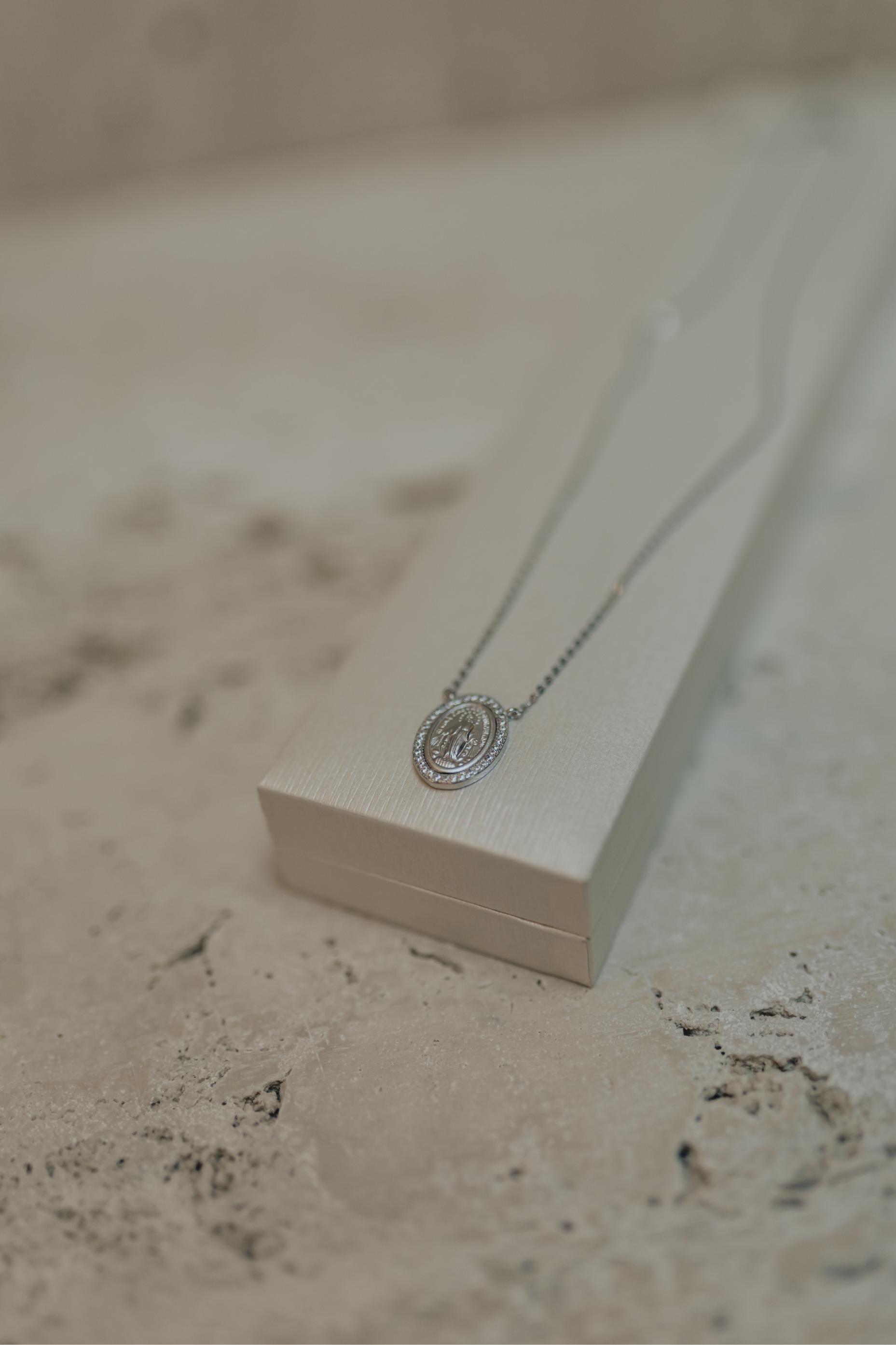Colar de elos português de Nossa Senhora das Graças e Medalha Milagrosa com borda cravejada na prata 925 e banho de ródio branco.
