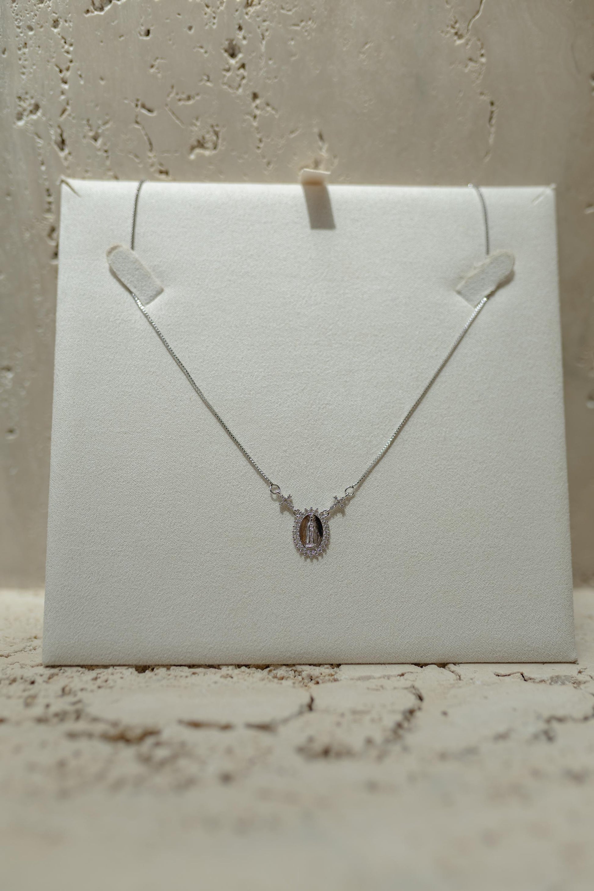 Colar de Nossa Senhora das Graças no banho de Ródio Branco com detalhe cravejado em toda a borda.