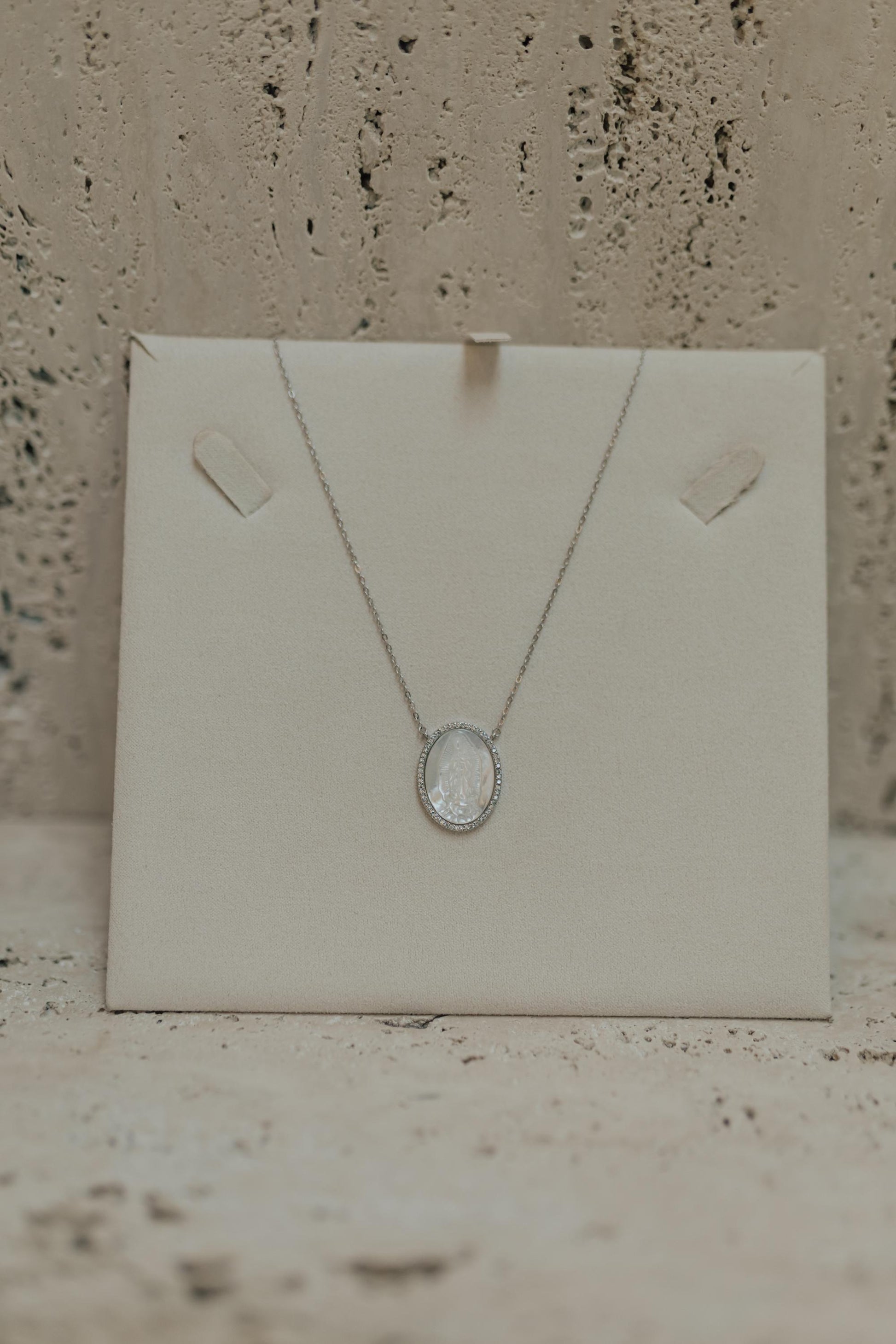 Colar de Nossa Senhora de Guadalupe em madrepérola com cravação ao redor da medalha na prata 925 e banho de ródio branco.