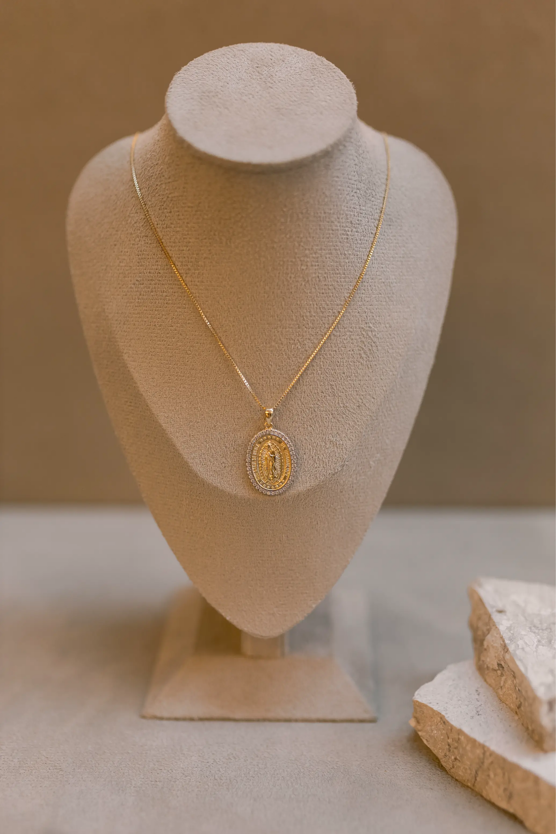 Colar em malha veneziana com pingente oval com imagem de Nossa Senhora de Guadalupe com borda cravejado de zircônias na cor cristal no banho de ouro 18k.