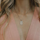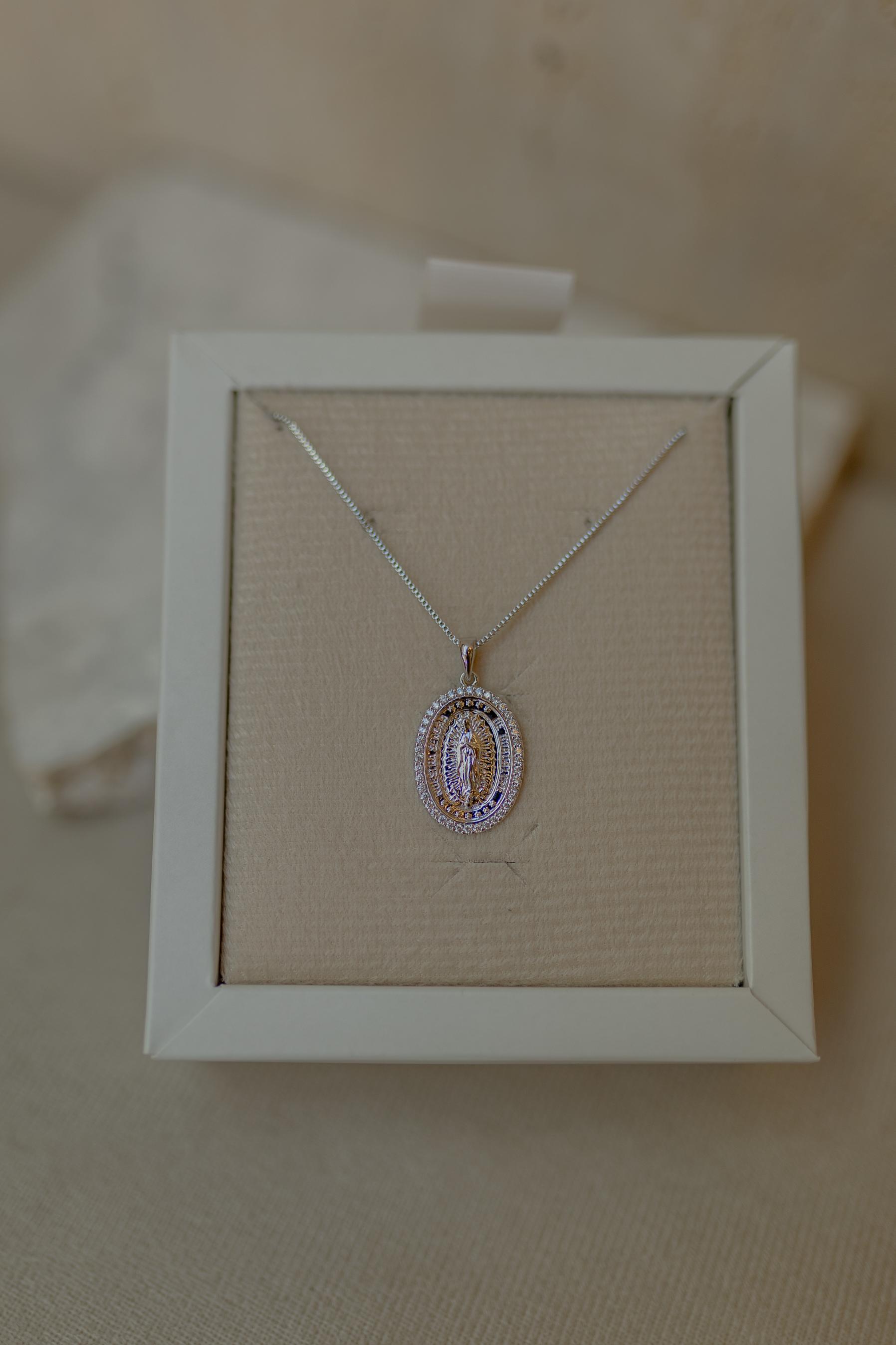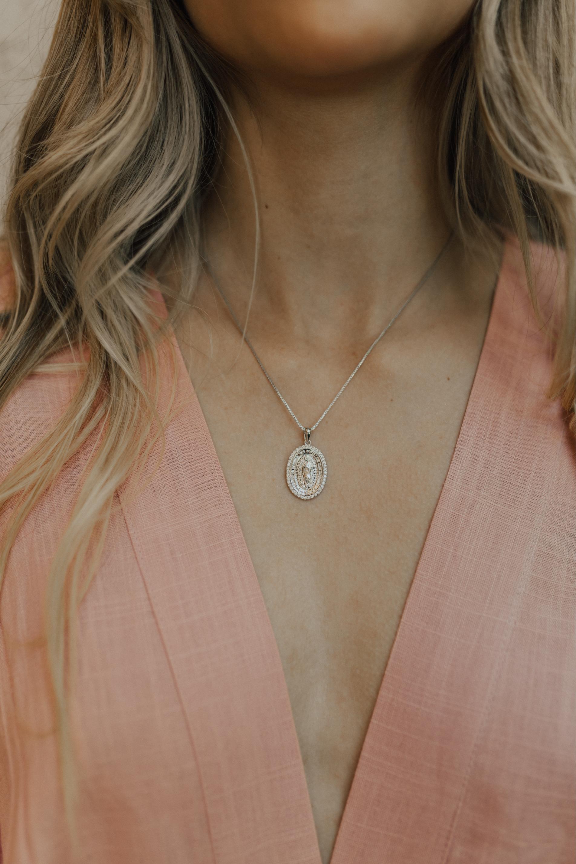 Colar em malha veneziana com pingente oval com imagem de Nossa Senhora de Guadalupe com borda cravejado de zircônias na cor cristal no banho de Ródio Branco.
