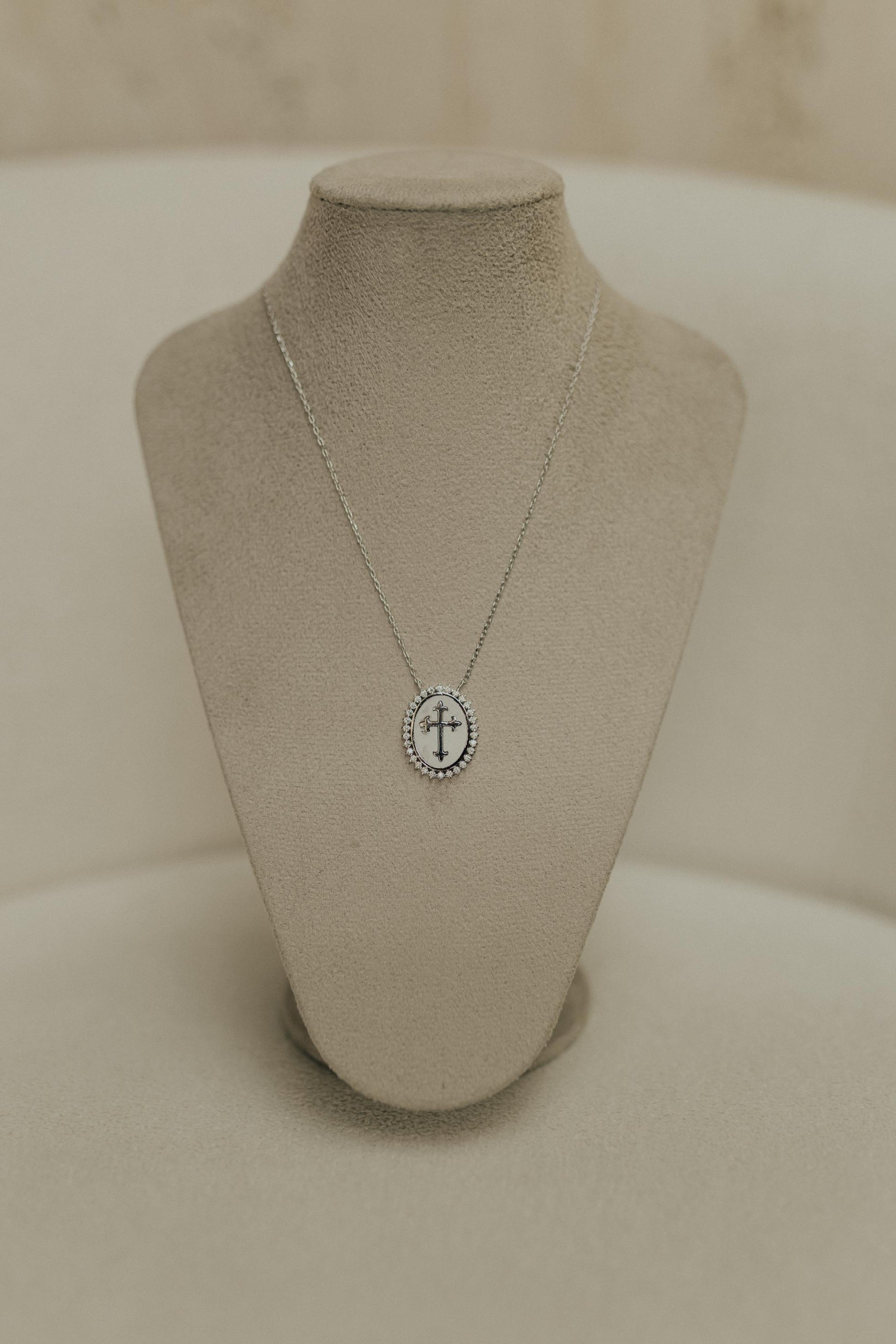 Colar Oval Cravejado com escrita (Pai, nas tuas mão entrego o meu espírito) no banho de ródio branco.
