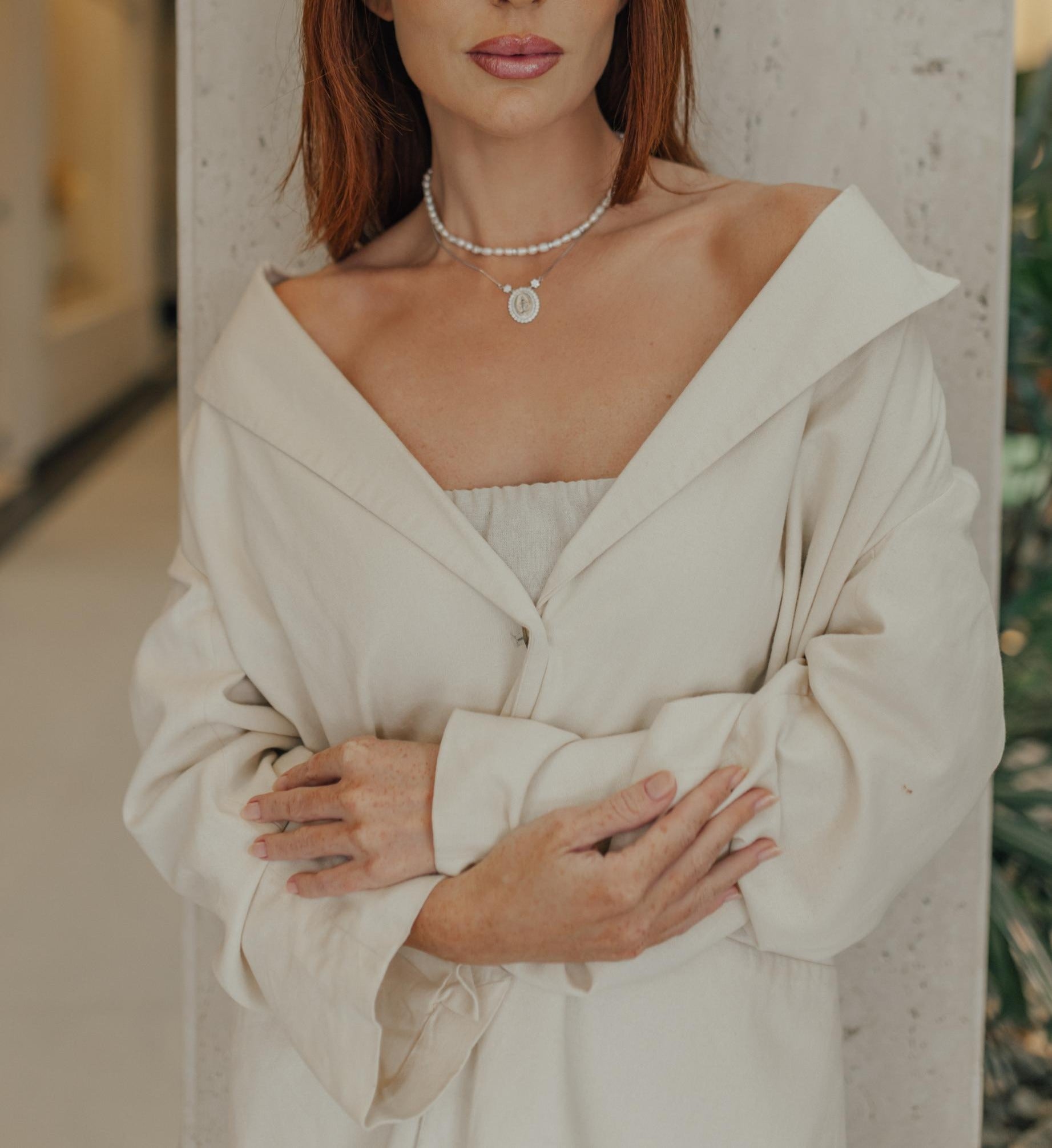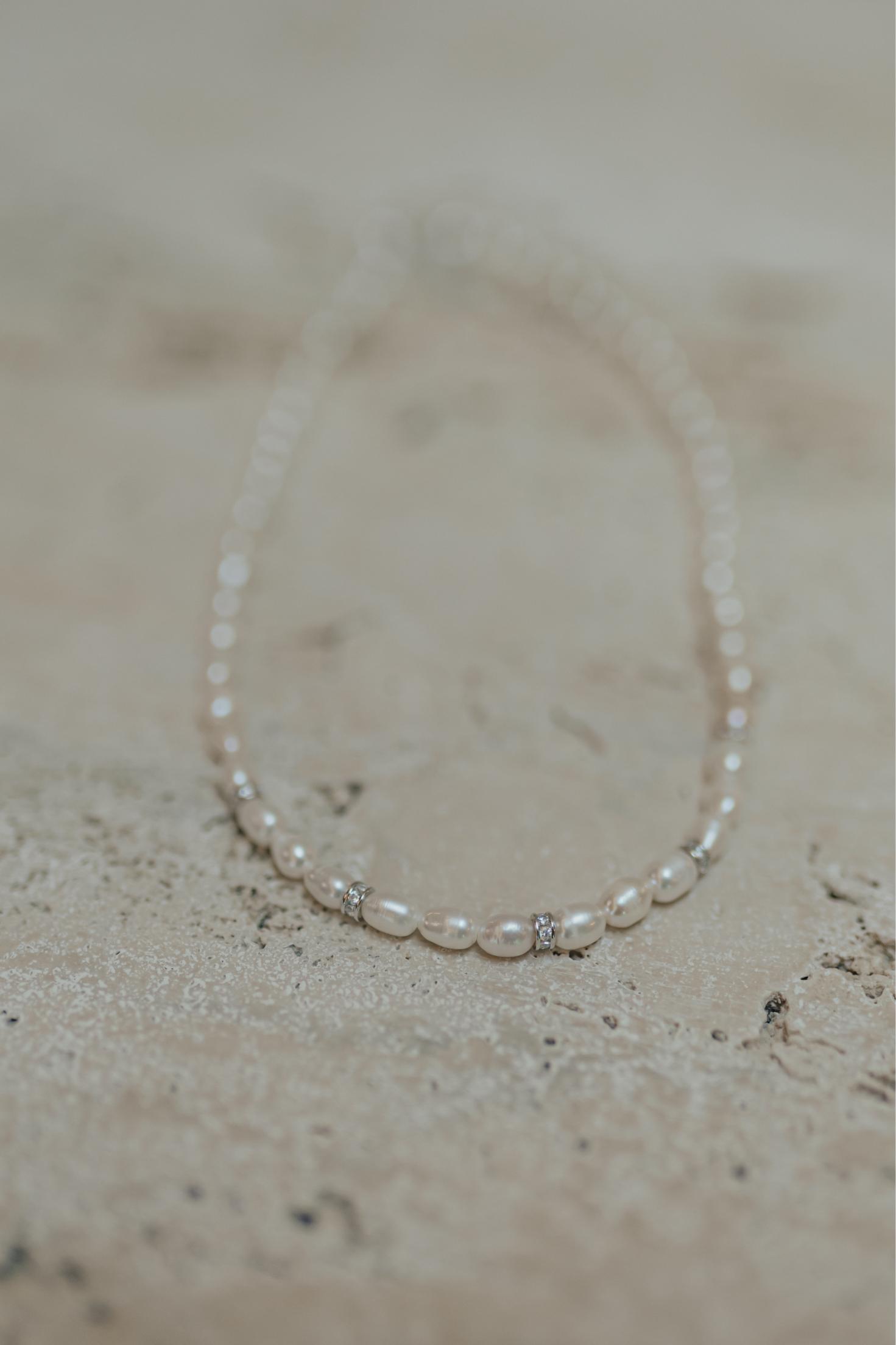 Colar com micropérolas de água doce com entremeios cravejados na prata 925 e banho de ródio branco.