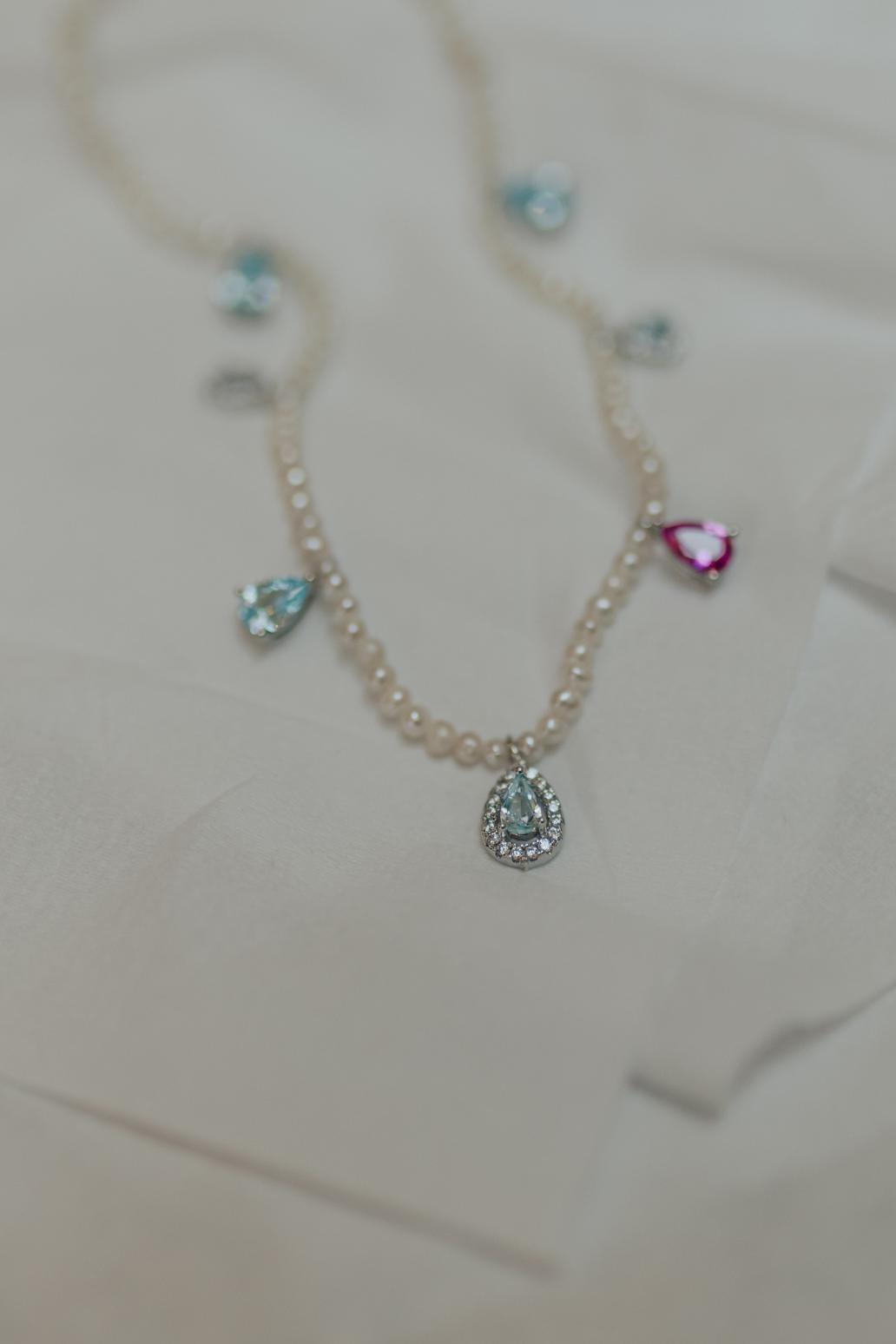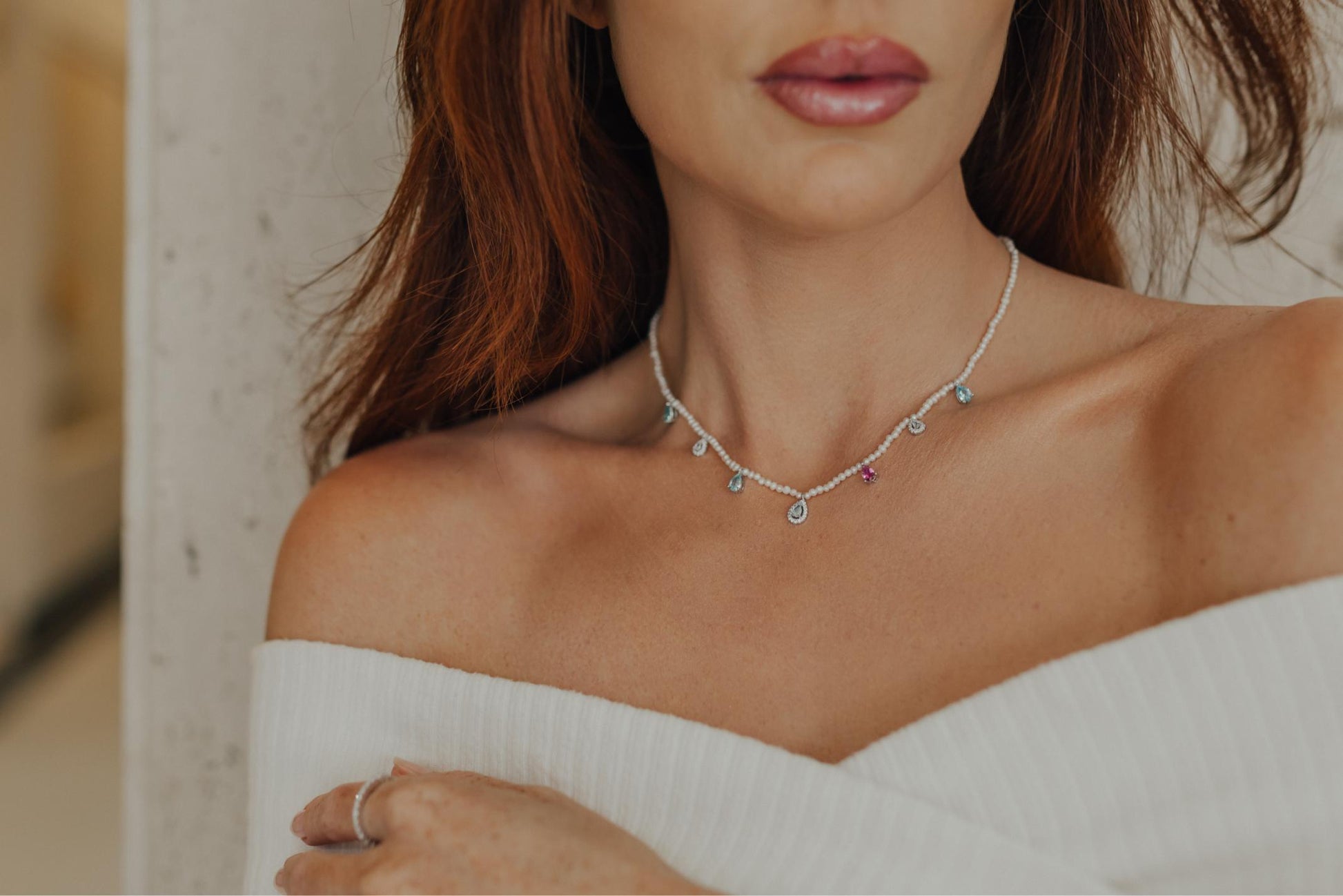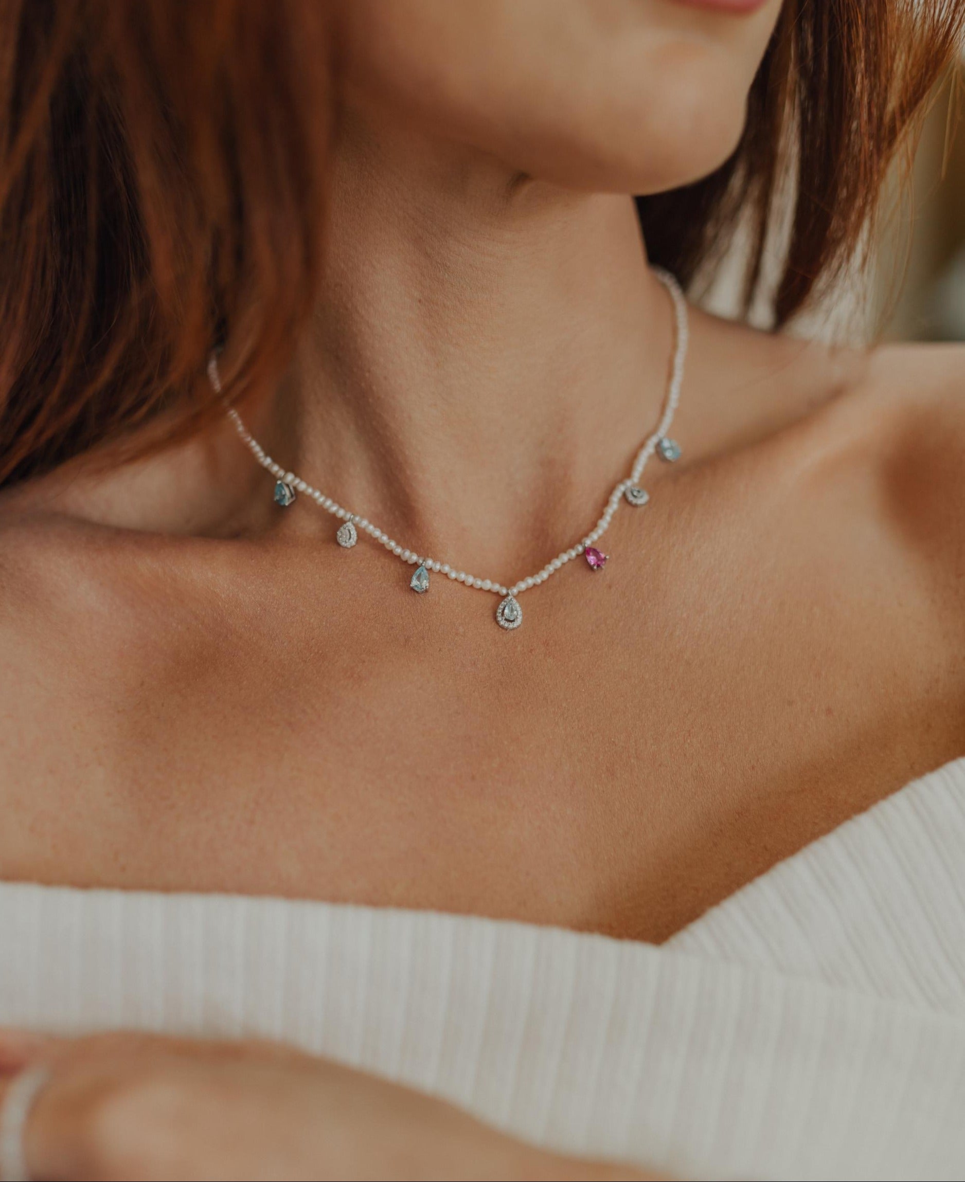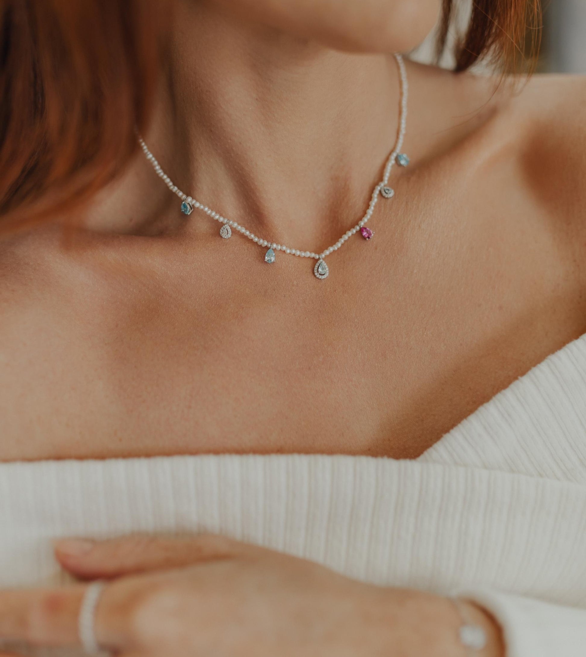 Colar todo de micropérolas de água doce com 7 pingentes de gota coloridas na prata 925 e banho de ródio branco.