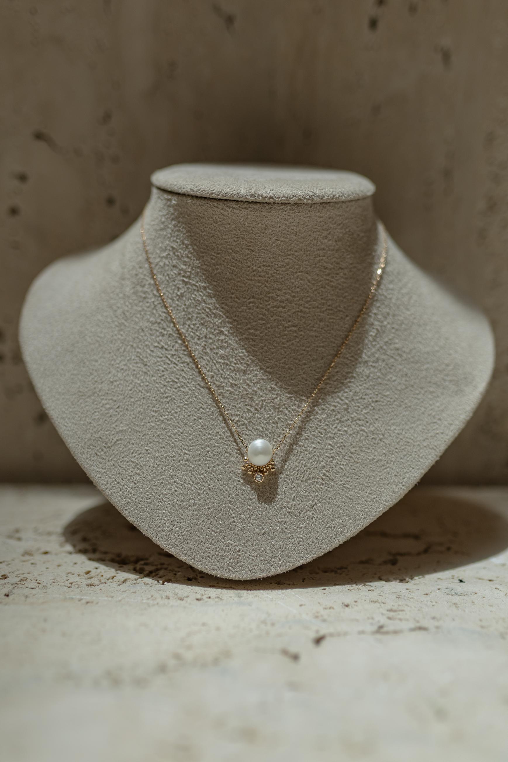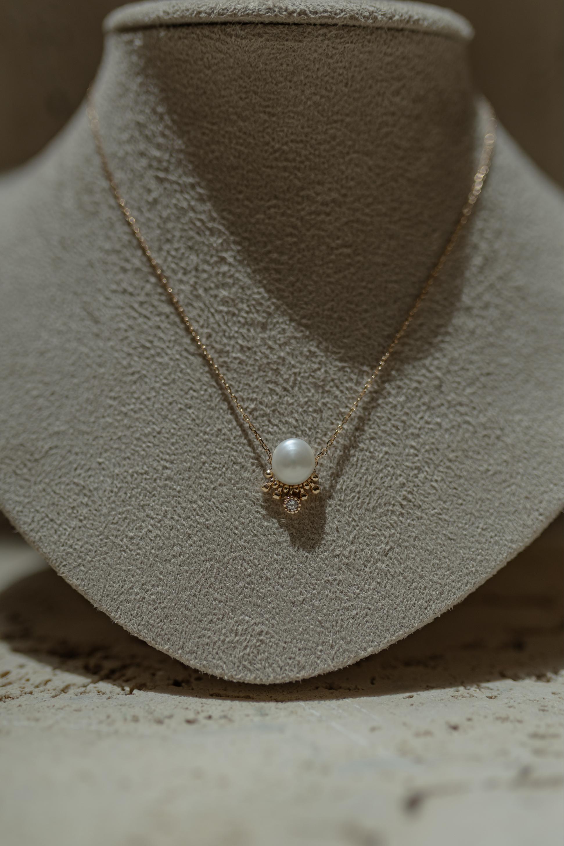 Colar pérola de água doce com detalhes de bolinha e flor cravejada no banho de ouro 18k.