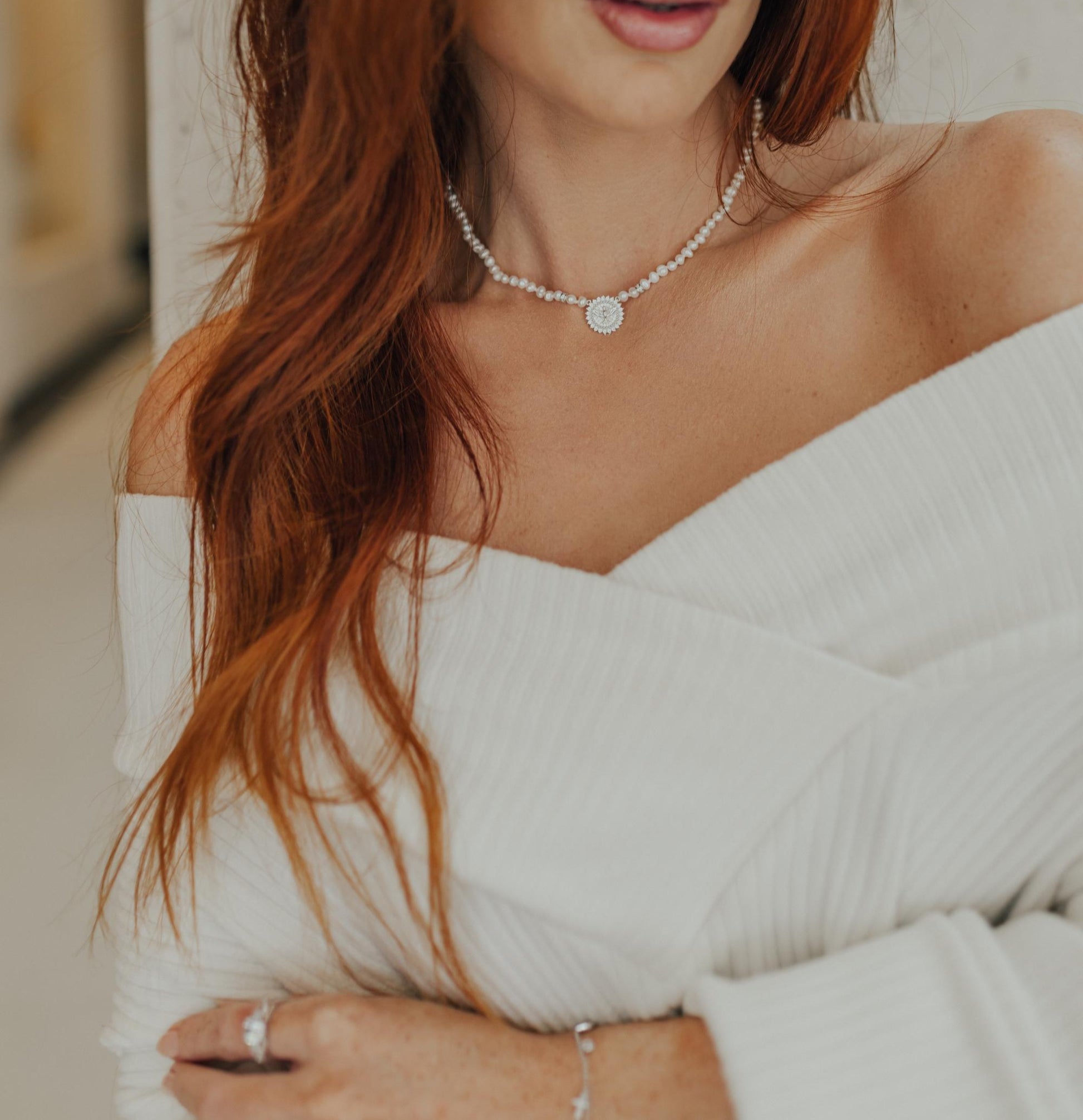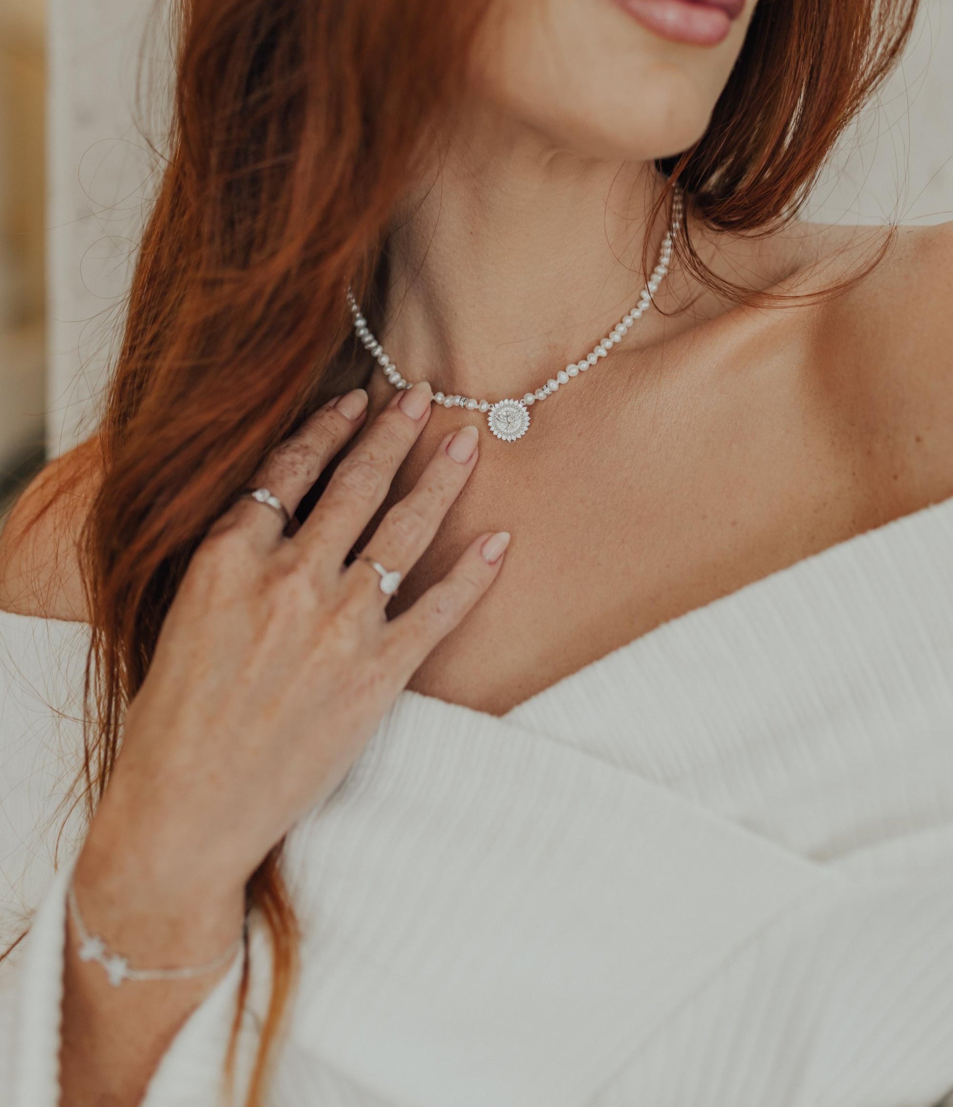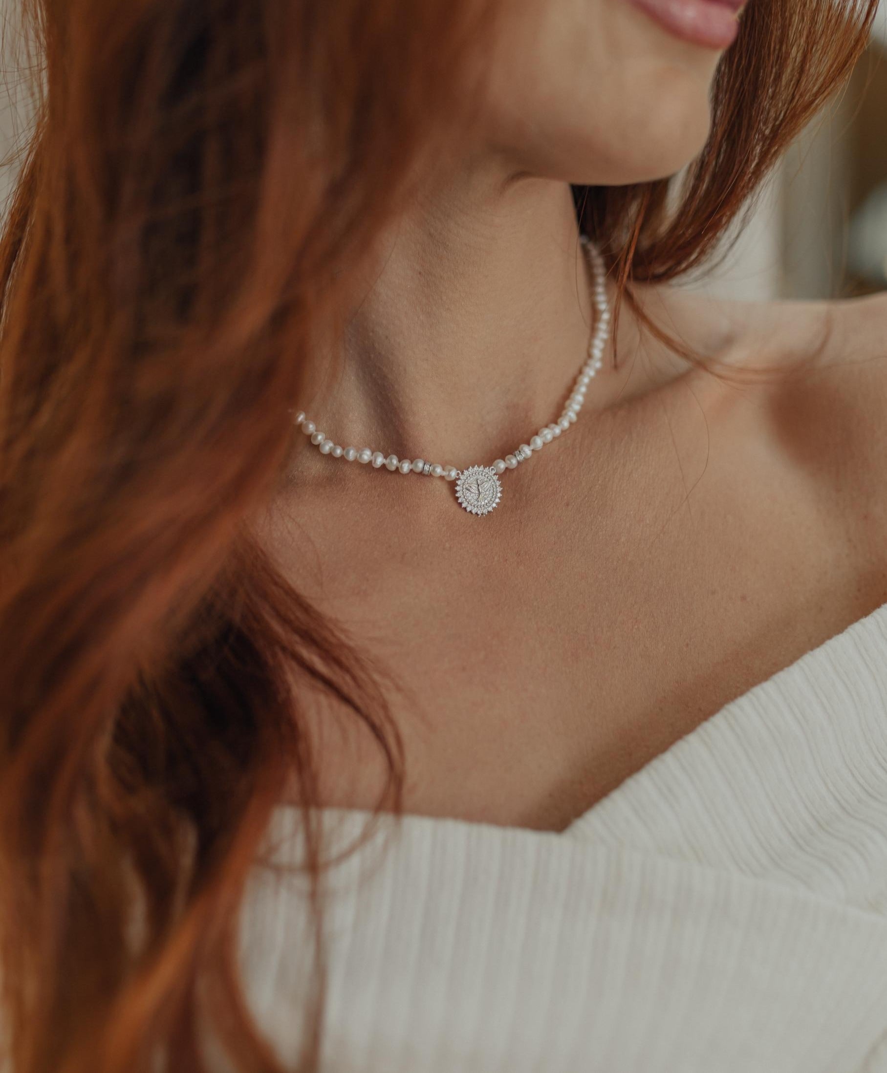 Colar com micropérolas de água doce com pingente do Divino Espírito Santo cravejado na prata 925 e banho de ródio branco.