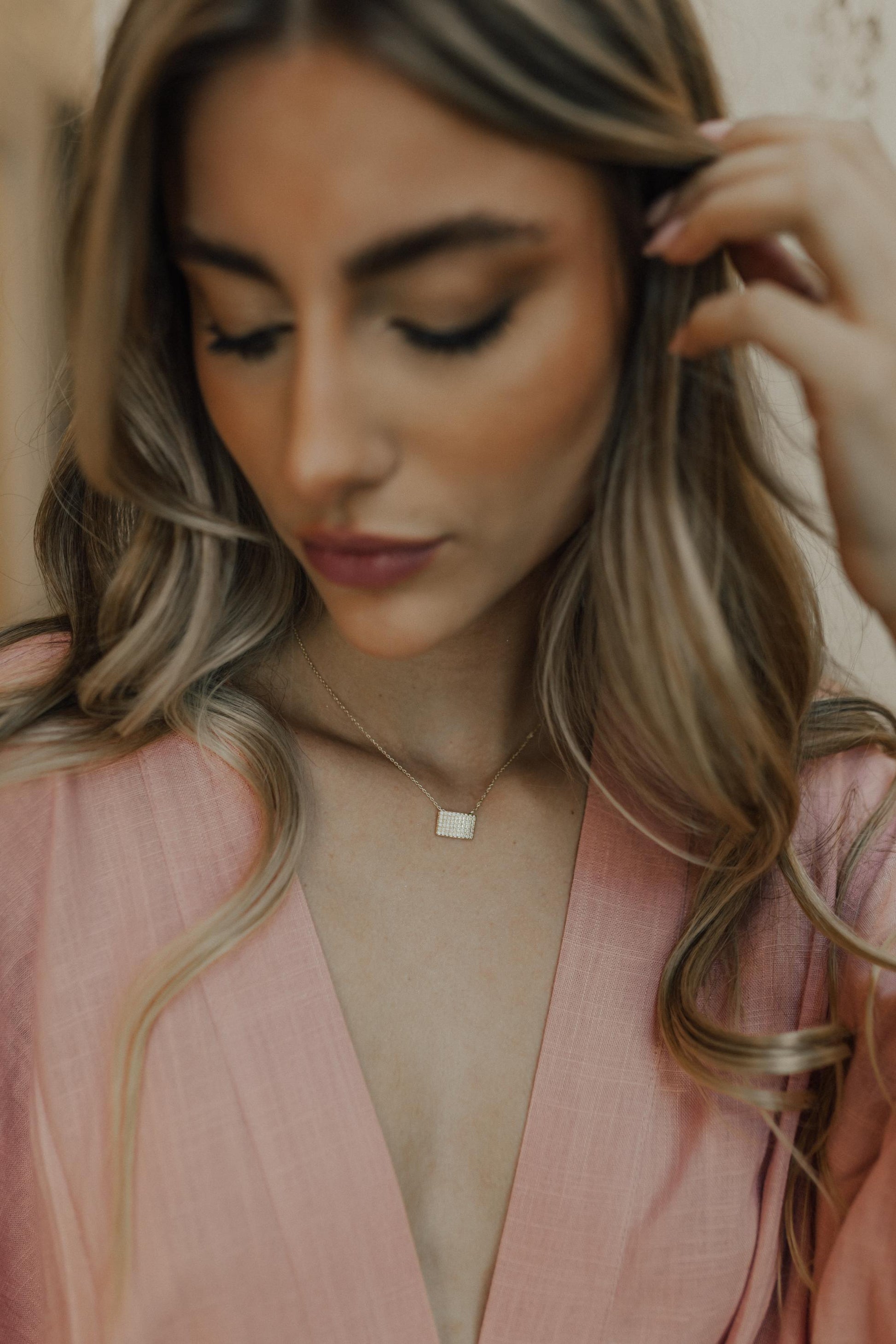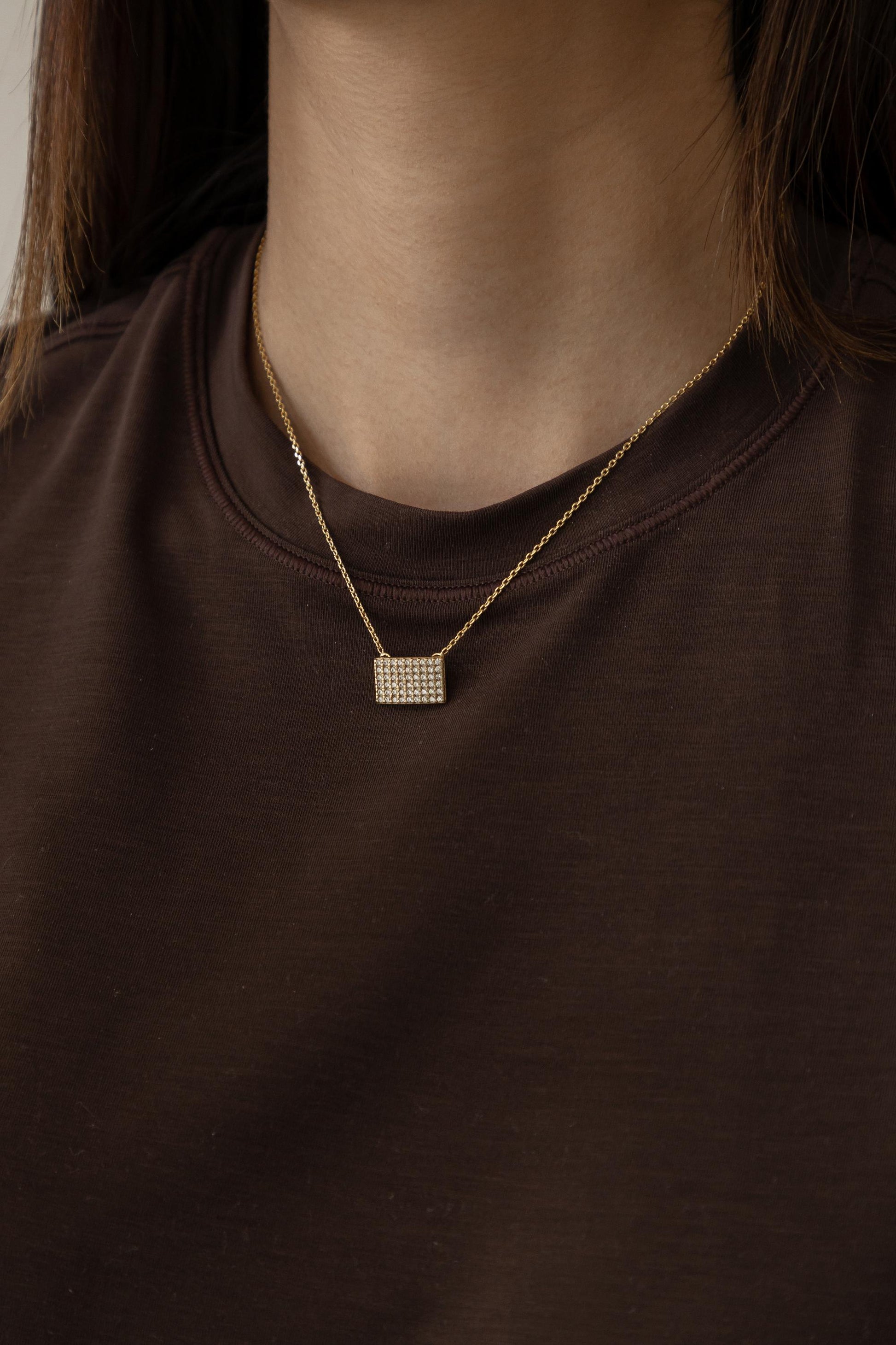 Colar com pingente retangular fixo na corrente cravejado com zircônias na cor cristal no banho de ouro 18k.