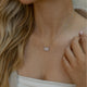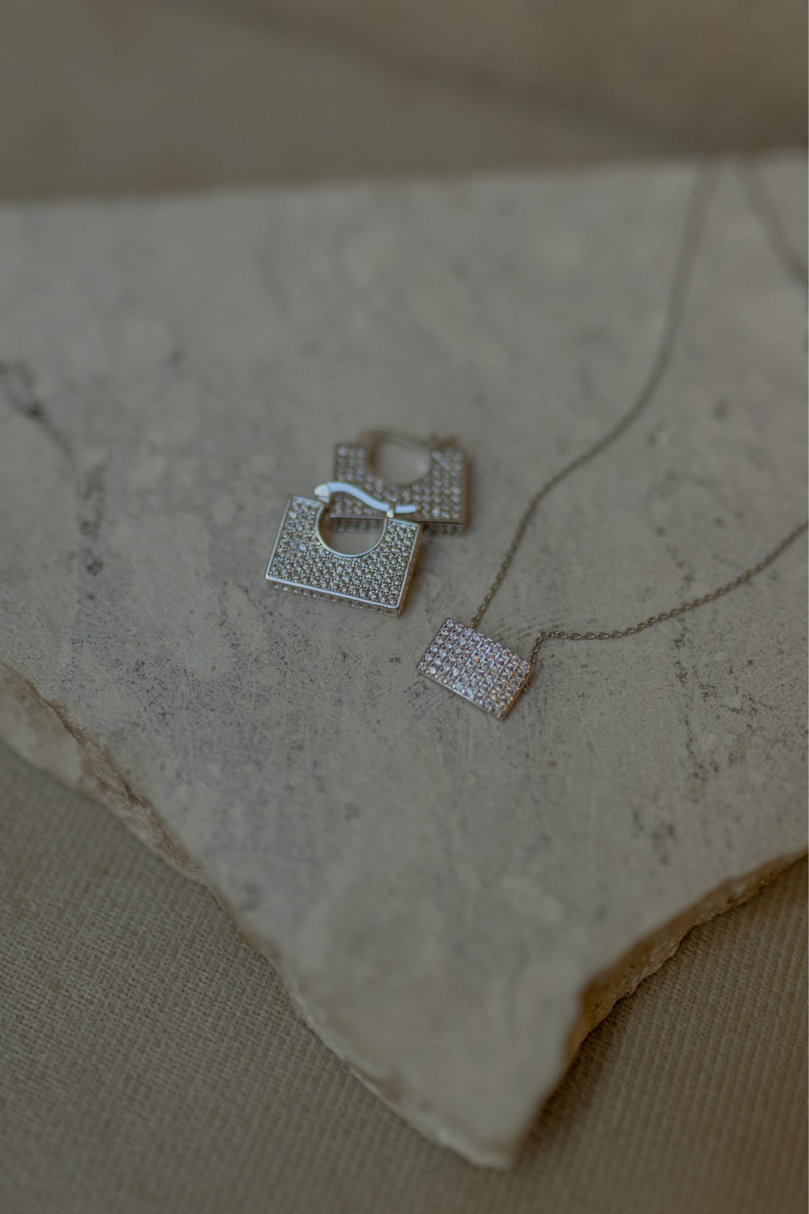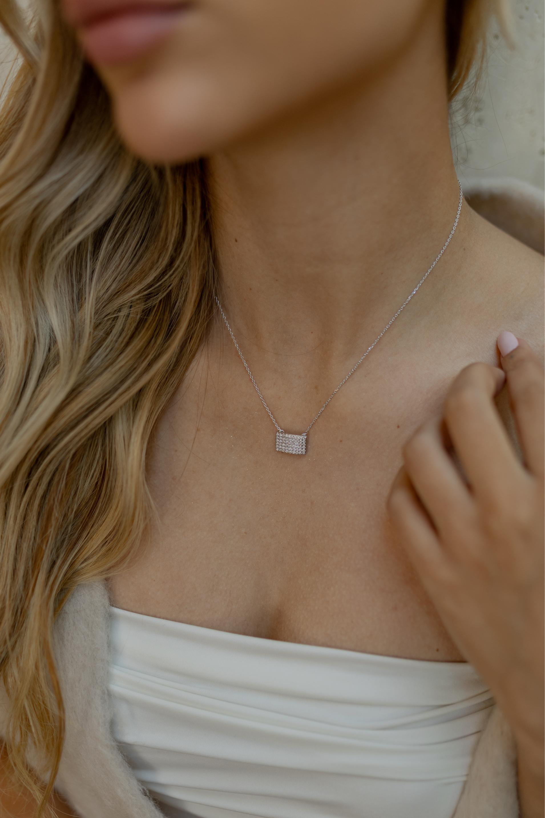 Colar com pingente retangular fixo na corrente cravejado com zircônias na cor cristal no banho de ródio branco.