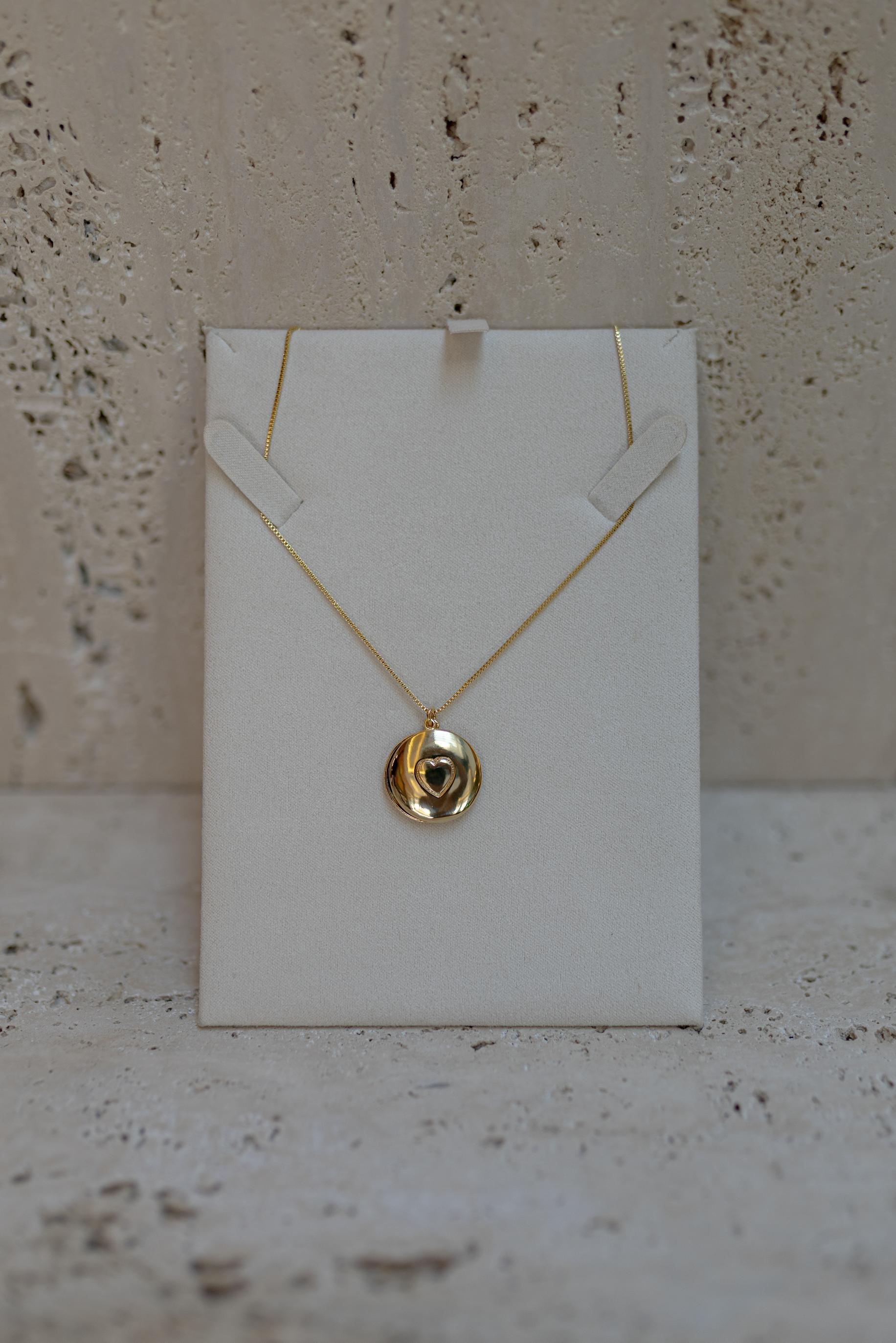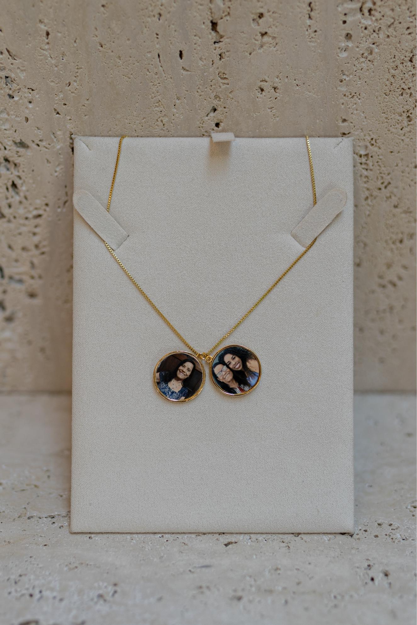 Colar relicário possui um pingente redondo com detalhe de coração, com espaço para colocar 2 fotos no banho de ouro 18k.